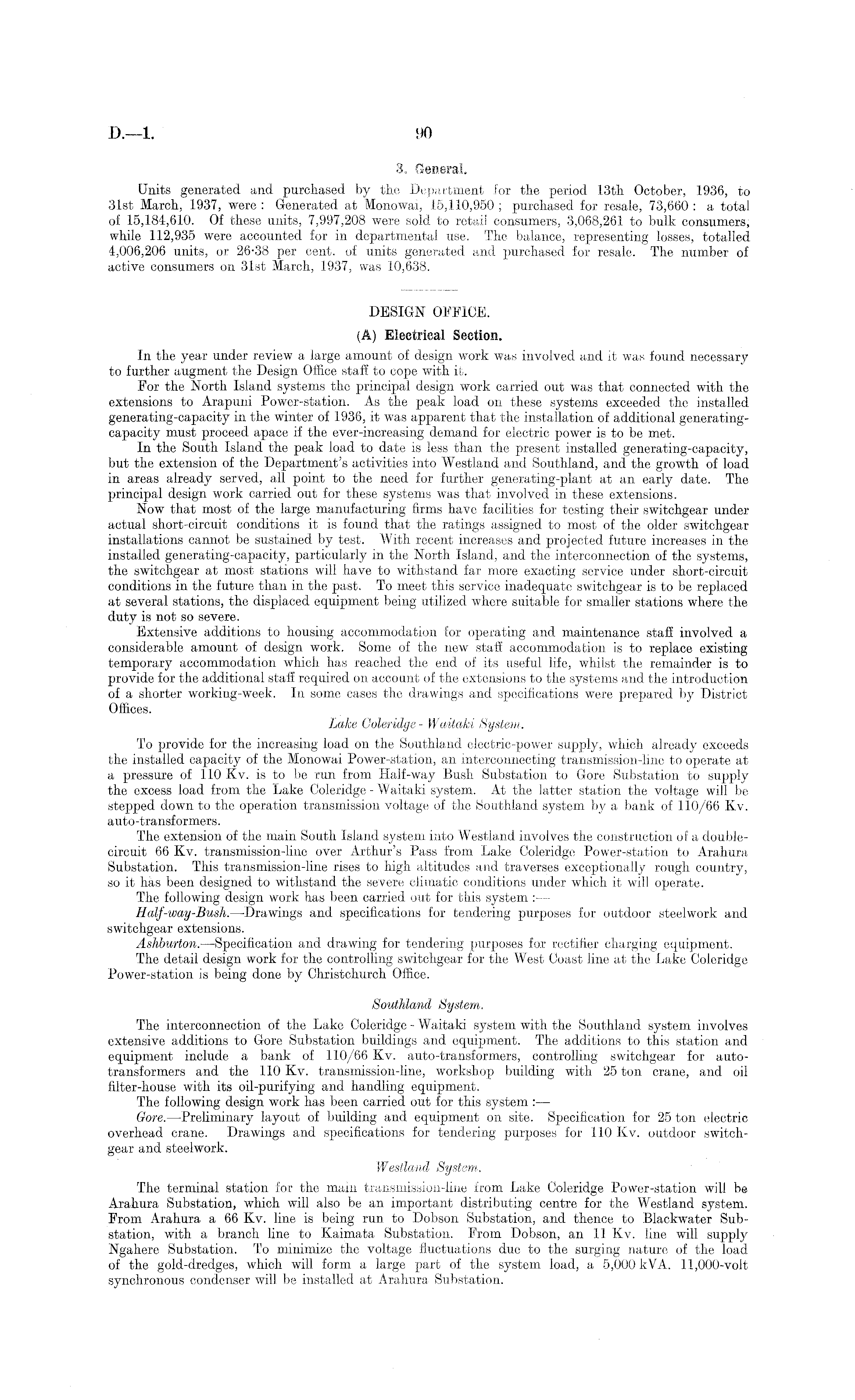 DESIGN OFFICE. (A) Electrical Section. In the year under review a large amount of design work was involved and it was found necessary to further augment the Design Office staff to cope with it. For the North Island systems the principal design work carried out was that connected with the extensions to Arapuni Power-station. As the peak load on these systems exceeded the installed generating-capacity in the winter of 1936, it was apparent that the installation of additional generatingcapacity must proceed apace if the ever-increasing demand for electric power is to be met. In the South Island the peak load to date is less than the present installed generating-capacity, but the extension of the Department's activities into Westland and Southland, and the growth of load in areas already served, all point to the need for further generating-plant at an early date. The principal design work carried out for these systems was that involved in these extensions. Now that most of the large manufacturing firms have facilities for testing their switchgear under actual short-circuit conditions it is found that the ratings assigned to most of the older switchgear installations cannot be sustained by test. With recent increases and projected future increases in the installed generating-capacity, particularly in the North Island, and the interconnection of the systems, the switchgear at most stations will have to withstand far more exacting service under short-circuit conditions in the future than in the past. To meet this service inadequate switchgear is to be replaced at several stations, the displaced equipment being utilized where suitable for smaller stations where the duty is not so severe. Extensive additions to housing accommodation for operating and maintenance staff involved a considerable amount of design work. Some of the new staff accommodation is to replace existing temporary accommodation which has reached the end of its useful life, whilst the remainder is to provide for the additional staff required on account of the extensions to the systems and the introduction of a shorter working-week. In some oases the drawings and specifications were prepared by District Offices. Lake Coleridge - Waitaki System. To provide for the increasing load on the Southland electric-power supply, which already exceeds the installed capacity of the Monowai Power-station, an interconnecting transmission-line to operate at a pressure of 110 Kv. is to be run from Half-way Bush Substation to Gore Substation to supply the excess load from the Lake Coleridge - Waitaki system. At the latter station the voltage will be stepped down to the operation transmission voltage of the Southland system by a bank of 110/66 Kv. auto-transformers. The extension of the main South Island system into Westland involves the construction of a doublecircuit 66 Kv. transmission-line over Arthur's Pass from Lake Coleridge Power-station to Arahura Substation. This transmission-line rises to high altitudes and traverses exceptionally rough country, so it has been designed to withstand the severe climatic conditions under which it will operate. The following design work has been carried out for this system : — Half-way-Bush. —Drawings and specifications for tendering purposes for outdoor steelwork and switchgear extensions. Ashburton. —Specification and drawing for tendering purposes for rectifier charging equipment. The detail design work for the controlling switchgear for the West Coast line at the Lake Coleridge Power-station is being done by Christchurch Office. Southland System. The interconnection of the Lake Coleridge - Waitaki system with the Southland system involves extensive additions to Gore Substation buildings and equipment. The additions to this station and equipment include a bank of 110/66 Kv. auto-transformers, controlling switchgear for autotransformers and the 110 Kv. transmission-line, workshop building with 25 ton crane, and oil filter-house with its oil-purifying and handling equipment. The following design work has been carried out for this system : —■ Gore. —Preliminary layout of building and equipment on site. Specification for 25 ton electric overhead crane. Drawings and specifications for tendering purposes for 110 Kv. outdoor switchgear and steelwork. Westland System. The terminal station for the main transmission-line from Lake Coleridge Power-station will be Arahura Substation, which will also be an important distributing centre for the Westland system. From Arahura a 66 Kv. line is being run to Dobson Substation, and thence to Blackwater Substation, with a branch line to Kaimata Substation. From Dobson, an 11 Kv. line will supply Ngahere Substation. To minimize the voltage fluctuations due to the surging nature of the load of the gold-dredges, which will form a large part of the system load, a 5,000 kVA. 11,000-volt synchronous condenser will be installed at Arahura Substation.