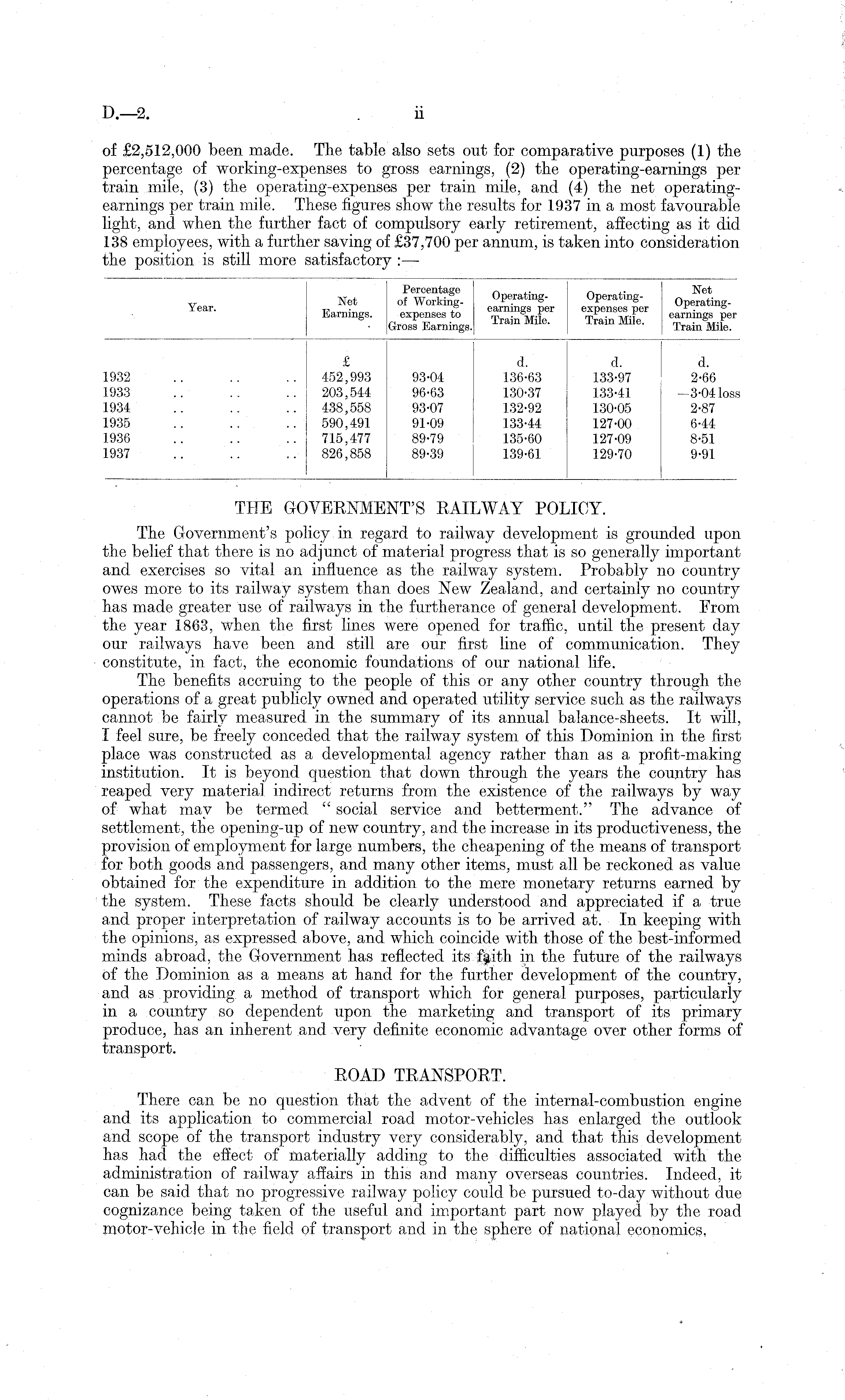 THE GOVERNMENT'S RAILWAY POLICY. The Government's policy in regard to railway development is grounded upon the belief that there is no adjunct of material progress that is so generally important and exercises so vital an influence as the railway system. Probably no country owes more to its railway system than does New Zealand, and certainly no country has made greater use of railways in the furtherance of general development. From the year 1863, when the first lines were opened for traffic, until the present day our railways have been and still are our first line of communication. They constitute, in fact, the economic foundations of our national life. The benefits accruing to the people of this or any other country through the operations of a great publicly owned and operated utility service such as the railways cannot be fairly measured in the summary of its annual balance-sheets. It will, I feel sure, be freely conceded that the railway system of this Dominion in the first place was constructed as a developmental agency rather than as a profit-making institution. It is beyond question that down through the years the country has reaped very material indirect returns from the existence of the railways by way of what may be termed " social service and betterment." The advance of settlement, the opening-up of new country, and the increase in its productiveness, the provision of employment for large numbers, the cheapening of the means of transport for both goods and passengers, and many other items, must all be reckoned as value obtained for the expenditure in addition to the mere monetary returns earned by the system. These facts should be clearly understood and appreciated if a true and proper interpretation of railway accounts is to be arrived at. In keeping with the opinions, as expressed above, and which coincide with those of the best-informed minds abroad, the Government has reflected its f|ith in the future of the railways of the Dominion as a means at hand for the further development of the country, and as providing a method of transport which for general purposes, particularly in a country so dependent upon the marketing and transport of its primary produce, has an inherent and very definite economic advantage over other forms of transport. ROAD TRANSPORT. There can be no question that the advent of the internal-combustion engine and its application to commercial road motor-vehicles has enlarged the outlook and scope of the transport industry very considerably, and that this development has had the effect of materially adding to the difficulties associated with the administration of railway affairs in this and many overseas countries. Indeed, it can be said that no progressive railway policy could be pursued to-day without due cognizance being taken of the useful and important part now played by the road motor-vehicle in the field of transport and in the sphere of national economics,