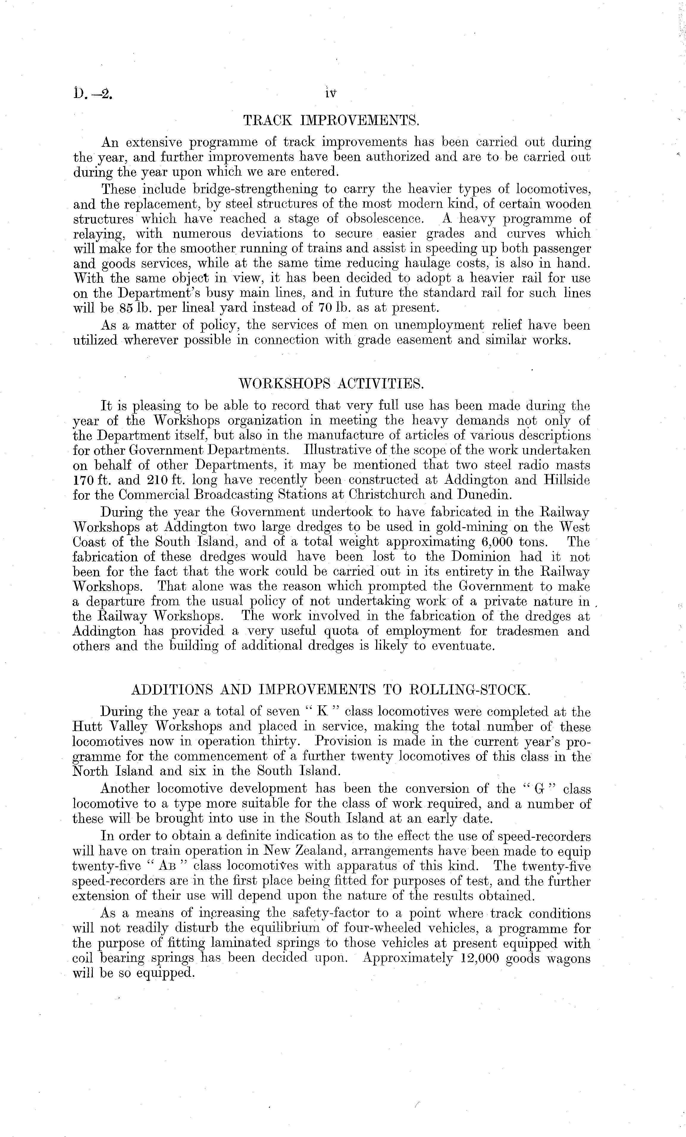 TRACK IMPROVEMENTS. An extensive programme of track improvements has been carried out during the year, and further improvements have been authorized and are to be carried out during the year upon which we are entered. These include bridge-strengthening to carry the heavier types of locomotives, and the replacement, by steel structures of the most modern kind, of certain wooden structures which have reached a stage of obsolescence. A heavy programme of relaying, with numerous deviations to secure easier grades and curves which will make for the smoother running of trains and assist in speeding up both passenger and goods services, while at the same time reducing haulage costs, is also in hand. With the same object in view, it has been decided to adopt a heavier rail for use on the Department's busy main lines, and in future the standard rail for such lines will be 85 lb. per lineal yard instead of 70 lb. as at present. As a matter of policy, the services of men on unemployment relief have been utilized wherever possible in connection with grade easement and similar works. WORKSHOPS ACTIVITIES. It is pleasing to be able to record that very full use has been made during the year of the Workshops organization in meeting the heavy demands not only of the Department itself, but also in the manufacture of articles of various descriptions for other Government Departments. Illustrative of the scope of the work undertaken on behalf of other Departments, it may be mentioned that two steel radio masts 170 ft. and 210 ft. long have recently been constructed at Addington and Hillside for the Commercial Broadcasting Stations at Christchurch and Dunedin. During the year the Government undertook to have fabricated in the Railway Workshops at Addington two large dredges to be used in gold-mining on the West Coast of the South Island, and of a total weight approximating 6,000 tons. The fabrication of these dredges would have been lost to the Dominion had it not been for the fact that the work could be carried out in its entirety in the Railway Workshops. That alone was the reason which prompted the Government to make a departure from the usual policy of not undertaking work of a private nature m the Railway Workshops. The work involved in the fabrication of the dredges at Addington has provided a very useful quota of employment for tradesmen and others and the building of additional dredges is likely to eventuate. ADDITIONS AND IMPROVEMENTS TO ROLLING-STOCK. During the year a total of seven " K " class locomotives were completed at the Hutt Valley Workshops and placed in service, making the total number of these locomotives now in operation thirty. Provision is made in the current year's programme for the commencement of a further twenty locomotives of this class in the North Island and six in the South Island. Another locomotive development has been the conversion of the " G " class locomotive to a type more suitable for the class of work required, and a number of these will be brought into use in the South Island at an early date. In order to obtain a definite indication as to the effect the use of speed-recorders will have on train operation in New Zealand, arrangements have been made to equip twenty-five "Ab " class locomotives with apparatus of this kind. The twenty-five speed-recorders are in the first place being fitted for purposes of test, and the further extension of their use will depend upon the nature of the results obtained. As a means of increasing the safety-factor to a point where track conditions will not readily disturb the equilibrium of four-wheeled vehicles, a programme for the purpose of fitting laminated springs to those vehicles at present equipped with coil bearing springs has been decided upon. Approximately 12,000 goods wagons will be so equipped.