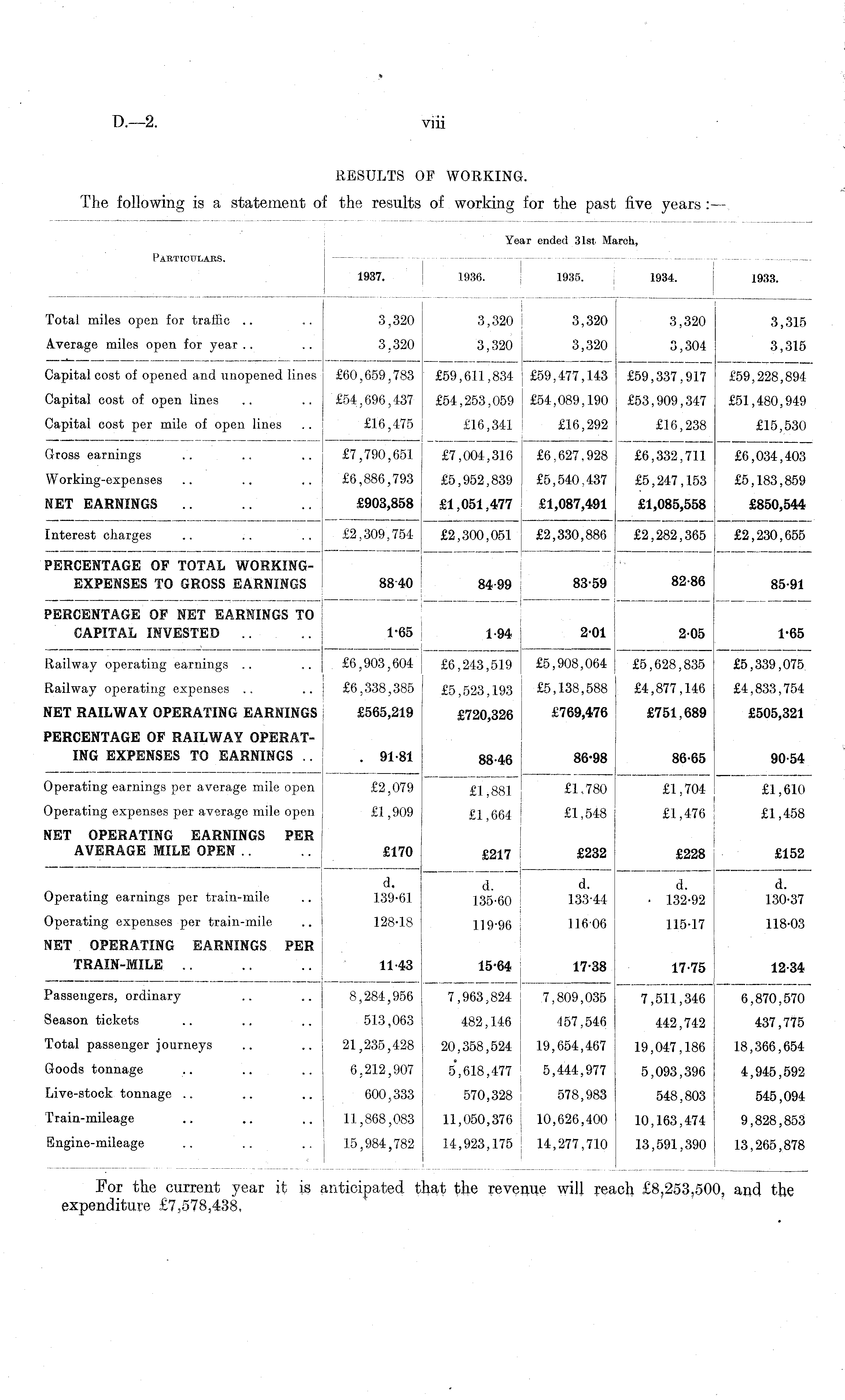 Year ended 31st March, Particulars. —r 1937. 1936. 1935. 1934. 1933. Total miles open for traffic .. .. 3,320 3,320 3,320 3,320 3,315 Average miles open for year.. .. 3.320 3,320 3,320 3,304 3,315 Capital cost of opened and unopened lines £60,659,783 £59,611,834 £59,477,143 £59,337,917 £59,228,894Capital cost of open lines .. .. £54,696,437 £54,253,059 i £54,089,190 £53,909,347 £51,480,949 Capital cost per mile of open lines .. £16,475 £16,341 £16,292 £16,238 £15,530 Gross earnings .. .. .. £7,790,651 £7,004,316 £6,627,928 £6,332,711 £6,034,403 Working-expenses .. .. .. £6,886,793 £5,952,839 £5,540,437 £5,247,153 £5,183,859 NET EARNINGS .. .. £903,858 £1,051,477 £1,087,491 £1,085,558 £850,544 Interest charges .. .. .. £2,309,754 £2,300,051 £2,330,886 £2,282,365 £2,230,655 PERCENTAGE OF TOTAL WORKINGEXPENSES TO GROSS EARNINGS 88 40 84-99 83-59 82-86 85-91 PERCENTAGE OF NET EARNINGS TO CAPITAL INVESTED .. 1-65 1-94 2-01 2-05 1-65 Railway operating earnings .. .. £6,903,604 : £6,243,519 £5,908,064 £5,628,835 £5,339,075 Railway operating expenses .. .. i £6,338,385 £5,523,193 £5,138,588 £4,877,146 £4,833,754 NET RAILWAY OPERATING EARNINGS £565,219 £720,326' £769,476 £751,689 £505,321 PERCENTAGE OF RAILWAY OPERATING EXPENSES TO EARNINGS .. . 91-81 88-46 86-98 86-65 90-54 Operating earnings per average mile open £2,079 £1,881 £1,780 £1,704 £1,610 Operating expenses per average mile open £1,909 £1,664 £1,548 £1,476 £1,458 NET OPERATING EARNINGS PER AVERAGE MILE OPEN ., .. £170 £217 £232 £228 £152 d. d. d. d. d. Operating earnings per train-mile .. I 139-61 135-60 133-44 ■ 132-92 130-37 Operating expenses per train-mile .. I 128-18 119-96 116 06 115-17 118-03 NET OPERATING EARNINGS PER TRAIN-MILE .. .. .. 11-43 15*64 17-38 17-75 12-34 Passengers, ordinary .. .. 8,284,956 7,963,824 7,809,035 7,511,346 6,870,570 Season tickets .. .. .. 513,063 482,146 457,546 442,742 437,775 Total passenger journeys .. .. 21,235,428 20,358,524 19,654,467 19,047,186 18,366,654 Goods tonnage .. .. .. 6,212,907 5*,618,477 5,444,977 5,093,396 4,945,592 Live-stock tonnage .. .. .. 600,333 570,328 I 578,983 548,803 545,094 Train-mileage .. .. .. 11,868,083 11,050,376 10,626,400 10,163,474 9,828,853 Engine-mileage .. .. .. j 15,984,782 14,923,175 ; 14,277,710 13,591,390 13,265,878
