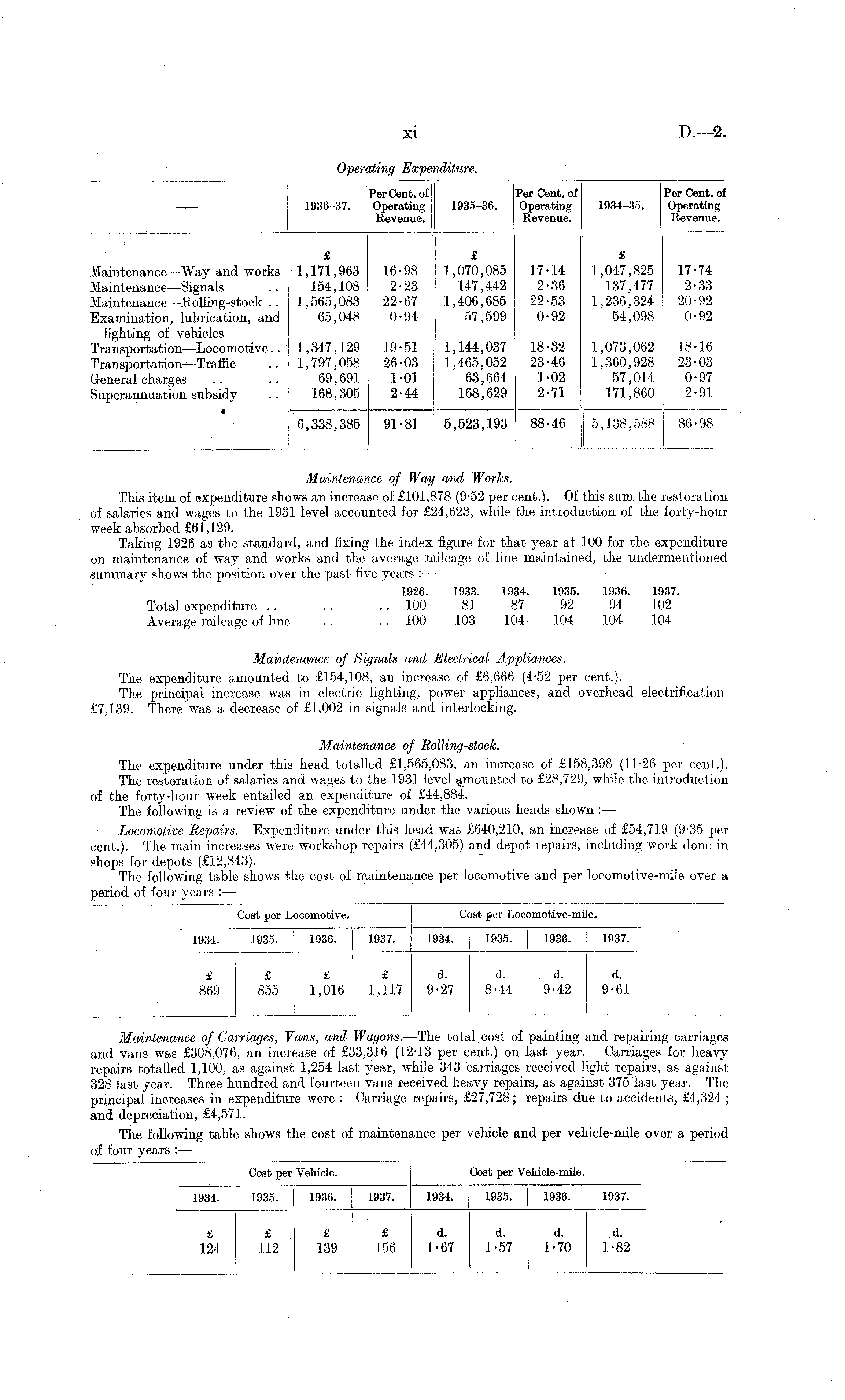 Maintenance of Way and Works. This item of expenditure shows an increase of £101,878 (9-52 per cent.). Of this sum. the restoration of salaries and wages to the 1931 level accounted for £24,623, while the introduction of the forty-hour week absorbed £61,129. Taking 1926 as the standard, and fixing the index figure for that year at 100 for the expenditure on maintenance of way and works and the average mileage of line maintained, the undermentioned summary shows the position over the past five years : — 1926. 1933. 1934. 1935. 1936. 1937. Total expenditure . . . . .. 100 81 87 92 94 102 Average mileage of line .. .. 100 103 .104 104 104 104 Maintenance of Signals and Electrical Appliances. The expenditure amounted to £154,108, an increase of £6,666 (4-52 per cent.). The principal increase was in electric lighting, power appliances, and overhead electrification £7,139. There was a decrease of £1,002 in signals and interlocking. Maintenance of Rolling-stock. The expenditure under this head totalled £1,565,083, an increase of £158,398 (11-26 per cent.). The restoration of salaries and wages to the 1931 level amounted to £28,729, while the introduction of the forty-hour week entailed an expenditure of £44,884. The following is a review of the expenditure under the various heads shown : — Locomotive Repairs. —Expenditure under this head was £640,210, an increase of £54,719 (9-35 per cent.). The main increases were workshop repairs (£44,305) and depot repairs, including work done in shops for depots (£12,843). The following table shows the cost of maintenance per locomotive and per locomotive-mile over a period of four years : —