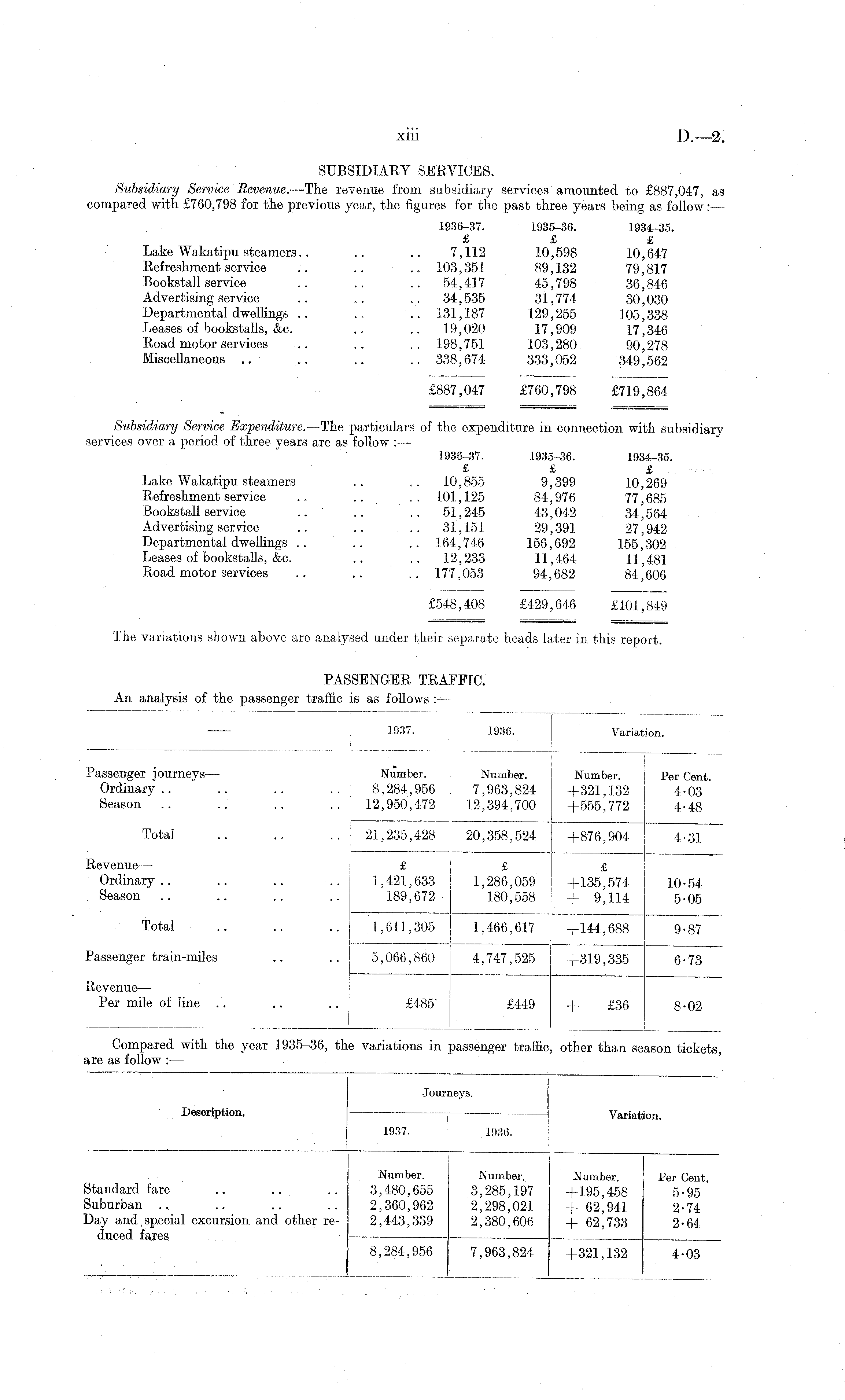 SUBSIDIARY SERVICES. Subsidiary Service Revenue.—The revenue from subsidiary services amounted to £887,047, as compared with £760,798 for the previous year, the figures for the past three years being as follow: — 1936-37. 1935-36. 1934-35. £ £ £ Lake Wakatipu steamers.. .. .. 7,112 10,598 10,647 Refreshment service .. .. .. 103,351 89,132 79,817 Bookstall service .. .. .. 54,417 45,798 36,846 Advertising service .. .. .. 34,535 31,774 30,030 Departmental dwellings .. .. .. 131,187 129,255 105,338 Leases of bookstalls, &c. .. .. 19,020 17,909 17,346 Road motor services .. .. .. 198,751 103,280 90,278 Miscellaneous .. .. .. .. 338,674 333,052 349,562 £887,047 £760,798 £719,864 # " ————— Subsidiary Service Expenditure.—The particulars of the expenditure in connection with subsidiary services over a period of three years are as follow :— 1936-37. 1935-36. 1934-3.5. £ £ £ Lake Wakatipu steamers .. .. 10,855 9,399 10,269 Refreshment service .. .. .. 101,125 84,976 77,685 Bookstall service .. .. .. 51,245 43,042 34,564 Advertising service .. .. .. 31,151 29,391 27,942 Departmental dwellings .. .. .. 164,746 156,692 155,302 Leases of bookstalls, &c. .. .. 12,233 11,464 11,481 Road motor services .. .. .. 177,053 94,682 84'606 £548,408 £429,646 £401,849 The variations shown above are analysed under their separate heads later in this report. PASSENGER TRAFFIC. An analysis of the passenger traffic is as follows :—