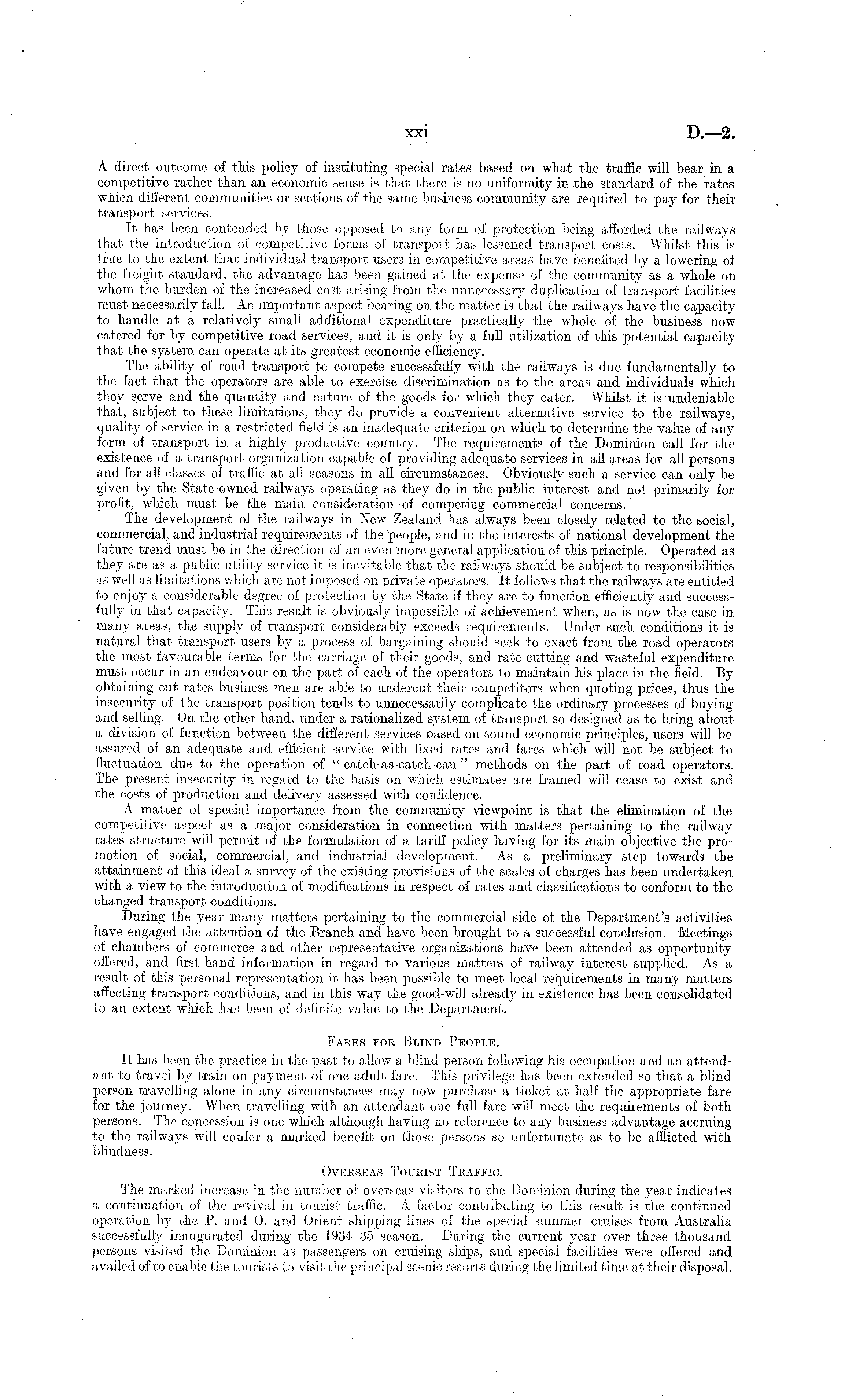 A direct outcome of this policy of instituting special rates based on what the traffic will bear in a competitive rather than an economic sense is that there is no uniformity in the standard of the rates which different communities or sections of the same business community are required to pay for their transport services. It has been contended by those opposed to any form of protection being afforded the railways that the introduction of competitive forms of transport has lessened transport costs. Whilst this is true to the extent that individual transport users in competitive areas have benefited by a lowering of the freight standard, the advantage has been gained at the expense of the community as a whole on whom the burden of the increased cost arising from the unnecessary duplication of transport facilities must necessarily fall. An important aspect bearing on the matter is that the railways have the capacity to handle at a relatively small additional expenditure practically the whole of the business now catered for by competitive road services, and it is only by a full utilization of this potential capacity that the system can operate at its greatest economic efficiency. The ability of road transport to compete successfully with the railways is due fundamentally to the fact that the operators are able to exercise discrimination as to the areas and individuals which they serve and the quantity and nature of the goods for which they cater. Whilst it is undeniable that, subject to these limitations, they do provide a convenient alternative service to the railways, quality of service in a restricted field is an inadequate criterion on which to determine the value of any form of transport in a highly productive country. The requirements of the Dominion call for the existence of ā transport organization capable of providing adequate services in all areas for all persons and for all classes of traffic at all seasons in all circumstances. Obviously such a service can only be given by the State-owned railways operating as they do in the public interest and not primarily for profit, which must be the main consideration of competing commercial concerns. The development of the railways in New Zealand has always been closely related to the social, commercial, and industrial requirements of the people, and in the interests of national development the future trend must be in the direction of an even more general application of this principle. Operated as they are as a public utility service it is inevitable that the railways should be subject to responsibilities as well as limitations which are not imposed on private operators. It follows that the railways are entitled to enjoy a considerable degree of protection by the State if they are to function efficiently and successfully in that capacity. This result is obviously impossible of achievement when, as is now the case in many areas, the supply of transport considerably exceeds requirements. Under such conditions it is natural that transport users by a process of bargaining should seek to exact from the road operators the most favourable terms for the carriage of their goods, and rate-cutting and wasteful expenditure must occur in an endeavour on the part of each of the operators to maintain his place in the field. By obtaining cut rates business men are able to undercut their competitors when quoting prices, thus the insecurity of the transport position tends to unnecessarily complicate the ordinary processes of buying and selling. On the other hand, under a rationalized system of transport so designed as to bring about a division of function between the different services based on sound economic principles, users will be assured of an adequate and efficient service with fixed rates and fares which will not be subject to fluctuation due to the operation of " cateh-as-catch-can " methods on the part of road operators. The present insecurity in regard to the basis on which estimates are framed will cease to ex-ist and the costs of production and delivery assessed with confidence. A matter of special importance from the community viewpoint is that the elimination of the competitive aspect as a major consideration in connection with matters pertaining to the railway rates structure will permit of the formulation of a tariff policy having for its main objective the promotion of social, commercial, and industrial development. As a preliminary step towards the attainment of this ideal a survey of the existing provisions of the scales of charges has been undertaken with a view to the introduction of modifications in respect of rates and classifications to conform to the changed transport conditions. During the year many matters pertaining to the commercial side of the Department's activities have engaged the attention of the Branch and have been brought to a successful conclusion. Meetings of chambers of commerce and other representative organizations have been attended as opportunity offered, and first-hand information in regard to various matters of railway interest supplied. As a result of this personal representation it has been possible to meet local requirements in many matters affecting transport conditions, and in this way the good-will already in existence has been consolidated to an extent which has been of definite value to the Department. Fares for Blind People. It has been the practice in the past to allow a blind person following his occupation and an attendant, to travel by train on payment of one adult fare. This privilege has been extended so that a blind person travelling alone in any circumstances may now purchase a ticket at half the appropriate fare for the journey. When travelling with an attendant one full fare will meet the requirements of both persons. The concession is one which although having no reference to any business advantage accruing to the railways will confer a marked benefit on those persons so unfortunate as to be
