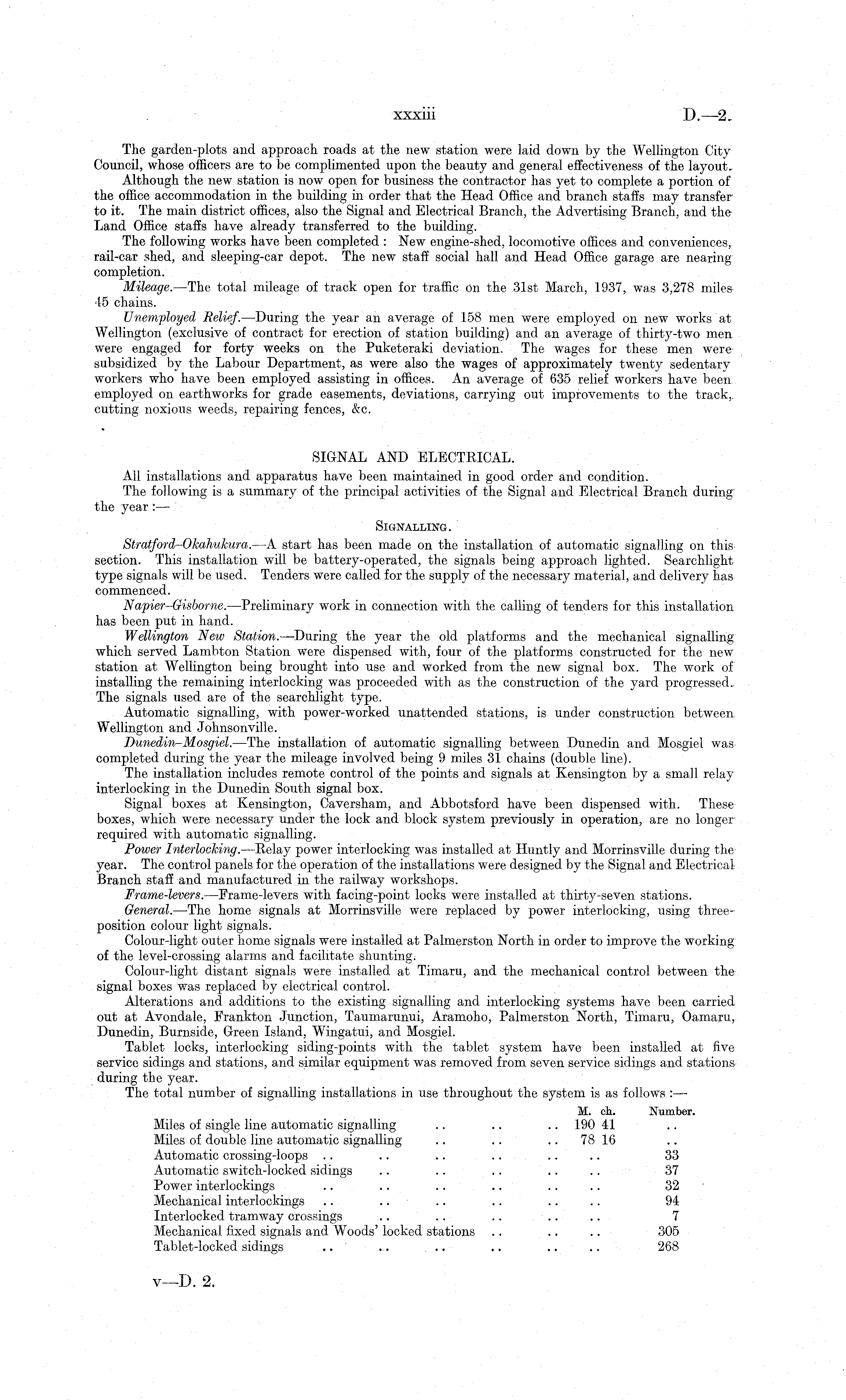 The garden-plots and approach roads at the new station were laid down by the Wellington City Council, whose officers are to be complimented upon the beauty and general effectiveness of the layout. Although the new station is now open for business the contractor has yet to complete a portion of the office accommodation in the building in order that the Head Office and branch staffs may transfer to it. The main district offices, also the Signal and Electrical Branch, the Advertising Branch, and the Land Office staffs have already transferred to the building. The following works have been completed : New engine-shed, locomotive offices and conveniences, rail-car shed, and sleeping-car depot. The new staff social hall and Head Office garage are nearing completion. Mileage. —The total mileage of track open for traffic on the 31st March, 1937, was 3,278 miles--45 chains. Unemployed Relief. —During the year an average of 158 men were employed on new works at Wellington (exclusive of contract for erection of station building) and an average of thirty-two menwere engaged for forty weeks on the Puketeraki deviation. The wages for these men were subsidized by the Labour Department, as were also the wages of approximately twenty sedentary workers who have been employed assisting in offices. An average of 635 relief workers have been employed on earthworks for grade easements, deviations, carrying out improvements to the track,, cutting noxious weeds, repairing fences, &c. SIGNAL AND ELECTRICAL. All installations and apparatus have been maintained in good order and condition. The following is a summary of the principal activities of the Signal and Electrical Branch during the year : — Signalling. Stratford-Okahukura. —A start has been made on the installation of automatic signalling on this section. This installation will be battery-operated, the signals being approach lighted. Searchlight type signals will be used. Tenders were called for the supply of the necessary material, and delivery has commenced. Napier-Gisborne.—Preliminary work in connection with the calling of tenders for this installation has been put in hand. Wellington New Station. —During the year the old platforms and the mechanical signalling which served Lambton Station were dispensed with, four of the platforms constructed for the new station at Wellington being brought into use and worked from the new signal box. The work of installing the remaining interlocking was proceeded with as the construction of the yard progressed.. The signals used are of the searchlight type. Automatic signalling, with power-worked unattended stations, is under construction between. Wellington and Johnsonville. Dunedin-Mosgiel. —The installation of automatic signalling between Dunedin and Mosgiel was completed during the year the mileage involved being 9 miles 31 chains (double line). The installation includes remote control of the points and signals at Kensington by a small relay interlocking in the Dunedin South signal box. Signal boxes at Kensington, Caversham, and Abbotsford have been dispensed with. These boxes, which were necessary under the lock and block system previously in operation, are no longer required with automatic signalling. Power Interlocking.—Relay power interlocking was installed at Huntly and Morrinsville during the year. The control panels for the operation of the installations were designed by the Signal and Electrical Branch staff and manufactured in the railway workshops. Frame-levers. —Frame-levers with facing-point locks were installed at thirty-seven stations. General. —The home signals at Morrinsville were replaced by power interlocking, using threeposition colour light signals. Colour-light outer home signals were installed at Palmerston North in order to improve the working of the level-crossing alarms and facilitate shunting. Colour-light distant signals were installed at Timaru, and the mechanical control between the signal boxes was replaced by electrical control. Alterations and additions to the existing signalling and interlocking systems have been carried out at Avondale, Frankton Junction, Taumarunui, Aramoho, Palmerston North, Timaru, Oamaru, Dunedin, Burnside, Green Island, Wingatui, and Mosgiel. Tablet locks, interlocking siding-points with the tablet system have been installed at five service sidings and stations, and similar equipment was removed from seven service sidings and stations during the year. The total number of signalling installations in use throughout the system is as follows : — M. eh. Number. Miles of single line automatic signalling .. .. .. 190 41 Miles of double line automatic signalling .. .. .. 7816 Automatic crossing-loops .. .. .. .. .. .. 33 Automatic switch-locked sidings .. .. .. .. .. 37 Power interlockings .. .. .. .. .. .. 32 Mechanical interlockings .. .. .. .. .. .. 94 Interlocked tramway crossings .. .. .. .. .. 7 Mechanical fixed signals and Woods' locked stations .. .. .. 305 Tablet-locked sidings .. .. .. .. .. .. 268 v—D. 2.