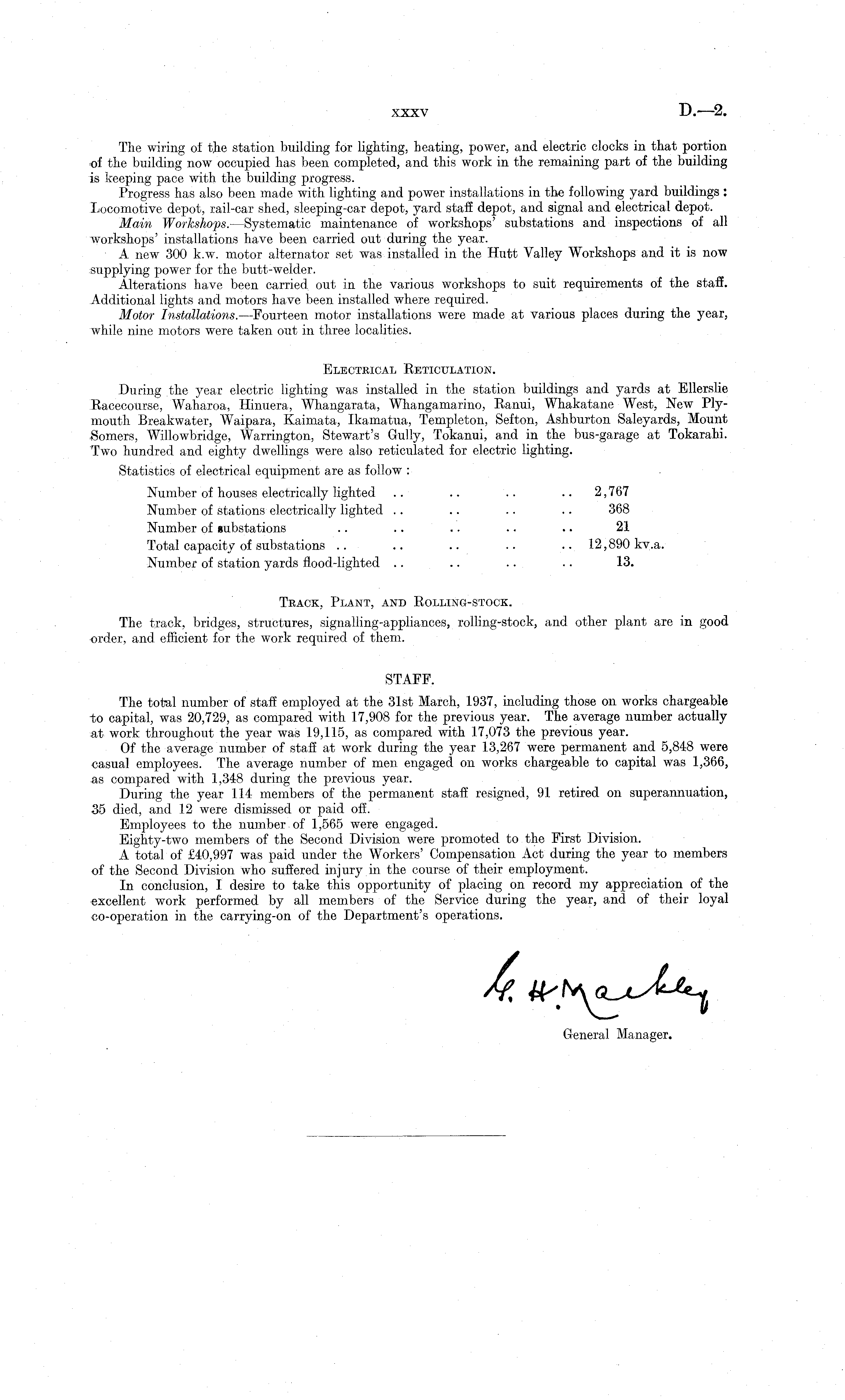 The wiring of the station building for lighting, heating, power, and electric clocks in that portion of the building now occupied has been completed, and this work in the remaining part of the building is keeping pace with the building progress. Progress has also been made with lighting and power installations in the following yard buildings : Locomotive depot, rail-car shed, sleeping-car depot, yard staff depot, and signal and electrical depot. Main Workshops.—Systematic maintenance of workshops' substations and inspections of all workshops' installations have been carried out during the year. A new 300 k.w. motor alternator set was installed in the Hutt Valley Workshops and it is now supplying power for the butt-welder. Alterations have been carried out in the various workshops to suit requirements of the staff. Additional lights and motors have been installed where required. Motor Installations. —Fourteen motor installations were made at various places during the year, while nine motors were taken out in three localities. Electrical Reticulation. During the year electric lighting was installed in the station buildings and yards at Ellerslie Racecourse, Waharoa, Hinuera, Whangarata, Whangamarino, Ranui, Whakatane West, New Plymouth Breakwater, Waipara, Kaimata, Ikamatua, Templeton, Sefton, Ashburton Saleyards, Mount Somers, Willowbridge, Warrington, Stewart's Gully, Tokanui, and in the bus-garage at Tokarahi. Two hundred and eighty dwellings were also reticulated for electric lighting. Statistics of electrical equipment are as follow : Number of houses electrically lighted .. .. .. .. 2,767 Number of stations electrically lighted .. .. .. .. 368 Number of substations .. .. .. .. .. 21 Total capacity of substations .. .. .. .. .. 12,890 kv.a. Number of station yards flood-lighted .. .. .. .. 13. Track, Plant, and Rolling-stock. The track, bridges, structures, signalling-appliances, rolling-stock, and other plant are in good order, and efficient for the work required of them. STAFF. The total number of staff employed at the 31st March, 1937, including those on works chargeable to capital, was 20,729, as compared with 17,908 for the previous year. The average number actually at work throughout the year was 19,115, as compared with 17,073 the previous year. Of the average number of staff at work during the year 13,267 were permanent and 5,848 were casual employees. The average number of men engaged on works chargeable to capital was 1,366, as compared with 1,348 during the previous year. During the year 114 members of the permanent staff resigned, 91 retired on superannuation, 35 died, and 12 were dismissed or paid off. Employees to the number of 1,565 were engaged. Eighty-two members of the Second Division were promoted to the First Division. A total of £40,997 was paid under the Workers' Compensation Act during the year to members of the Second Division who suffered injury in the course of their employment. In conclusion, I desire to take this opportunity of placing on record my appreciation of the excellent work performed by all members of the Service during the year, and of their loyal co-operation in the carrying-on of the Department's operations. General Manager.