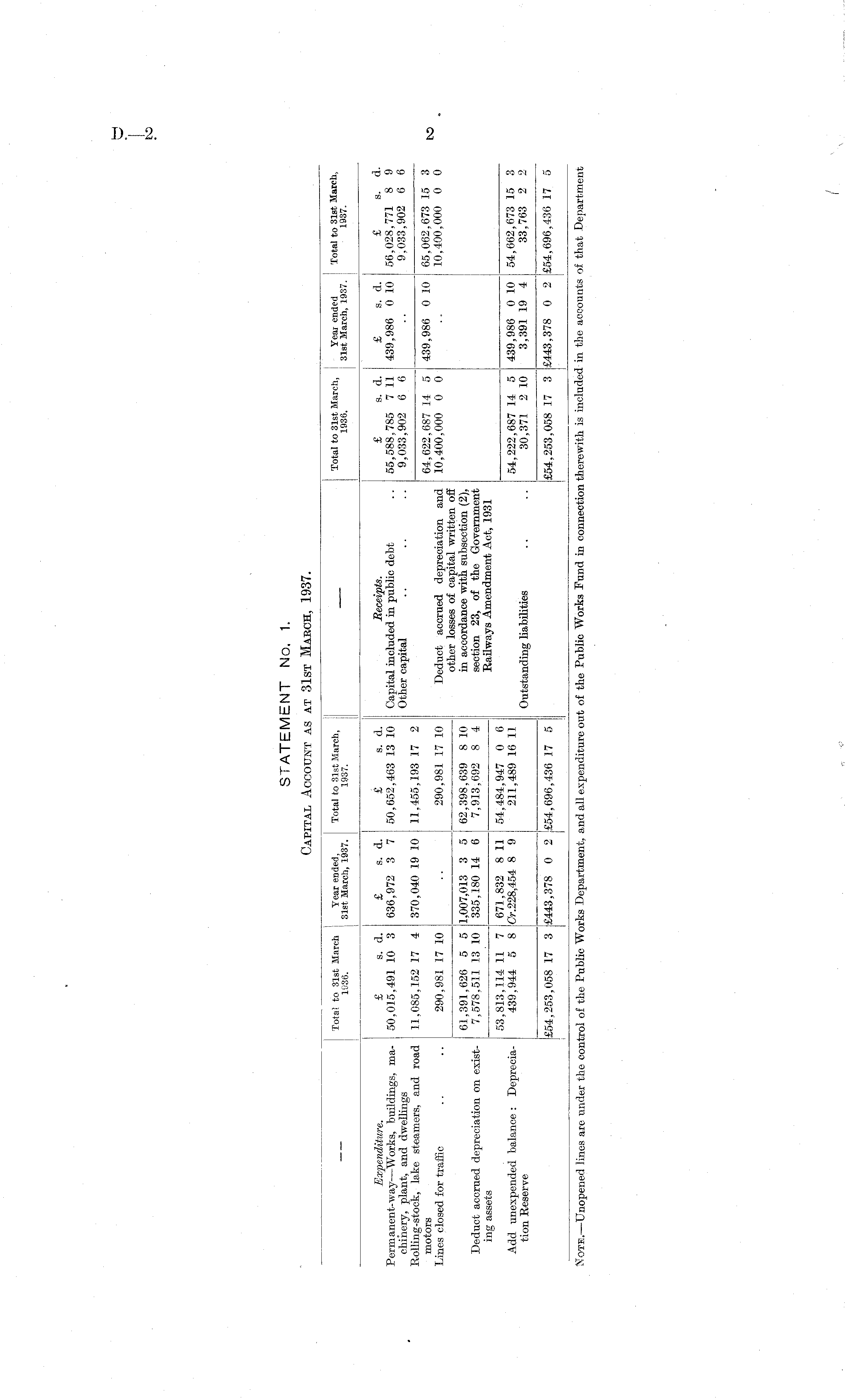 Total to 31st March i Year ended, I Total to 31st March, | i Total to 31st March, ! Year ended I Total to 31st March, ! 1988. I 31st, March, 1937. 1937. II j 1936. i 31st, March, 1937. | 1937. , 1; 4/i % p 1 I W 18 f II ■■a I i L I Expenditure. £ s. d. £ s. d. £ s. d. Receipts. £ s. d. £ s. d. £ s. d. Permanent-way— Works, buildings, ma- 50,015,491 10 3 636,972 3 7 50,652,463 13 10 Capital included in public debt .. 55,588,785 7 11 439,986 0 10 56,028,771 8 9 chinery, plant, and dwellings Other capital .. .. .. 9,033,902 6 6 .. 9,033,902 6 6 Rolling-stock, lake steamers, and road 11,085,152 17 4 370,040 19 10 11,455,193 17 2 motors 64,622,687 14 5 439,986 0 10 65,062,673 15 3 Lines closed for traffic .. .. 290,981 17 10 .. 290,981 17 10 Deduct accrued depreciation and 10,400,000 0 0 .. 10,400,000 0 0 other losses of capital written off 61,391,626 5 5 1,007,013 3 5 62,398,639 8 10 in accordance with subsection (2), Deduct accrued depreciation on exist- 7,578,511 13 10 335,180 14 6 7,913,692 8 4 section 23, of the Government ing assets Railways Amendment Act, 1931 53,813,114 11 7 671,832 8 11 54,484,947 0 6 Add unexpended balance: Deprecia- 439,944 5 8 0.228,454 8 9 211,489 16 11 54,222,687 14 5 439,986 0 10 54,662,673 15 3 tion Reserve Outstanding liabilities .. .. 30,371 2 10 3,391 19 4 33,763 2 2 £54,253,058 17 3 £443,378 0 2 £54,696,436 17 5 £54,253,058 17 3 £443,378 0 2 £54,696,436 17 5 Note. —Unopened lines are, under the control of the Public Works Department, and all expenditure out of the Public Works Fund in connection therewith is included in the accounts of that Department