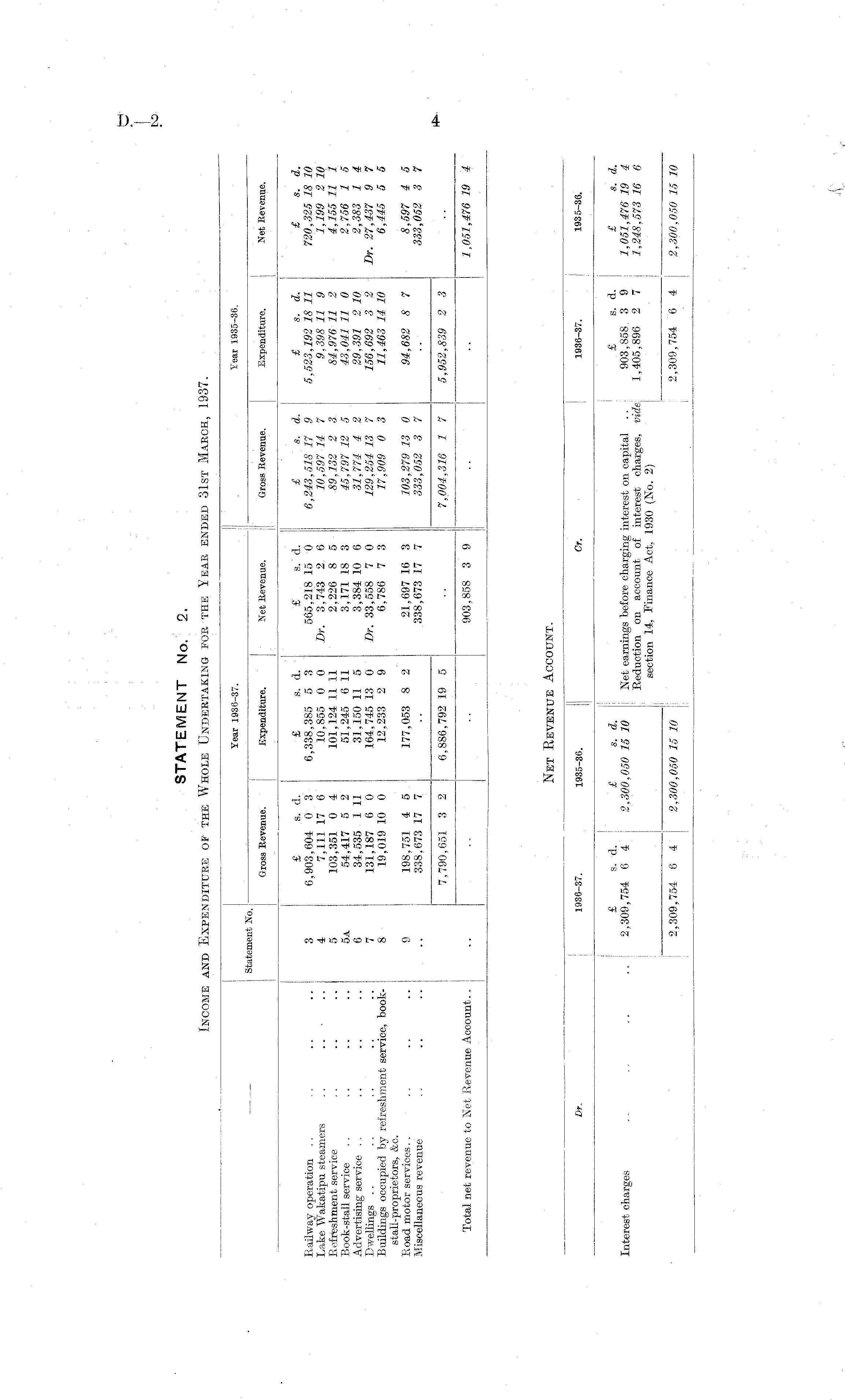 Year 1936-37. jl Tear 1935-36. — j Statement No. ; *— I : j i. ;— : —; —; — , —;— |— ~ Gross Revenue. j Expenditure. Net .Revenue. j Gross Ilevenue. Expenditure. I Net Revenue. £ s. d. £ s. d. £ s. d. £ s. d. £ s. d. £ s. d. Railway operation .. .. .. .. 3 6,903,604 0 3 6,338,385 5 3 565,218 15 0 6,243,518 17 9 5,523,192 18 11 720,325 18 10 Lake Wakatipu steamers .. .. ■ .. 4 7,111 17 6 10,855 0 0 Dr. 3,743 2 6 10,597 14 7 9,398 11 9 1,199 2 10 Refreshment service .. .. .. 5 103,351 0 4 101,124 11 11 2,226 8 5 89,132 2 3 84,976 11 2 4,155 11 1 Book-stall service .. .. .. .. 5a 54,417 5 2 51,245 6 11 3,171 18 3 45,797 12 5 43,041 11 0 2,756 1 5 Advertising service .. .. .. .. 6 34,535 111 31,150 11 5 3,384 10 6 31,774 4 2 29,391 2 10 2,383 1 4 Dwellings .. .. .. .. .. 7 131,187 6 0 164,745 13 0 Dr. 33,558 7 0 129,254 13 7 156,692 3 2 Dr. 27,437 9 7 Buildings occupied by refreshment service, book- 8 19,019 10 0 12,233 2 9 6,786 7 3 17,909 0 3 11,463 14 10 6,445 5 5 stall-proprietors, &c. Road motor services.. .. .. .. 9 198,751 4 5 177,053 8 2 21,697 16 3 103,279 13 0 94,682 8 7 8,597 4 5 Miscellaneous revenue .. .. .. .. 338,673 17 7 .. 338,673 17 7 333,052 3 7 .. 333,052 3 7 7,790,651 3 2 6,886,792 19 5 .. 7,004,316 1 7 5,952,839 2 3 Total net revenue to Net Revenue Account.. j .. .. .. 903,858 3 9 .. .. 1,051,476 19 4