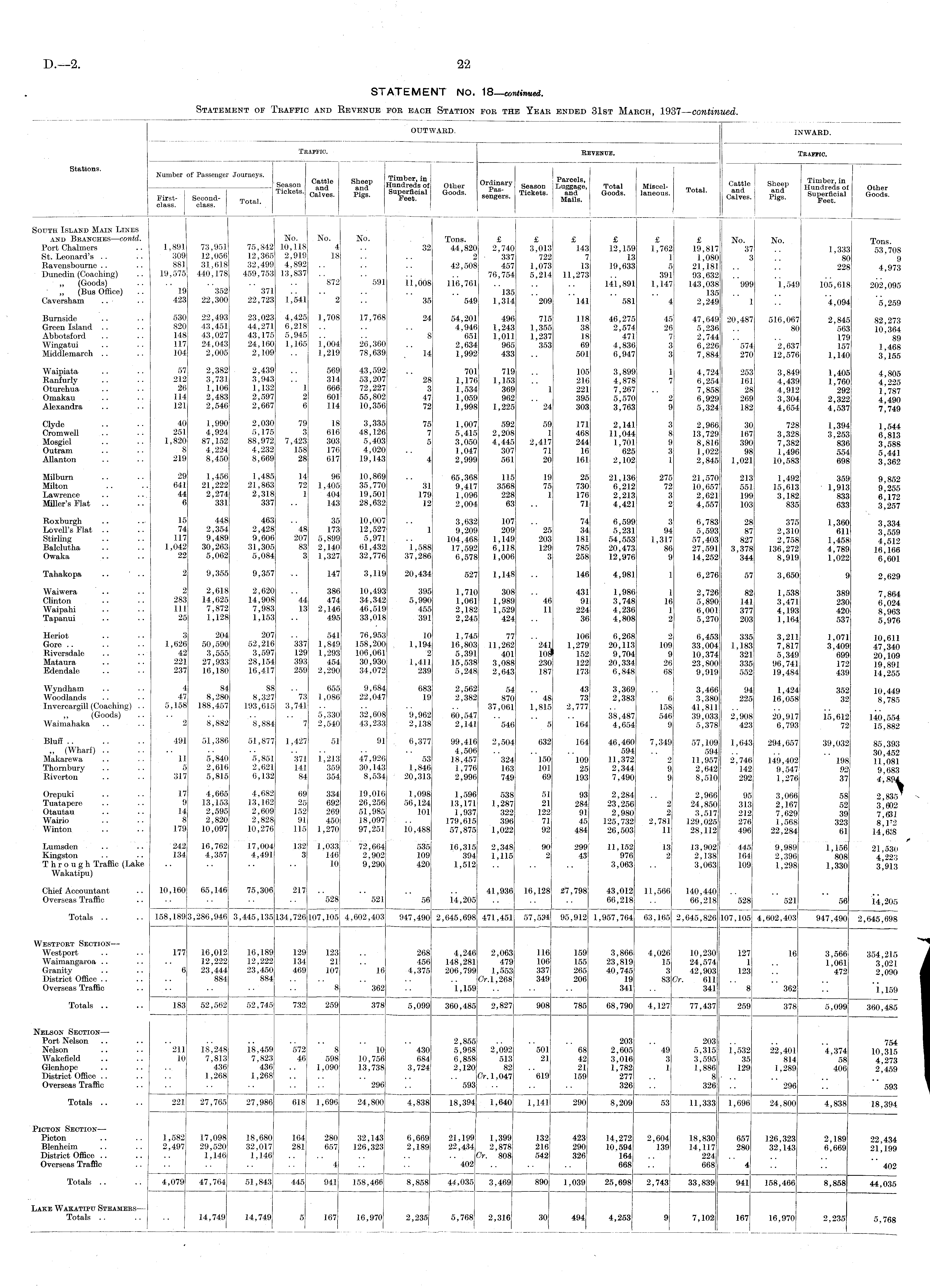 OUTWARD. INWARD. Traffic. Revenue. Traffic. Stations. j Number of Passenger Journeys. Timber " | p Season C^ le S and P Hundred's of Other 0r p 1 a °f ry Season Luggage, Total Miscel- Total S and P Hundreds 1 ot Other First- Second- Tota] Cal ™ 8 ' Pi § B ' G °° dS ' T1Ck6tS ' Mats. ' cSres. Pigs. Go ° d8 ' class. class. South Island Main Lines and Bbanches—contd. No. No. No. Tons. £ £ £ £ £ £ No. No. Tons Port Chalmers .. 1,891 73,951 75,842 10,118 4 .. 32 44,820 2,740 3,013 143 12,159 1,762 19,817 37 .. 1,333 53 708 St. Leonard's .. .. 309 12,056 12,365 2,919 18 .. 2 337 722 7 13 1 1,080 3 80 ' 9 Ravensbourne .. .. 881 31,618 32,499 4,892 .. .. .. 42,508 457 1,073 13 19,633 5 21,181 .. .. 228 4 973 Dunedin (Coaching) .. 19,575 440,178 459,753 13,837 .. .. .. .. 76,754 5,214 11,273 .. 391 93,632 „ (Goods) .. .. .. .. .. 872 591 11,008 116,761 .. .. .. 141,891 1,147 143,038 999 1,549 105,618 202,095 „ (Bus Office) .. 19 352 371 .. .. .. .. .. 135 .. .. .. 135 Caversham .. .. 423 22,300 22,723 1,541 2 35 549 1,314 209 141 581 4 2,249 1 .. 4,094 5,259 Burnside .. .. 530 22,493 23,023 4,425 1,708 17,768 24 54,201 496 715 118 46,275 45 47,649 20,487 516,067 2 845 82 273 Green Island .. .. 820 43,451 44,271 6,218 .. .. .. 4,946 1,243 1,355 38 2,574 26 5,236 . . 80 563 lo'364 Abbotsford .. .. 148 43,027 43,175 5,945 .. .. 8 651 1,011 1,237 18 471 7 2,744 .. .. 179 ' 89 Wingatui .. .. 117 24,043 24,160 1,165 1,004 26,360 .. 2,634 965 353 69 4,836 3 6,226 574 2,637 157 1 468 Middlemarch .. .. 104 2,005 2,109 .. 1,219 78,639 14 1,992 433 .. 501 6,947 3 7,884 270 12,576 1,140 3J55 Waipiata .. .. 57 2,382 2,439 .. 569 43,592 .. 701 719 .. 105 3,899 1 4,724 253 3,849 1,405 4 805 Ranfurly .. .. 212 3,731 3,943 .. 314 53,207 28 1,176 1,153 .. 216 4,878 7 6,254 161 4,439 1,760 4*225 Oturehua .. •• 26 1,106 1,132 I 666 72,227 3 1,534 369 1 221 7,267 .. 7,858 28 4,912 292 l'787 Omakau .. .. 114 2,483 2,597 2 601 55,802 47 1,059 962 .. 395 5,570 2 6,929 269 3.304 2,322 4 490 Alexandra .. .. 121 2,546 2,667 6 114 10,356 72 1,998 1,225 24 303 3,763 9 5,324 182 4,654 4,537 7*749 Clyde .. 40 1,990 2,030 79 18 3,335 75 1,007 592 59 171 2,141 3 2,966 30 728 1,394 1 544 Cromwell .. ■■ 251 4,924 5,175 3 616 48,126 7 5,415 2,208 1 468 11,044 8 13,729 167 3,328 3 253 6 813 Mosgiel .. •• 1,820 87,152 88,972 7,423 303 5,403 5 3,050 4,445 2,417 244 1,701 9 8,816 390 7,382 836 3*588 Outram .. 8 4,224 4,232 158 176 4,020 .. 1,047 307 71 16 625 3 1,022 98 1,496 554 5*441 Allanton .. .. 219 8,450 8,669 28 617 19,143 4 2,999 561 20 161 2,102 1 2,845 1,021 10,583 698 3*362 Milburn .. .. 29 1,456 1,485 14 96 10,869 .. 65,368 115 19 25 21,136 275 21,570 213 1,492 359 9 852 Milton .. •• 641 21,222 21,863 72 1,405 35,770 31 9,417 3568 75 730 6,212 72 10,657 551 15,613 1,913 9*255 Lawrence .. .. 44 2,274 2,318 1 404 19,501 179 1,096 228 1 176 2,213 3 2,621 199 3,182 833 6 172 Miller's Flat .. .. 6 331 337 .. 143 28,632 12 2,004 63 71 4,421 2 4,557 103 835 633 3^257 Roxburgh .. . - 15 448 463 .. 35 10,007 .. 3,632 107 .. 74 6,599 3 6,783 28 375 1,360 3 334 Lovell's Flat .. .. 74 2,354 2,428 48 173 12,527 1 9,209 209 25 34 5,231 94 5,593 87 2,310 611 3*559 Stirling .. .. 117 9,489 9,606 207 5,899 5,971 .. 104,468 1,149 203 181 54,553 1,317 57,403 827 2,758 1,458 4*512 Balclutha .. .. 1,042 30,263 31,305 83 2,140 61,432 1,588 17,592 6,118 129 785 20,473 86 27,591 3,378 136,272 4,789 16166 Owaka .. .. 22 5,062 5,084 3 1,327 32,776 37,286 6,578 1,006 3 258 12,976 9 14,252 344 8,919 1,022 6^601 Tahakopa .. .. 2 9,355 9,357 .. 147 3,119 20,434 527 1,148 .. 146 4,981 1 6,276 57 3,650 9 2,629 Waiwera .. .. 2 2,618 2,620 .. 386 10,493 395 1,710 308 .. 431 1,986 1 2,726 82 1,538 389 7 864 Clinton .. .. 283 14,625 14,908 44 474 34,342 5,990 1,061 1,989 46 91 3,748 16 5,890 141 3,471 230 e'o24 Waipahi .. .. Ill 7,872 7,983 13 2,146 46,519 455 2,182 1,529 11 224 4,236 1 6,001 377 4,193 420 8*963 Tapanui .. .. 25 1,128 1,153 .. 495 33,018 391 2,245 424 .. 36 4,808 2 5,270 203 1,164 537 5^976 Heriot .. 3 204 207 .. 541 76,953 10 1,745 77 .. 106 6,268 2 6,453 335 3,211 1,071 10 611 Gore .. .. •• 1,626 50,590 52,216 337 1,849 158,200 1,194 16,803 11,262 241 1,279 20,113 109 33,004 1,183 7,817 3,409 47*340 Riversdale .. .. 42 3,555 3,597 129 1,293 106,061 2 5,391 401 10$ 152 9,704 9 10,374 321 5,349 699 20 109 Mataura .. .. 221 27,933 28,154 393 454 30,930 1,411 15,538 3,088 230 122 20,334 26 23,800 335 96,741 172 19 891 Edendale .. 237 16,180 16,417 259 2,290 34,072 239 5,248 2,643 187 173 6,848 68 9,919 552 19,484 439 14^255 Wyndham .. .. 4 84 88 655 9,684 683 2,562 54 43 3,369 .. 3,466 94 1,424 352 10 449 Woodlands .. •• 47 8,280 8,327 73 1,086 22,047 19 2,382 870 48 73 2,383 6 3,380 225 16,058 32 8*785 Invercargill (Coaching) .. 5,158 188,457 193,615 3,741 •• .. .. .. 37,061 1,815 2,777 .. 158 41,811 (Goods) .. .. .. 5,330 32,608 9,962 60,547 .. .. .. 38,487 546 39,033 2,908 20,917 15,612 140 554 Waimahaka .. .. 2 8,882 8,884 7 2,540 43,233 2,138 2,141 546 5 164 4,654 9 5,378 423 6,793 72 15^882 Bluff.. .. .. 491 51,386 51,877 1,427 51 91 6,377 99,416 2,504 632 164 46,460 7,349 57,109 1,643 294,657 39,032 85,393 ,, (Wharf) .. .. .. .. .. .. .. .. .. 4,506 .. .. .. 594 .. 594 .. .. .. 30 452 Makarewa .. .. 11 5,840 5,851 371 1,213 47,926 53 18,457 324 150 109 11,372 2 11,957 2,746 149,402 198 11 081 Thornbury .. .. 5 2,616 2,621 141 359 30,143 1,846 1,776 163 101 25 2,344 9 2,642 142 9,547 92 9 683 Riverton .. .. 317 5,815 6,132 84 354 8,534 20,313 2,996 749 69 193 7,490 9 8,510 292 1,276 37 <f,'spk Orepuki .. .. 17 4,665 4,682 69 334 19,016 1,098 1,596 538 51 93 2,284 .. 2,966 95 3,066 58 2 835 Tuatapere .. .. 9 13,153 13,162 25 692 26,256 56,124 J.3,171 1,287 21 284 23,256 2 24,850 313 2,167 52 3*602 Otautau .. .. 14 2,595 2,609 152 269 51,985 101 1,937 322 122 91 2,980 2 3,517 212 7,629 39 7*631 Wairio .. .. 8 2,820 2,828 91 450 18,097 .. 179,615 396 71 45 125,732 2,781 129,025 276 1,568 323 8'l