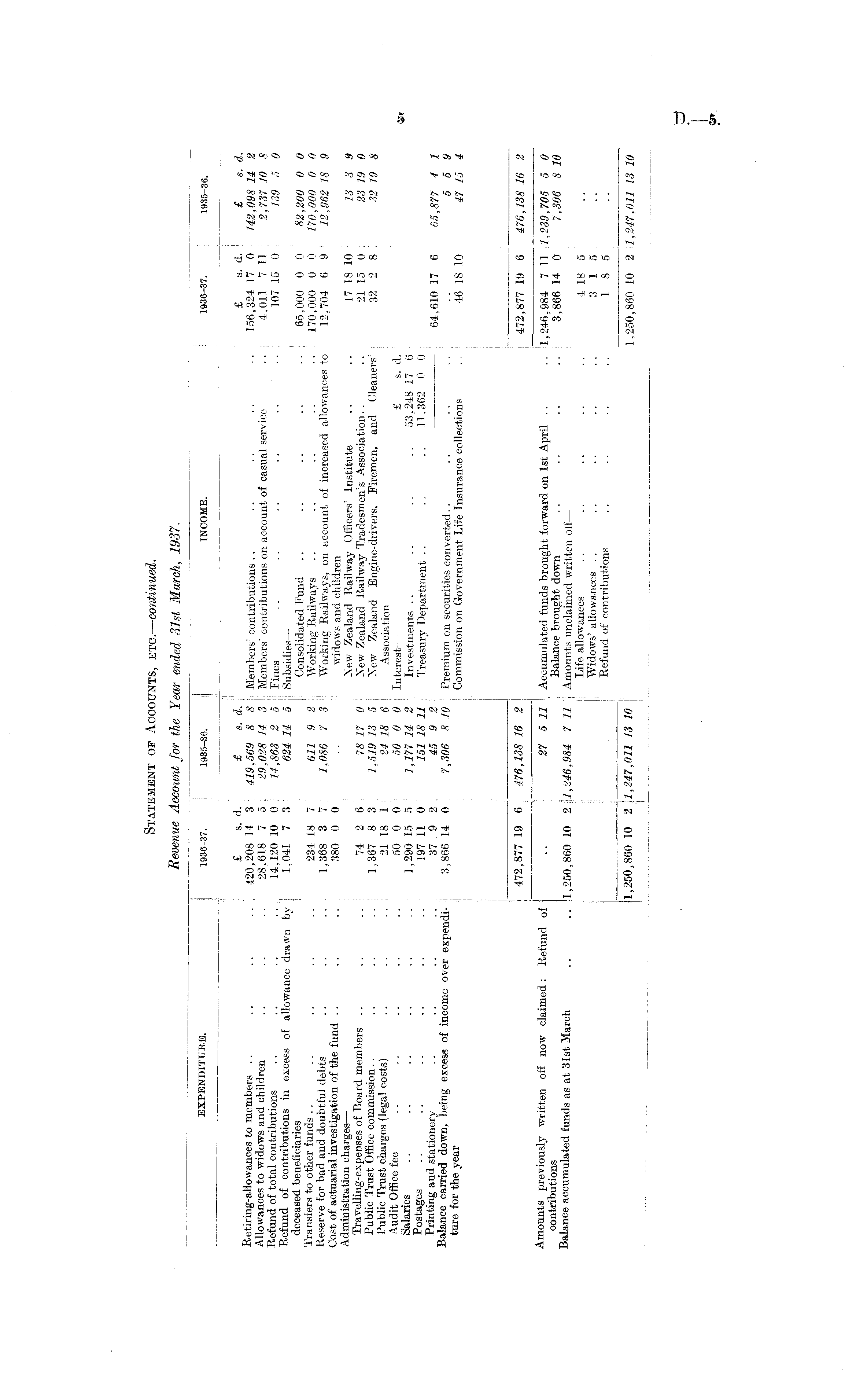 EXPENDITURE. 1936-37. 1935-36. INCOME. 1936-37. 1935-36. 3 ' i ~ " j " £ s. d. ■ £ s. d. £ s. d. £ s. d. Retiring-allowances to members .. .. .. .. 420,208 14 3 - 419,569 8 8 Members'contributions.. .. .. .. .. 156,324 17 0 142,098 14 2 Allowances to widows and children .. .. .. 28,618 7 5:1 29,028 14 3 Members'contributions on account of casual service •• i 4,011 7 11 2,737 10 8 Refund of total contributions .. .. .. .. 14,120 10 0 14,863 2 5 Fines .. .. .. .. .. ' ■•! 107 15 0 139 5 0 Refund of contributions in excess of allowance drawn by': 1,041 7 3 1 624 14 5 Subsidies — deceased beneficiaries Consolidated Fund .. .. .. .. .. 65,000 0 0 82,200 0 0 Transfers to other funds.. .. .. .. .. 234 18 7 611 9 2 Working Railways .. .. .. .. . . | 170,000 0 0 170,000 0 0 Reserve for bad and doubtful debts .. .. .. j 1,368 3 7 ; 1,086 7 3 Working Railways, on account of increased allowances to ; 12,704 6 9 12,962 18 9 Cost of actuarial investigation of the fund .. .. .. 380 0 0 .. widows and children Administration charges New Zealand Railway Officers' Institute .. .. 17 18 10 13 3 9 Travellmg-expenses of Board members .. .. .. 74 2 6 78 17 0 New Zealand Railway Tradesmen's Association.. .. | 21 15 0 23 19 0 Public Trust Office commission.. .. .. .. 1,367 8 3 1,519 13 5 New Zealand Engine-drivers, Firemen, and Cleaners' 32 2 8 32 19 8 Public Trust charges (legal costs) .. .. .. 21 18 1 24 18 6 Association Audit Office fee .. .. .. .. ., 50 0 0 50 0 0 Interest— £ s. d. Salaries .. .. .. .. .. .. 1,290 15 5 1,177 14 2 Investments.. .. .. .. 53,248 17 6 Postages .. .. .. .. .. {97 ix 0 151 18 11 Treasury Department .. .. .. 11,362 0 0 Printing and stationery .. .. .. .. 37 9 2 45 9 2 " 64,610 17 6 65,877 4 1 Balance carried down, being excess of income over expendi- 3,866 14 0 7,306 8 10 Premium on securities converted.. .. .. .. .. 5 5 9 ture for the year Commission on Government Life Insurance collections . . 46 18 10 47 15 4 472,877 19 6 476,138 16 2 472,877 19 6 476,138 16 2 Amounts previously written off now claimed: Refund of .. 27 5 11 Accumulated funds brought forward on 1st April .. .. 1,246,984 7 11 1,239,705 5 0 contributions Balance brought down .. .. .. .. 3,866 14 0 7,306 8 10 Balance accumulated funds as at 31st March .. .. 1,250,860 10 2 -1,246,984 7 11 Amounts unclaimed written off— Life allowances .. .. .. .. .. 4 18 5 Widows' allowances .. .. .. .. .. 315 Refund of contributions .. .. .. .. 185 1,250,860 10 2 1,247,011 13 10 1,250,860 10 2 1,247,011 13 10