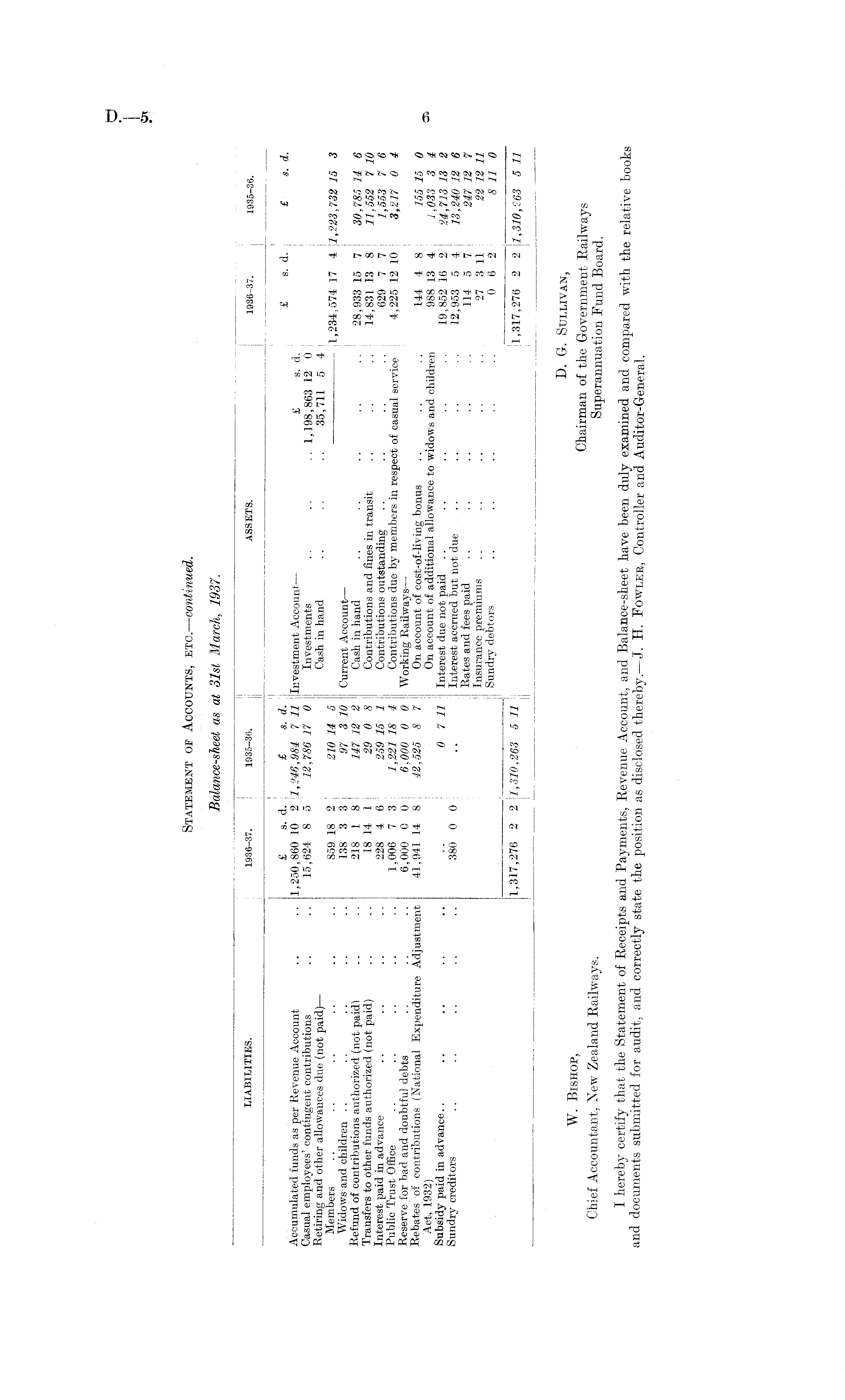 LIABILITIES. 1936-37. 1935-36. | ASSETS. 1936-37. j 1935-36. _ - • I ■ . ■ II . - - - ! I I £ s. d. £ s. d, £ s. d. £ s. d. Accumulated funds as per Revenue Account .. .. 1,250,860 10 2 1,246,984 7 11 Investment Account — £ s. d. Casual employees' contingent contributions .. .. 15,624 8 5 12,786 17 0 Investments .. .. .. 1,198,863 12 0 Retiring and other allowances due (not paid) — Cash in hand .. .. .. 35,711 5 4 Members .. .. .. .. .. .. 859 18 2 210 14 5 1,234,574 17 4 1,223,732 15 3 Widows and children .. .. .. .. .. 138 3 3 97 3 10 Current Account — Refund of contributions authorized (not paid) .. .. 218 1 8 147 12 2 Cash in hand .. .. .. .. .. 28,933 15 7 30,785 14 6 Transfers to other funds authorized (not paid) .. .. 18 14 1 29 0 8 Contributions and fines in transit .. .. .. 14,831 13 8 11,552 7 10 Interest paid in advance .. .. .. .. 228 4 6 259 15 1 Contributions outstanding .. .. .. .. 629 7 7 1,553 7 6 Public Trust Office .. .. .. .. .. 1,006 7 3 1,221 18 4 Contributions due by members in respect of casual service 4,225 12 10 3,217 0 4 Reserve for bad and doubtful debts .. .. .. 6,000 0 0 6,000 0 0 Working Railways — Rebates of contributions (National Expenditure Adjustment 41,941 14 8 42,525 8 7 On account of cost-of-living bonus .. .. .. 144 4 8 155 15 0 Act, 1932) _ On account of additional allowance to widows and children 988 13 4 1,033 3 4 Subsidy paid in advance.. .. .. .. .. .. 0 7 11 Interest due not paid .. .. .. .. .. 19,852 16 2 24,713 13 2 Sundry creditors .. .. . .. .. .. 380 0 0 .. Interest accrued but not due .. .. .. .. 12,953 5 4 13,240 12 6 Rates and fees paid . . .. .. .. .. 114 5 7 247 12 7 Insurance premiums .. .. .. .. . . 27 3 11 22 12 11 Sundry debtors .. .. .. .. .. 062 8 11 0 1,317,276 2 2 1,310,263 5 11 1,317,276 2 2 1,310,263 5 11