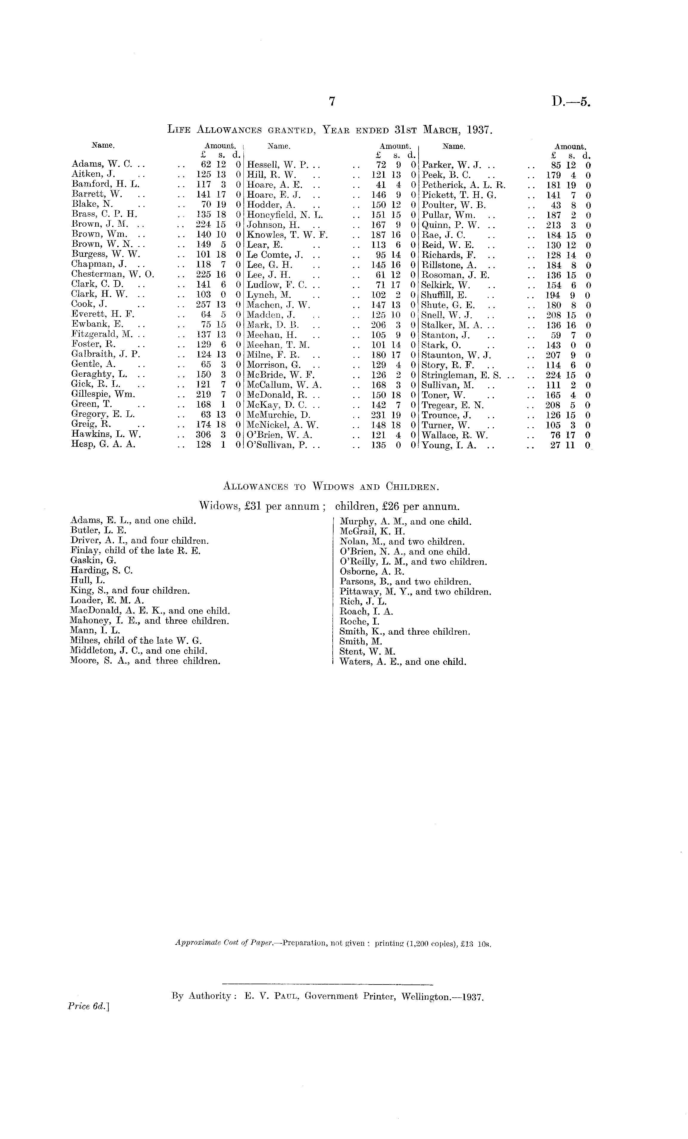 Life Allowances granted, Year ended 31st March, 1937. Name. Amount. Name. Amount. Name. Amount. £ s. d. £ s. d. £ s. d. Adams, W. C. .. .. 62 12 0 Hessell, W. P. .. .. 72 9 0 Parker, W. J. .. .. 85 12 0 Aitken, J. .. .. 125 13 0 Hill, R. W. .. .. 121 13 0 Peek, B. C. .. .. 179 4 0 Bamford, H. L. . . 117 3 0 Hoare, A. E. .. 41 4 0 Petherick, A. L. R. .. 181 19 0 Barrett, W. .. .. 141 17 0 Hoare, E. J. .. .. 146 9 0 Pickett, T. H. G. .. 141 7 0 Blake, N. .. .. 70 19 0 Hodder, A. .. .. 150 12 0 Poulter, W. B. 43 8 0 Brass, C. P. H. .. 135 18 0 Honeyfield, N. L. .. 151 15 0 Pullar, Wm. .. .. 187 2 0 Brown, J. M. .. .. 224 15 0 Johnson, H. . . .. 167 9 0 Quinn, P. W. .. .. 213 3 0 Brown, Wm. .. .. 140 10 0 Knowles, T. W. E. .. 187 16 0 Rae, J. C. .. .. 184 15 0 Brown, W. N. .. .. 149 5 0 Lear, E. .. .. 113 6 0 Reid, W. E. .. .. 130 12 0 Burgess, W. W. .. 101 18 OLe Comte, J. .. .. 95 14 0 Richards, E. .. 128 14 0 Chapman, J. .. .. 118 7 0 Lee, 6. H. .. .. 145 16 0 Rillstone, A. .. 184 8 0 Chesterman, W. O. .. 225 16 0 Lee, J. H. .. . . 61 12 0 Rosoman, J. E. .. 136 15 0 Clark, C. D. .. .. 141 6 0 Ludlow, F. C. .. .. 71 17 0 Selkirk, W. .. .. 154 6 0 Clark, H. W. .. .. 103 0 0 Lynch, M. .. .. 102 2 0 Shuffill, E. . . .. 194 9 0 Cook, J. .. .. 257 13 0 Machen, J. W. .. 147 13 0 Shute, G. E. .. .. 180 8 0 Everett, H. E. .. 64 5 0 Madden, J. .. .. 125 10 0 Snell, W. J. .. .. 208 15 0 Ewbank, E. .. 75 15 0 Mark, D. B. . . .. 206 3 0 Stalker, M. A. . . .. 136 16 0 Fitzgerald, M. .. .. 137 13 0 Meehan, H. .. .. 105 9 0 Stanton, J. .. .. 59 7 0 Foster, R. .. . . 129 6 0 Meehan, T. M. . . 101 14 0 Stark, O. . . .. 143 0 0 Galbraith, J. P. . . 124 13 0 Milne, F. R. . . .. 180 17 0 Staunton, W. J. .. 207 9 0 Gentle, A. .. .. 65 3 0 Morrison, G. .. 129 4 0 Story, R. F. .. . . 114 6 0 Geraghty, L. . . .. 150 3 0 Mcßride, W. F. .. 126 2 0 Stringleman, E. S 224 15 0 Gick, R. L. .. .. 121 7 0 McCallum, W. A. .. 168 3 0 Sullivan, M. .. .. 11l 2 0 Gillespie, Wm. .. 219 7 0 McDonald, R. . . .. 150 18 0 Toner, W. .. .. 165 4 0 Green, T. . . .. 168 1 0 McKay, I). C. .. .. 142 7 0 Tregear, E. N. . . 208 5 0 Gregory, E. L. .. 63 13 0 McMurchie, D. . . 231 19 0 Trounce, J. .. .. 126 15 0 Greig, R. .. .. 174 18 0 McNickel, A. W. .. 148 18 0 Turner, W. .. .. 105 3 0 Hawkins, L. W. .. 306 3 0 O'Brien, W. A. . . 121 4 0 Wallace, R. W. .. 76 17 0 Hesp, G. A. A. .. 128 1 0 O'Sullivan, P. .. .. 135 0 0 Young, LA... .. 27 11 0 Allowances to Widows and Children. Widows, £31 per annum ; children, £26 per annum. Adams, E. L., and one child. Murphy, A. M., and one child. Butler, L. E. McGrail, K. H. Driver, A. I„ and four children. Nolan, M., and two children. Finlay, child ot the late R. E. O'Brien, N. A., and one child. Gaskin, G. O'Reilly, L. M., and two children. Harding, S. C. Osborne, A. R. Hull, L. Parsons, 8., and two children. King, S., and four children. Pittaway, M. Y., and two children. Loader, E. M. A. Rich, J." L. Mac Donald, A. E. K, and one child. Roach, I. A. Mahoney, I. E., and three children. Roche, I. Mann, I. L. Smith, K., and three children. Milnes, child of the late W. G. Smith, M. Middleton, J. C., and one child. Stent, W. M. Moore, S. A., and three children. Waters, A. E., and one child. Approximate Cost of Paper.—Preparation, not given ; printing (1,200 copies), £13 10s.