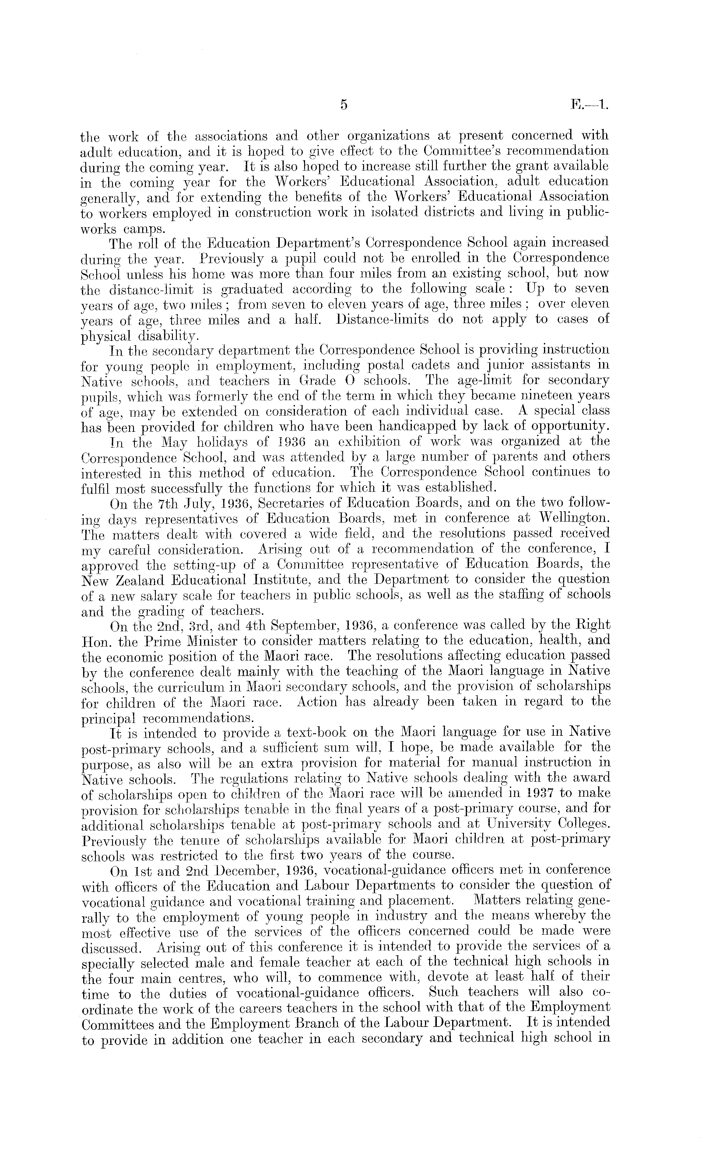 the work of the associations and other organizations at present concerned with adult education, and it is hoped to give effect to the Committee's recommendation during the coming year. It is also hoped to increase still further the grant available in the coming year for the Workers' Educational Association, adult education generally, and for extending the benefits of the Workers' Educational Association to workers employed in construction work in isolated districts and living in publicworks camps. The roll of the Education Department's Correspondence School again increased during the year. Previously a pupil could not be enrolled in the Correspondence School unless his home was more than four miles from an existing school, but now the distance-limit is graduated according to the following scale : Up to seven years of age, two miles ; from seven to eleven years of age, three miles ; over eleven years of age, three miles and a half. Distance-limits do not apply to cases of physical disability. In the secondary department the Correspondence School is providing instruction for young people in employment, including postal cadets and junior assistants in Native schools, and teachers in Grade 0 schools. The age-limit for secondary pupils, which was formerly the end of the term in which they became nineteen years of age, may be extended on consideration of each individual case. A special class has been provided for children who have been handicapped by lack of opportunity. In the May holidays of 1936 an exhibition of work was organized at the Correspondence School, and was attended by a large number of parents and others interested in this method of education. The Correspondence School continues to fulfil most successfully the functions for which it was established. On the 7th July, 1936, Secretaries of Education Boards, and on the two following days representatives of Education Boards, met in conference at Wellington. The matters dealt with covered a wide field, and the resolutions passed received my careful consideration. Arising out of a recommendation of the conference, I approved the setting-up of a Committee representative of Education Boards, the New Zealand Educational Institute, and the Department to consider the question of a new salary scale for teachers in public schools, as well as the staffing of schools and the grading of teachers. On the 2nd", 3rd, and 4th September, 1936, a conference was called by the Right Hon. the Prime Minister to consider matters relating to the education, health, and the economic position of the Maori race. The resolutions affecting education passed by the conference dealt mainly with the teaching of the Maori language in Native schools, the curriculum in Maori secondary schools, and the provision of scholarships for children of the Maori race. Action has already been taken in regard to the principal recommendations. It is intended to provide a text-book on the Maori language for use in Native post-primary schools, and a sufficient sum will, I hope, be made available for the purpose, as also will be an extra provision for material for manual instruction in Native schools. The regulations relating to Native schools dealing with the award of scholarships open to children of the Maori race will be amended in 1937 to make provision for scholarships tenable in the final years of a post-primary course, and for additional scholarships tenable at post-primary schools and at University Colleges. Previously the tenure of scholarships available for Maori children at post-primary schools was restricted to the first two years of the course. On Ist and 2nd December, 1936, vocational-guidance officers met in conference with officers of the Education and Labour Departments to consider the question of vocational guidance and vocational training and placement. Matters relating generally to the employment of young people in industry and the means whereby the most effective use of the services of the officers concerned could be made were discussed. Arising out of this conference it is intended, to provide the services of a specially selected male and female teacher at each of the technical high schools in the four main centres, who will, to commence with, devote at least half of their time to the duties of vocational-guidance officers. Such teachers will also coordinate the work of the careers teachers in the school with that of the Employment Committees and the Employment Branch of the Labour Department. It is intended to provide in addition one teacher in each secondary and technical high school in