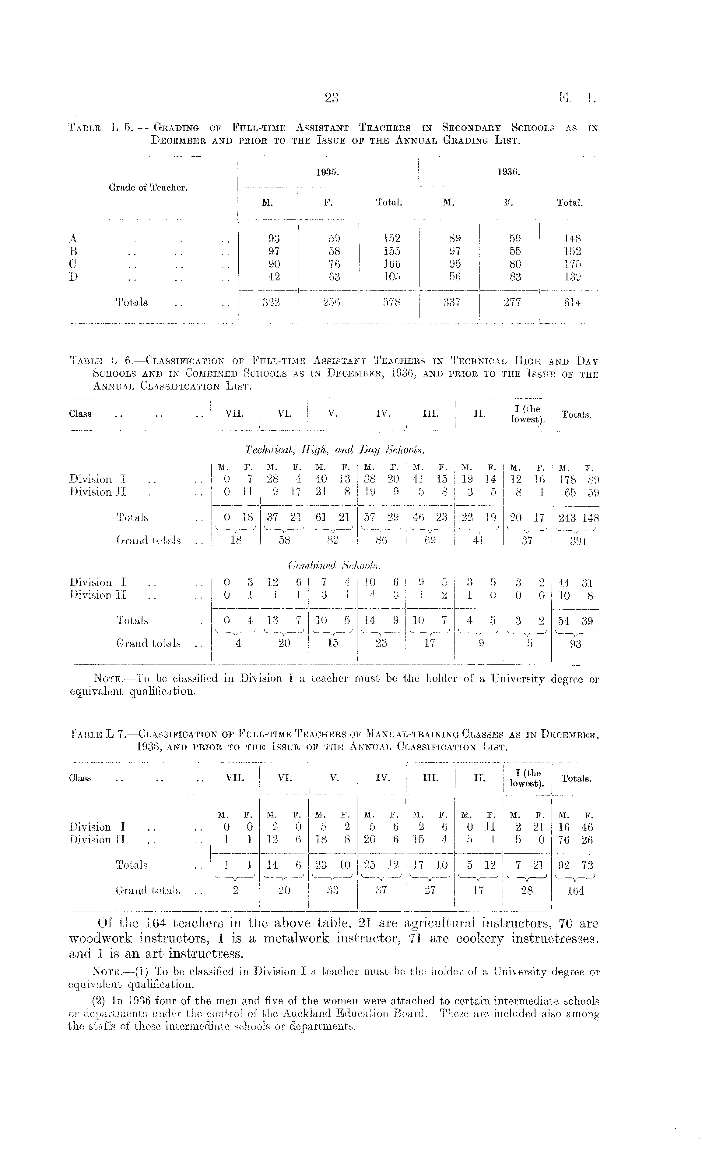 1935. 1936. Grade of Teacher. M. I F. Total. M. | F. Total. ' ! L I A .. .. .. 93 59 152 89 59 148 B .. .. .. 97 58 155 97 55 152 C .. .. .. 90 76 166 95 80 175 D .. .. .. 42 63 105 56 83 139 Totals .. .. 322 256 578 337 277 614
