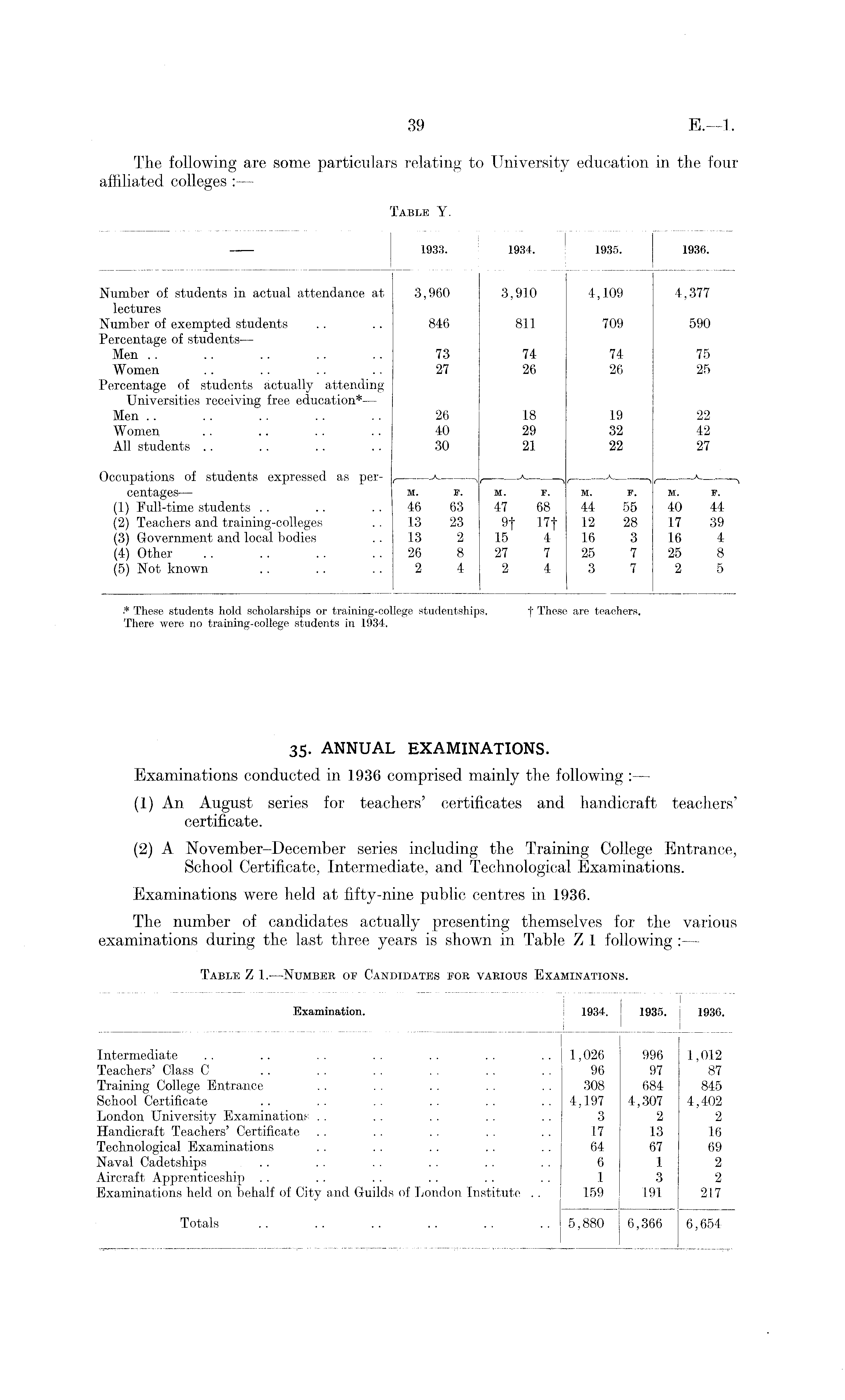 35. ANNUAL EXAMINATIONS. Examinations conducted in 1936 comprised mainly the following : — (1) An August series for teachers' certificates and handicraft teachers' certificate. (2) A November-December series including the Training College Entrance, School Certificate, Intermediate, and Technological Examinations. Examinations were held at fifty-nine public centres in 1936. The number of candidates actually presenting themselves for the various examinations during the last three years is shown in Table Z 1 following : —