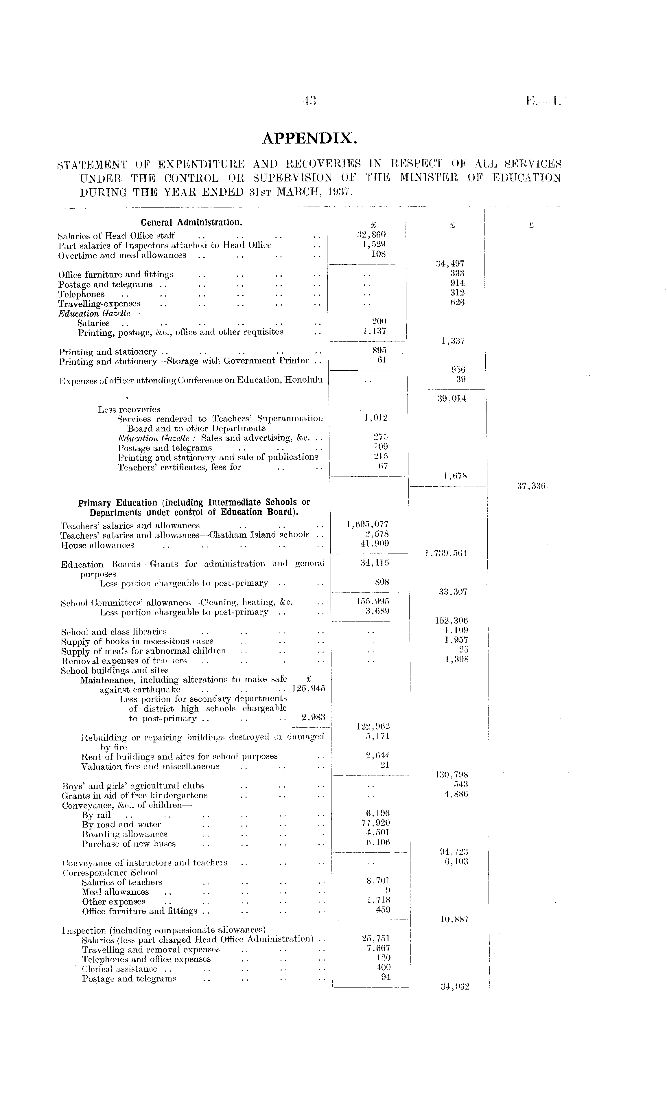 APPENDIX. STATEMENT OF EXPENDITURE AND RECOVERIES IN RESPECT OF ALL SERVICES UNDER THE CONTROL OR SUPERVISION OF THE MINISTER OF EDUCATION DURING THE YEAR ENDED 31st MARCH, 1937.