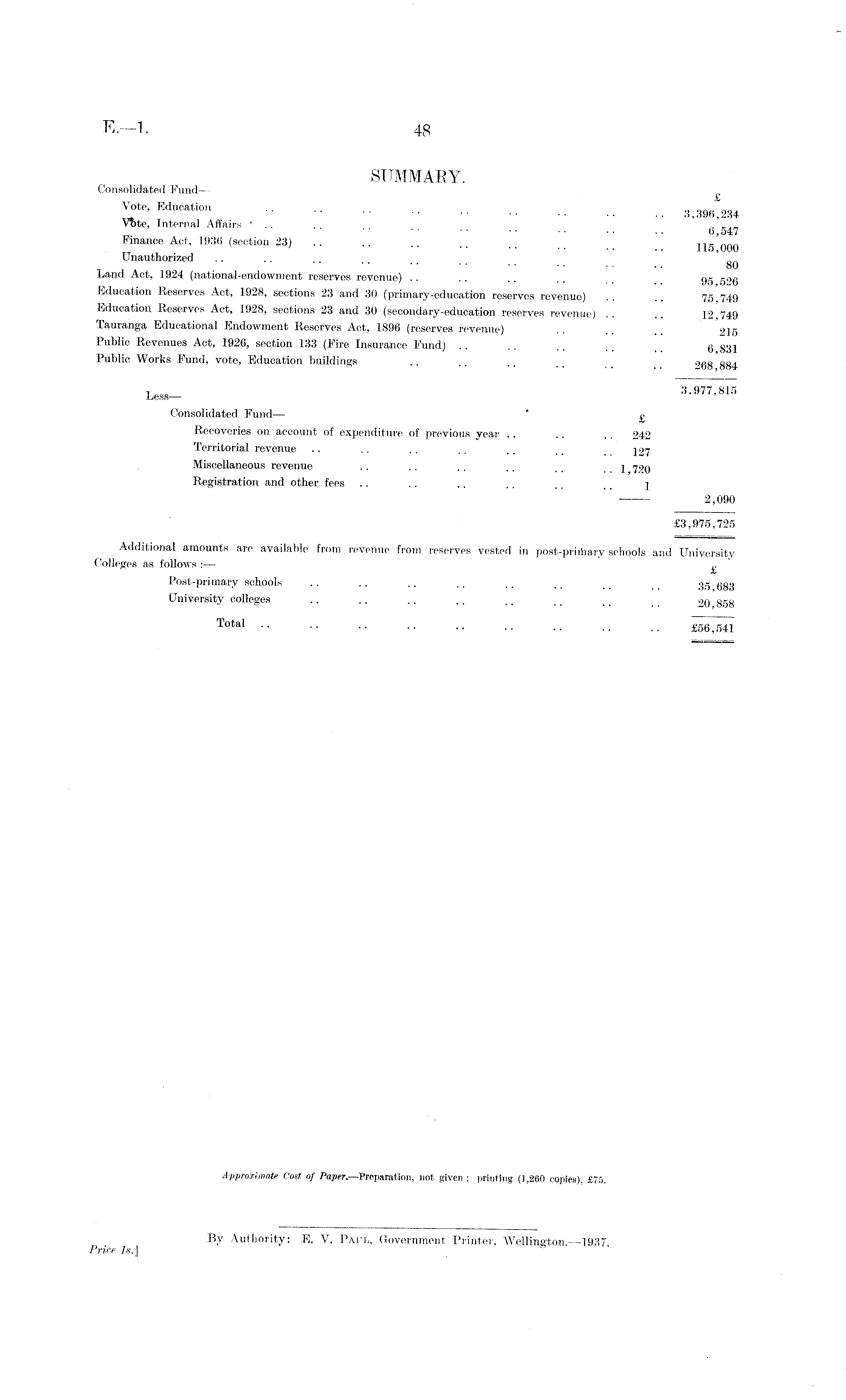 SUMMARY. Consolidated Fund— , Vote, Education .. .. .. .. .. .. 3,396,234 Vote, Internal Affairs ' .. . „ 6,547 Finance Act, 1936 (section 23) .. .. .. .. .. 115 000 Unauthorized o0 Land Act, 1924 (national-endowment reserves revenue) .. . . .. .. 95 Education Reserves Act, 1928, sections 23 and 30 (primary-education reserves revenue) .. .. 75 749 Education Reserves Act, 1928, sections 23 and 30 (secondary-education reserves revenue) . . 12 749 Tauranga Educational Endowment Reserves Act, 1896 (reserves revenue) . 215 Public Revenues Act, 1926, section 133 (Fire Insurance Fund) .. . . . . 6 831 Public Works Fund, vote, Education buildings . . . . .. ~ 268 884 LessConsolidated Fund— ' £ Recoveries on account of expenditure of previous year .. .. . . 242 Territorial revenue .. . . . . . . , . 127 Miscellaneous revenue .. . . .. ~ j 720 Registration and other fees .. .. .. .. ~ _ _ j 2,090 £3,975,725 Additional amounts are available from revenue from reserves vested in post-primary schools and University Colleges as follows : — £ Post-primary schools .. .. .. .. .. ~ _ 3g ggg University colleges .. .. . . .. ~ _ _ _ _ 20 858 Total £56,541