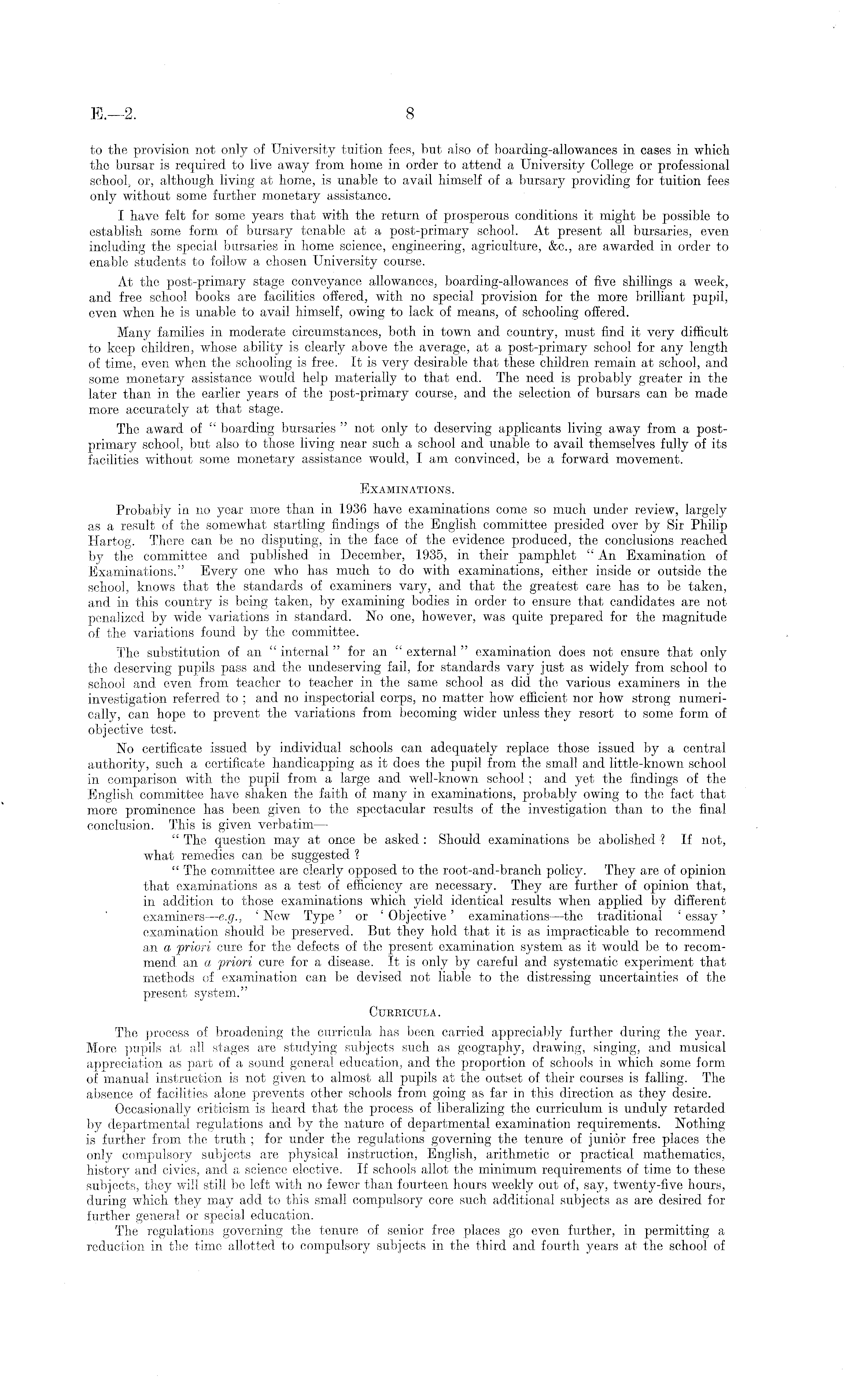 to the provision not only of University tuition fees, but also of boarding-allowances in cases in which the bursar is required to live away from home in order to attend a University College or professional school, or, although living at home, is unable to avail himself of a bursary providing for tuition fees only without some further monetary assistance. I have felt for some years that with the return of prosperous conditions it might be possible to establish some form of bursary tenable at a post-primary school. At present all bursaries, even including the special bursaries in home science, engineering, agriculture, &c., are awarded in order to enable students to follow a chosen University course. At the post-primary stage conveyance allowances, boarding-allowances of five shillings a week, and free school books are facilities offered, with no special provision for the more brilliant pupil, even when he is unable to avail himself, owing to lack of means, of schooling offered. Many families in moderate circumstances, both in town and country, must find it very difficult to keep children, whose ability is clearly above the average, at a post-primary school for any length of time, even when the schooling is free. It is very desirable that these children remain at school, and some monetary assistance would help materially to that end. The need is probably greater in the later than in the earlier years of the post-primary course, and the selection of bursars can be made more accurately at that stage. The award of " boarding bursaries " not only to deserving applicants living away from a postprimary school, but also to those living near such a school and unable to avail themselves fully of its facilities without some monetary assistance would, I am convinced, be a forward movement. Examinations. Probably in 110 year more than in 1936 have examinations come so much under review, largely as a result of the somewhat startling findings of the English committee presided over by Sir Philip Hartog. There can be no disputing, in the face of the evidence produced, the conclusions reached by the committee and published in December, 1935, in their pamphlet "An Examination of Examinations." Every one who has much to do with examinations, either inside or outside the school, knows that the standards of examiners vary, and that the greatest care has to be taken, and in this country is being taken, by examining bodies in order to ensure that candidates are not penalized by wide variations in standard. No one, however, was quite prepared for the magnitude of the variations found by the committee. The substitution of an " internal " for an " external " examination does not ensure that only the deserving pupils pass and the undeserving fail, for standards vary just as widely from school to school and even from teacher to teacher in the same school as did the various examiners in the investigation referred to ; and no inspectorial corps, no matter how efficient nor how strong numerically, can hope to prevent the variations from becoming wider unless they resort to some form of objective test. No certificate issued by individual schools can adequately replace those issued by a central authority, such a certificate handicapping as it does the pupil from the small and little-known school in comparison with the pupil from a large and well-known school; and yet the findings of the English committee have shaken the faith of many in examinations, probably owing to the fact that more prominence has been given to the spectacular results of the investigation than to the final conclusion. This is given verbatim — " The question may at once be asked : Should examinations be abolished •? If not, what remedies can be suggested ? " The committee are clearly opposed to the root-and-branch policy. They are of opinion that examinations as a test of efficiency are necessary. They are further of opinion that, in addition to those examinations which yield identical results when applied by different examiners—e.g., ' New Type ' or ' Objective ' examinations—the traditional ' essay ' examination should be preserved. But they hold that it is as impracticable to recommend an a priori cure for the defects of the present examination system as it would be to recommend an a priori cure for a disease. It is only by careful and systematic experiment that methods of examination can be devised not liable to the distressing uncertainties of the present system." Curricula. The process of broadening the curricula has been carried appreciably further during the year. More pupils at all stages are studying subjects such as geography, drawing, singing, and musical appreciation as part of a sound general education, and the proportion of schools in which some form of manual instruction is not given to almost all pupils at the outset of their courses is falling. The absence of facilities alone prevents other schools from going as far in this direction as they desire. Occasionally criticism is heard that the process of liberalizing the curriculum is unduly retarded by departmental regulations and by the nature of departmental examination requirements. Nothing is further from the truth ; for under the regulations governing the tenure of junior free places the only compulsory subjects are physical instruction, English, arithmetic or practical mathematics, history and civics, and a science elective. If schools allot the minimum requirements of time to these subjects, they will still be left with no fewer than fourteen hours weekly out of, say, twenty-five hours, during which they may add to this small compulsory core such additional subjects as are desired for further general or special education. The regulations governing the tenure of senior free places go even further, in permitting a reduction in the time allotted to compulsory subjects in the third and fourth years at the school of