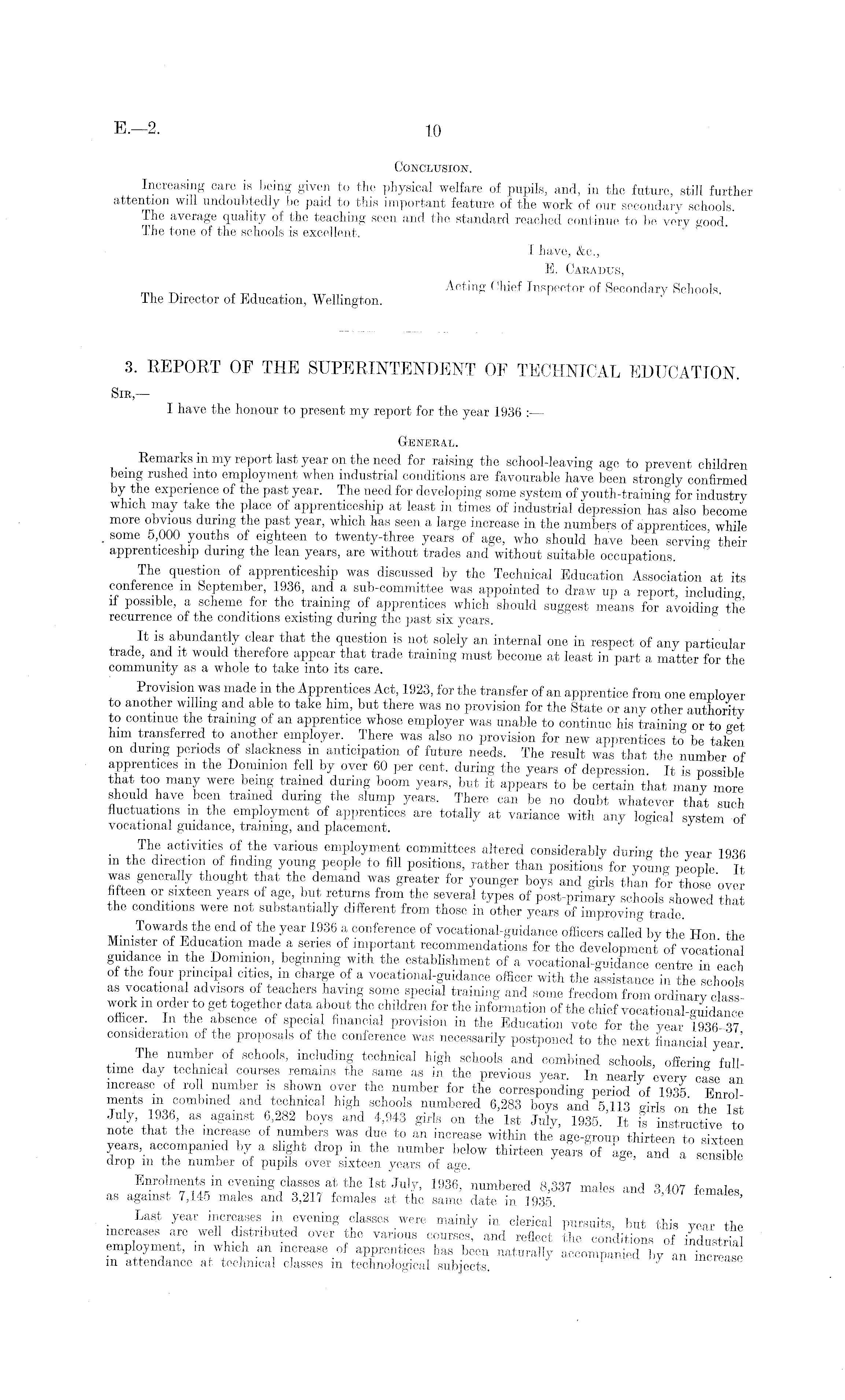 Conclusion. Increasing care is being given to the physical welfare of pupils, and, in the future, still further attention will undoubtedly be paid to this important feature of the work of our secondary schools. The average quality of the teaching seen and the standard reached continue to be very wood. The tone of the schools is excellent. I have, &c., E. Caradus, Acting Chief Inspector of Secondary Schools. Ihe Director of Education, Wellington.
