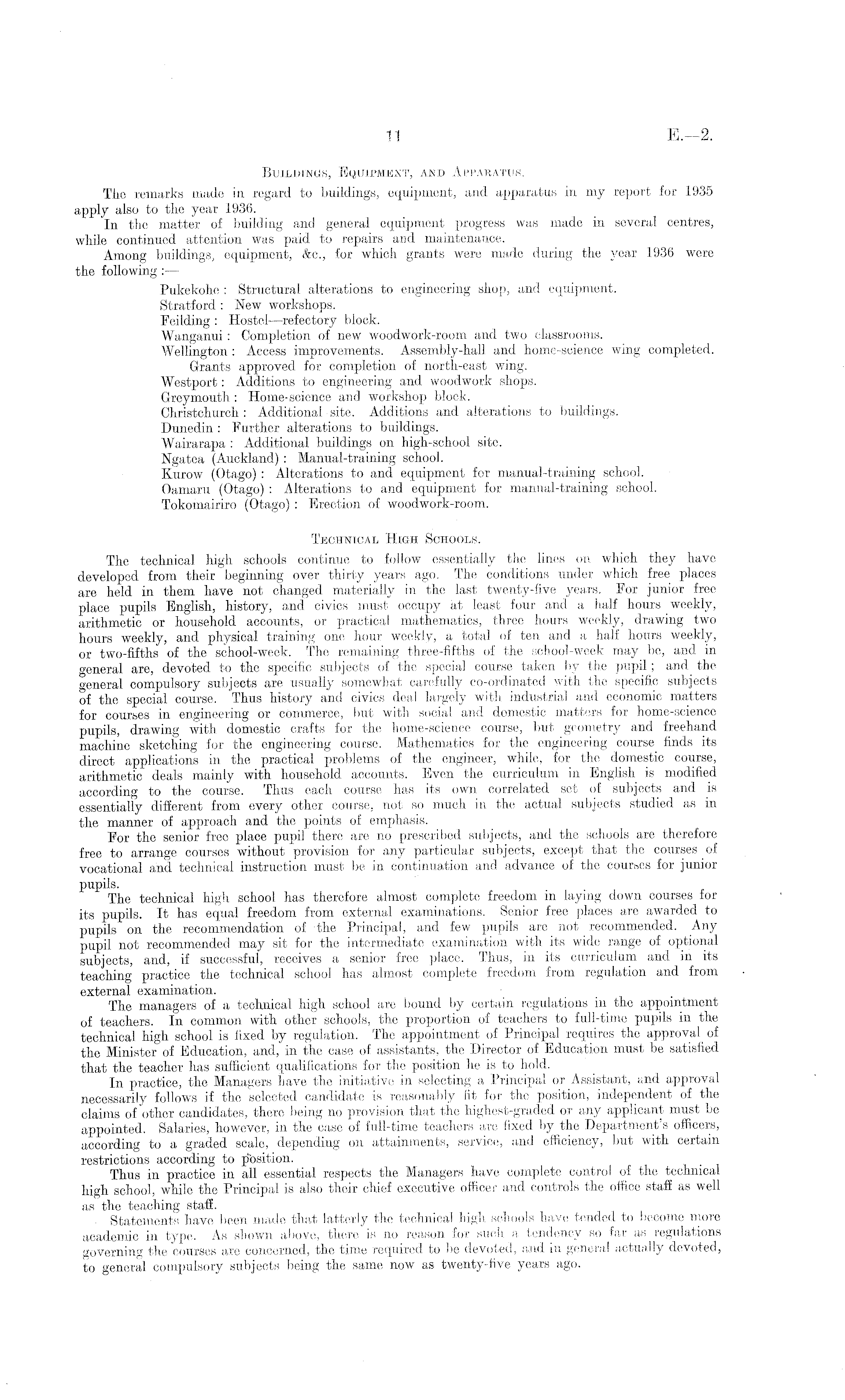 Buildings, Equipment, and Apparatus. The remarks made in regard to buildings, equipment, and apparatus in my report for 1935 apply also to tie year 1936. In the matter of building and general equipment progress was made in several centres, while continued attention was paid to repairs and maintenance. Among buildings, equipment, &c., for which grants were made during the year 1936 were the following : — Pukekohe : Structural alterations to engineering shop, and equipment. Stratford : New workshops. Feilding : Hostel —refectory block. Wanganui: Completion of new woodwork-room and two classrooms. Wellington : Access improvements. Assembly-hall and home-science wing completed. Grants approved for completion of north-east wing. Westport: Additions to engineering and woodwork shops. Greymouth : Home-science and workshop block. Christchurch : Additional site. Additions and alterations to buildings. Dunedin : Further alterations to buildings. Wairarapa : Additional buildings on high-school site. Ngatea (Auckland) : Manual-training school. Kurow (Otago) : Alterations to and equipment for manual-training School. Oamaru (Otago) : Alterations to and equipment for manual-training school. Tokomairiro (Otago) : Erection of woodwork-room. Technical High Schools. The technical high schools continue to follow essentially the lines on which they have developed from their beginning over thirty years ago. The conditions under which free places are held in them have not changed materially in the last twenty-five years. For junior free place pupils English, history, and civics must occupy at least four and a half hours weekly, arithmetic or household accounts, or practical mathematics, three hours weekly, drawing two hours weekly, and physical training one hour weekly, a total of ten and a half hours weekly, or two-fifths of the school-week. The remaining three-fifths of the school-week may be, and in general are, devoted to the specific subjects of the special course taken by the pupil ; and the general compulsory subjects are usually somewhat carefully co-ordinated with the specific subjects of the special course. Thus history and civics deal largely with industrial and economic matters for courses in engineering or commerce, but with social and domestic matters for home-science pupils, drawing with domestic crafts for the home-science course, but geometry and freehand machine sketching for the engineering course. Mathematics for the engineering course finds its direct applications in the practical problems of the engineer, while, for the domestic course, arithmetic deals mainly with household accounts. Even the curriculum in English is modified according to the course. Thus each course has its own correlated set of subjects and is essentially different from every other course, not so much in the actual subjects studied as in the manner of approach and the points of emphasis. For the senior free place pupil there are no prescribed subjects, and the schools are therefore free to arrange courses without provision for any particular subjects,. except that the courses of vocational and technical instruction must be in continuation and advance of the courses for junior pupils. The technical high school has therefore almost complete freedom in laying down courses for its pupils. It has equal freedom from external examinations. Senior free places are awarded to pupils on the recommendation of the Principal, and ,few pupils are not recommended. Any pupil not recommended may sit for the intermediate examination with its wide range of optional subjects, and, if successful, receives a senior free place. Thus, in its curriculum and in its teaching practice the technical school has almost complete freedom from regulation and from external examination. The managers of a technical high school are bound by certain regulations in the appointment of teachers. In common with other schools, the proportion of teachers to full-time pupils in the technical high school is fixed by regulation. The appointment of Principal requires the approval of the Minister of Education, and, in the case of assistants, the Director of Education must be satisfied that the teacher has sufficient qualifications for the position he is to hold. In practice, the Managers have the initiative in selecting a Principal or Assistant, and approval necessarily follows if the selected candidate is reasonably fit for the position, independent of the claims of other candidates, there being no provision that the highest-graded or any applicant must be appointed. Salaries, however, in the case of full-time teachers are fixed by the Department's officers, according to a graded scale, depending on attainments, service, and efficiency, but with certain restrictions according to position. Thus in practice in all essential respects the Managers have complete control of the technical high school, while the Principal is also their chief executive officer and controls the office staff as well as the teaching staff. Statements have been made that latterly the technical high schools have tended to become more academic in type. As shown above, there is no reason for such a tendency so far as regulations governing the courses are .concerned, the time required to be devoted, and in general actually devoted, to general compulsory subjects being the same now as twenty-five years ago.