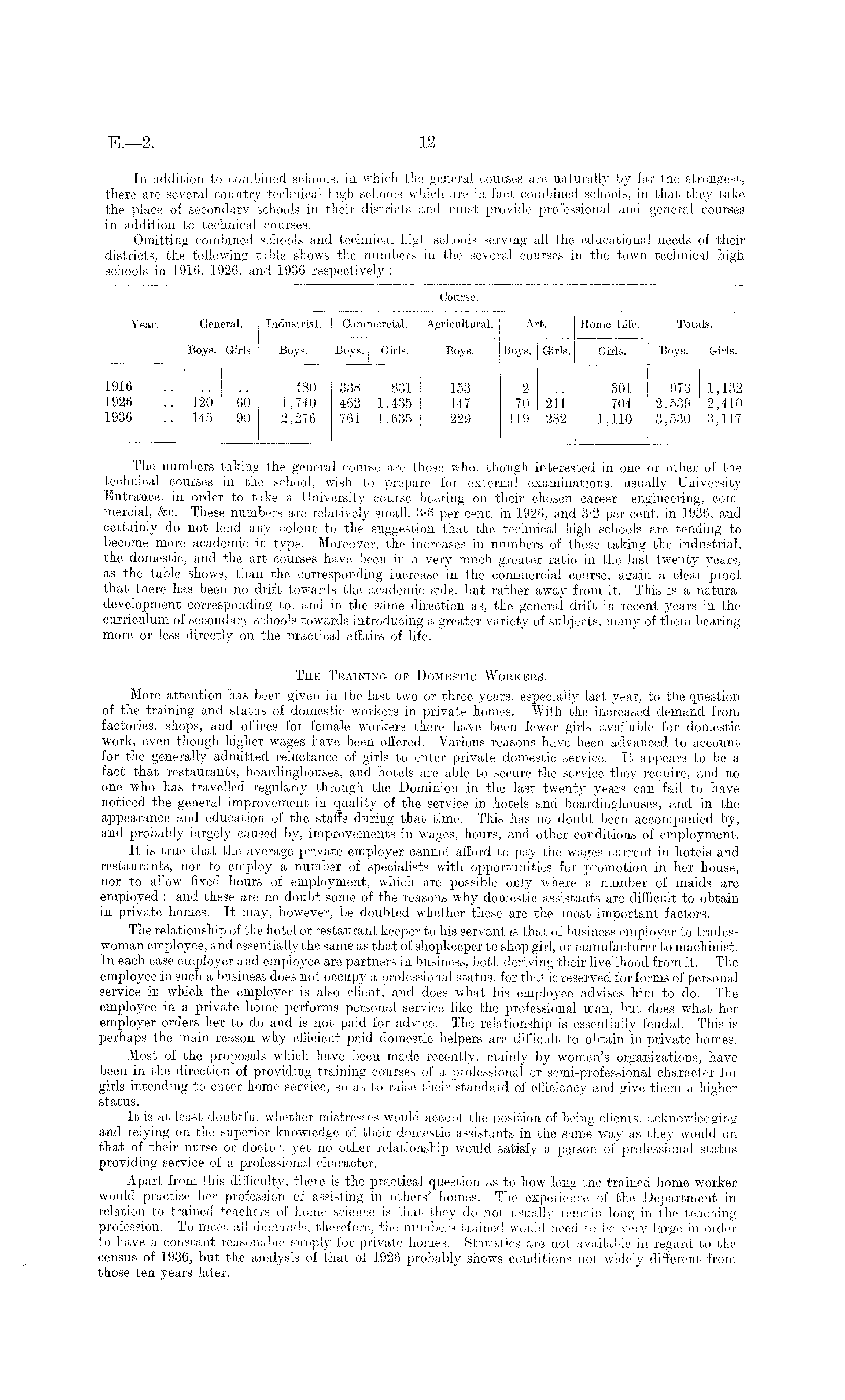 The numbers taking tlie general course are those who, though interested in one or other of the technical courses in the school, wish to prepare for external examinations, usually University Entrance, in order to take a University course bearing on their chosen career —engineering, commercial, &c. These numbers are relatively small, 3-6 per cent, in 1926, and 3-2 per cent, in 1936, and certainly do not lend any colour to the suggestion that the technical high schools are tending to become more academic in type. Moreover, the increases in numbers of those taking the industrial, the domestic, and the art courses have been in a very much greater ratio in the last twenty years, as the table shows, than the corresponding increase in the commercial course, again a clear proof that there has been no drift towards the academic side, but rather away from it. This is a natural development corresponding to, and in the sfae direction as, the general drift in recent years in the curriculum of secondary schools towards introducing a greater variety of subjects, many of them bearing more or less directly on the practical affairs of life. The Training of Domestic Workers. More attention has been given in the last two or three years, especially last year, to the question of the training and status of domestic workers in private homes. With the increased demand from factories, shops, and offices for female workers there have been fewer girls available for domestic work, even though higher wages have been offered. Various reasons have been advanced to account for the generally admitted reluctance of girls to enter private domestic service. It appears to be a fact that restaurants, boardinghouses, and hotels are able to secure the service they require, and no one who has travelled regularly through the Dominion in the last twenty years can fail to have noticed the general improvement in quality of the service in hotels and boardinghouses, and in the appearance and education of the staffs during that time. This has no doubt been accompanied by, and probably largely caused by, improvements in wages, hours, and other conditions of employment. It is true that the average private employer cannot afford to pay the wages current in hotels and restaurants, nor to employ a number of specialists with opportunities for promotion in her house, nor to allow fixed hours of employment, which are possible only where a number of maids are employed ; and these are no doubt some of the reasons why domestic assistants are difficult to obtain in private homes. It may, however, be doubted whether these are the most important factors. The relationship of the hotel or restaurant keeper to his servant is that of business employer to tradeswoman employee, and essentially the same as that of shopkeeper to shop girl, or manufacturer to machinist. In each case employer and employee are partners in business, both deriving their livelihood from it. The employee in such a business does not occupy a professional status, for that is reserved for forms of personal service in which the employer is also client, and does what his employee advises him to do. The employee in a private home performs personal service like the professional man, but does what her employer orders her to do and is not paid for advice. The relationship is essentially feudal. This is perhaps the main reason why efficient paid domestic helpers are difficult to obtain in private homes. Most of the proposals which have been made recently, mainly by women's organizations, have been in the direction of providing training courses of a professional or semi-professional character for girls intending to enter home service, so as to raise their standard of efficiency and give them a higher status. It is at least doubtful whether mistresses would accept the position of being clients, acknowledging and relying on the superior knowledge of their domestic assistants in the same way as they would on that of their nurse or doctor, yet no other relationship would satisfy a pgrson of professional status providing service of a professional character. Apart from this difficulty, there is the practical question as to how long the trained home worker would practise her profession of assisting in others' homes. The experience of the Department in relation to trained teachers of home science is that they do not usually remain long in the teaching profession. To meet all demands, therefore, the numbers trained would need to be very large in order to have a constant reasonable supply for private homes. Statistics are not available in regard to the census of 1936, but the analysis of that of 1926 probably shows conditions not widely different from those ten years later.