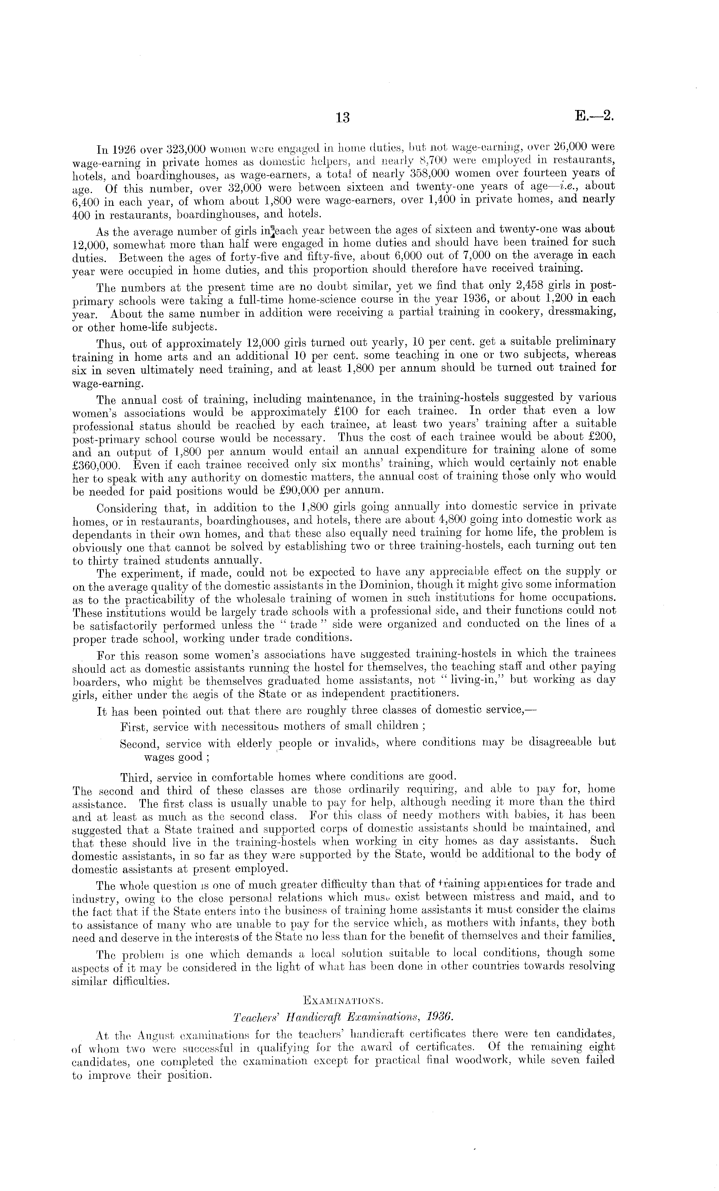 In 1926 over 323,000 women were engaged in Lome duties, but not wage-earning, over 26,000 were wage-earning in private homes as domestic helpers, and nearly 8,700 were employed in restaurants, hotels, and boardinghouses, as wage-earners, a total of nearly 358,000 women over fourteen years of age. Of this number, over 32,000 were between sixteen and twenty-one years of age —i.e., about 6,400 in each year, of whom about 1,800 were wage-earners, over 1,400 in private homes, and nearly 400 in restaurants, boardinghouses, and hotels. As the average number of girls year between the ages of sixteen and twenty-one was about 12,000, somewhat more than half were engaged in home duties and should have been trained for such duties.' Between the ages of forty-five and fifty-five, about 6,000 out of 7,000 on the average in each year were occupied in home duties, and this proportion should therefore have received training. The numbers at the present time are no doubt similar, yet we find that only 2,458 girls in postprimary schools were taking a full-time home-science course in the year 1936, or about 1,200 in each year. About the same number in addition were receiving a partial training in cookery, dressmaking, or other home-life subjects. Thus, out of approximately 12,000 girls turned out yearly, 10 per cent, get a suitable preliminary training in home arts and an additional 10 per cent, some teaching in one or two subjects, whereas six in seven ultimately need training, and at least 1,800 per annum should be turned out trained for wage-earning. The annual cost of training, including maintenance, in the training-hostels suggested by various women's associations would be approximately £100 for each trainee. In order that even a low professional status should be reached by each trainee, at least two years training after a suitable post-primary school course would be necessary. Thus the cost of each trainee would be about £200, and an output of 1,800 per annum would entail an annual expenditure for training alone of some £360,000. Even if each trainee received only six months' training, which would certainly not enable her to speak with any authority on domestic matters, the annual cost of training those only who would be needed for paid positions would be £90,000 per annum. Considering that, in addition to the 1,800 girls going annually into domestic service in private homes, or in restaurants, boardinghouses, and hotels, there are about 4,800 going into domestic work as dependants in their own homes, and that these also equally need training for home life, the problem is obviously one that cannot be solved by establishing two or three training-hostels, each turning out ten to thirty trained students annually. The experiment, if made, could not be expected to have any appreciable effect on the supply or on the average quality of the domestic assistants in the Dominion, though it might give some information as to the practicability of the wholesale training of women in such institutions for home occupations. These institutions would be largely trade schools with a professional side, and their functions could not be satisfactorily performed unless the " trade " side were organized and conducted on the lines of a proper trade school, working under trade conditions. For this reason some women's associations have suggested training-hostels in which the trainees should act as domestic assistants running the hostel for themselves, the teaching staff and other paying boarders, who might be themselves graduated home assistants, not " living-in,'' but working as day girls, either under the aegis of the State or as independent practitioners. It has been pointed out that there are roughly three classes of domestic service, — First, service with necessitous mothers of small children ; Second, service with elderly people or invalids, where conditions may be disagreeable but wages good ; Third, service in comfortable homes where conditions are good. The second and third of these classes are those ordinarily requiring, and able to pay for, home assistance. The first class is usually unable to pay for help, although needing it more than the third and at least as much as the second class. For this class of needy mothers with babies, it has been suggested that a State trained and supported corps of domestic assistants should be maintained, and that these should live in the training-hostels when working in city homes as day assistants. Such domestic assistants, in so far as they were supported by the State, would be additional to the body of domestic assistants at present employed. The whole question is one of much greater difficulty than that of training apprentices for trade and industry, owing to the close personal relations which musu exist between mistress and maid, and to the fact that if "the State enters into the business of training home assistants it must consider the claims to assistance of many who are unable to pay for the service which, as mothers with infants, they both need and deserve in the interests of the State no less than for the benefit of themselves and their families. The problem is one which demands a local solution suitable to local conditions, though some aspects of it may be considered in the light of what has been done in other countries towards resolving similar difficulties. Examinations. Teachers' Handicraft Examinations, 1936. At the August examinations for the teachers' handicraft certificates there were ten candidates, of whom two were successful in qualifying for the award of certificates. Of the remaining eight candidates, one completed the examination except for practical final woodwork, while seven failed to improve their position.