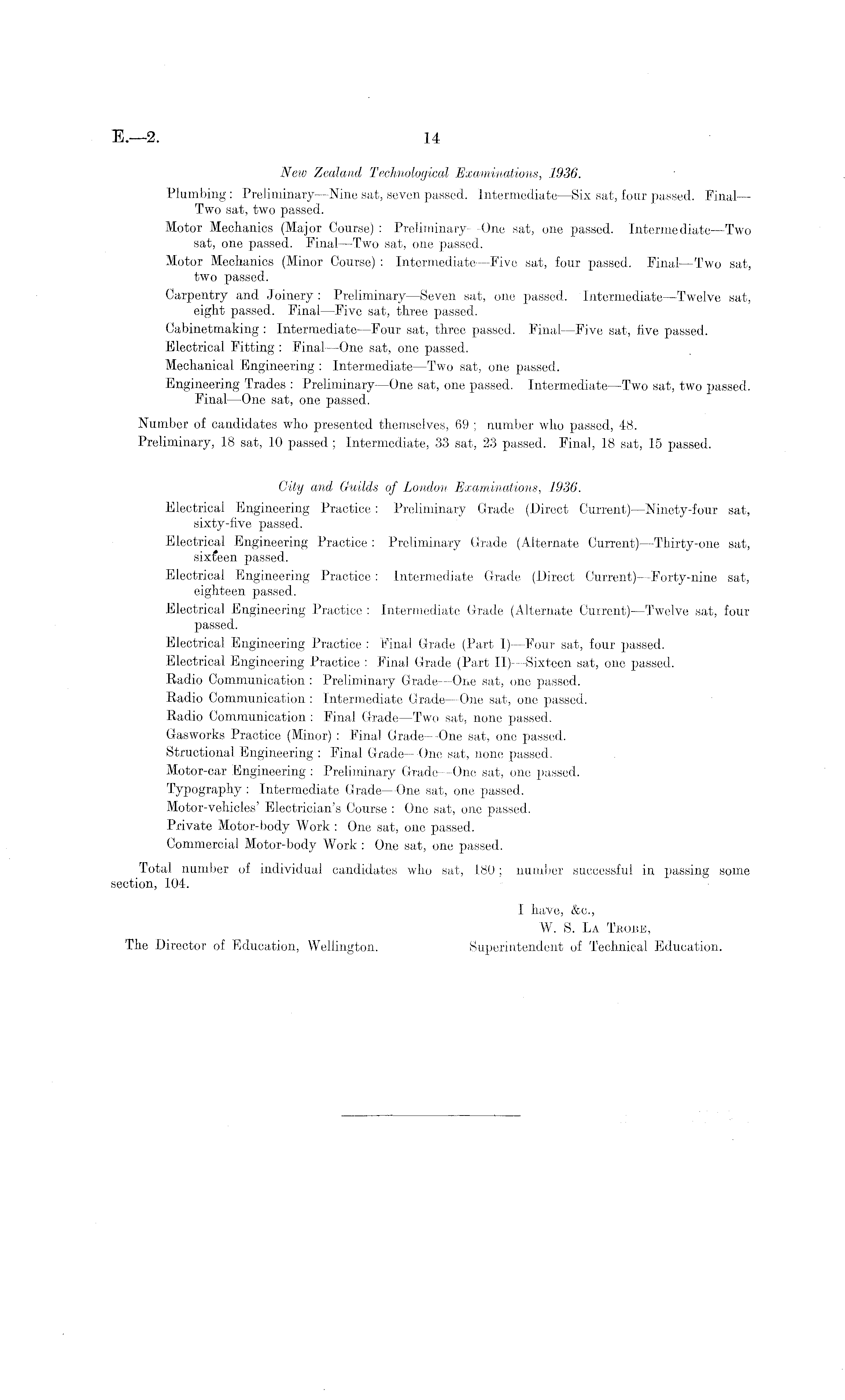 New Zealand Technological Examinations, 1936. Plumbing : Preliminary —Nine sat, seven passed. Intermediate —Six sat, four passed. Final — Two sat, two passed. Motor Mechanics (Major Course) : Preliminary—One sat, one passed. Intermediate —Two sat, one passed. Final —Two sat, one passed. Motor Mechanics (Minor Course) : Intermediate —Five sat, four passed. Final—Two sat, two passed. Carpentry and Joinery: Preliminary—Seven sat, one passed. Intermediate —Twelve sat, eight passed. Final —Five sat, three passed. Cabinetmaking : Intermediate —Four sat, three passed. Final—Five sat, five passed. Electrical Fitting : Final —One sat, one passed. Mechanical Engineering : Intermediate —Two sat, one passed. Engineering Trades : Preliminary—One sat, one passed. Intermediate —Two sat, two passed. Final —One sat, one passed. Number of candidates who presented themselves, 69 ; number who passed, 48. Preliminary, 18 sat, 10 passed ; Intermediate, 33 sat, 23 passed. Final, 18 sat, 15 passed. City and Guilds of London Examinations, 1936. Electrical Engineering Practice: Preliminary Grade (Direct Current) —Ninety-four sat, sixty-five passed. Electrical Engineering Practice : Preliminary Grade (Alternate Current) —Thirty-one sat, sixteen passed. Electrical Engineering Practice: Intermediate Grade (Direct Current) —Forty-nine sat, eighteen passed. Electrical Engineering Practice : Intermediate Grade (Alternate Current) —Twelve sat, four passed. Electrical Engineering Practice : Final Grade (Part I) —Four sat, four passed. Electrical Engineering Practice : Final Grade (Part II) —Sixteen sat, one passed. Radio Communication : Preliminary Grade —One sat, one passed. Radio Communication : Intermediate Grade —One sat, one passed. Radio Communication : Final Grade —Two sat, none passed. Gasworks Practice (Minor) : Final Grade —One sat, one passed. Structional Engineering : Final Grade —One sat, none passed. Motor-car Engineering : Preliminary Grade —One sat, one passed. Typography : Intermediate Grade—One sat, one passed. Motor-vehicles' Electrician's Course : One sat, one passed. Private Motor-body Work : One sat, one passed. Commercial Motor-body Work : One sat, one passed. Total number of individual candidates who sat, 180; number successful in passing some section, 104. I have, &c., W. S. La Trobe, The Director of Education, Wellington. Superintendent of Technical Education.