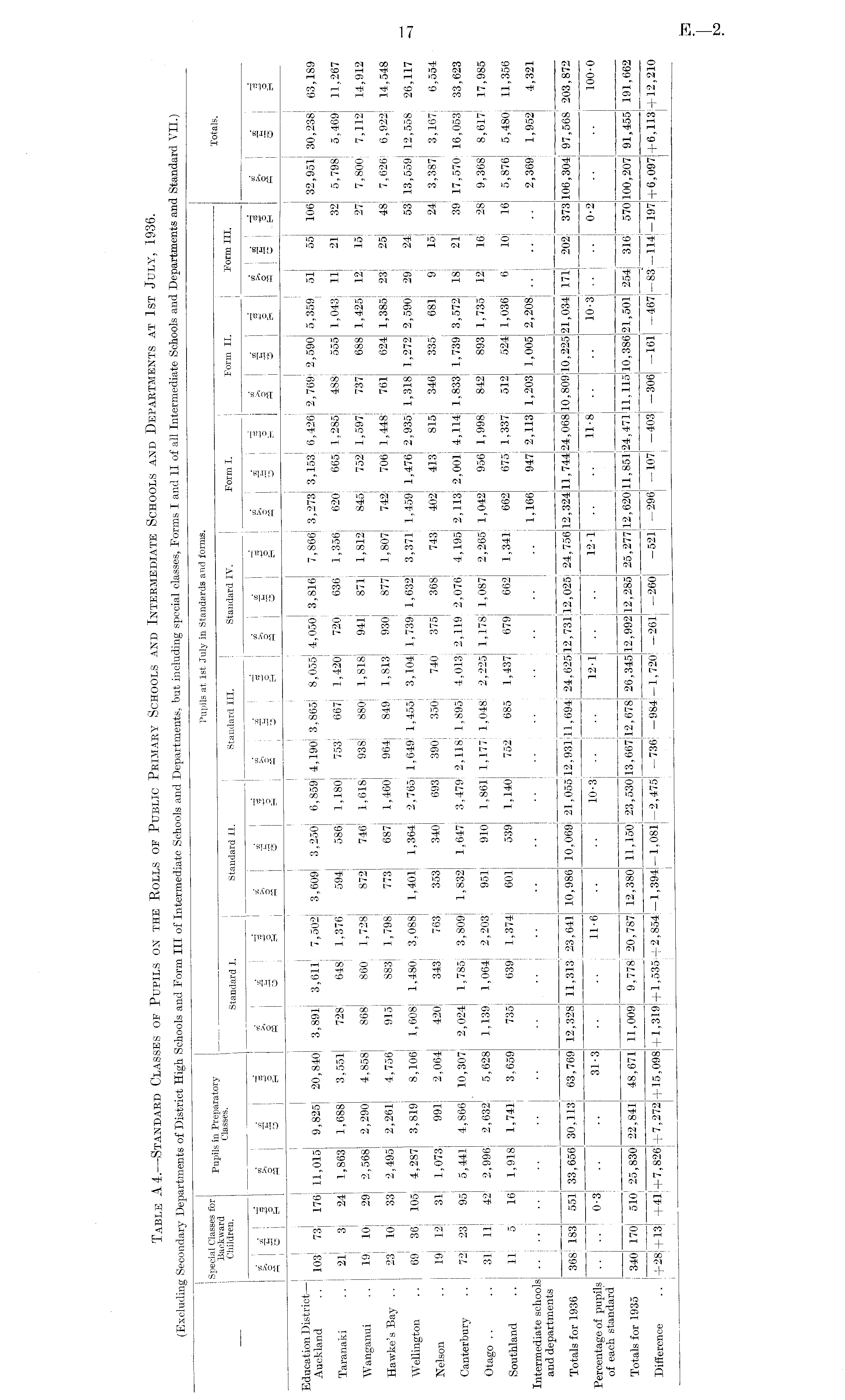 (Excluding Secondary Departments of District High Schools and Form III of Intermediate Schools and Departments, but including special classes, Forms I and II of all Intermediate Schools and Departments and Standard VII.) Pupils at 1st July in Standards and forms. Special Classes for Pupils in Preparatory _ — — Totals. Backward _ ___ Children. ' Standard I. Standard II. Standard III. Standard IV. Form I. Form II. Form III. r * ī ī 4 ī 6 i ī ī i T~ i i t lii i I i i i i i i 11 i t i 3 £ g ! g s s g S S j g 3 g g I 5 g g g a h St " Ct 103 73 176 11,015 9,825 20,840 3,891 3,611 7,502 3,609 3,250 6,859 4,190 3,865 8,055 4,050 3,816 7,866 3,273 3,153 6,426 2,769 2,590 5,359 51 55 106 32,951 30,238 63,189 Taranaki .. 21 3 24 1,863 1,688 3,551 728 648 1,376 594 586 1,180 753 667 1,420 720 636 1,356 620 665 1,285 488 555 1,043 11 21 32 5,798 5,469 11,267 Wanganui .. 19 10 29 2,568 2,290 4,858 868 860 1,728 872 746 1,618 938 880 1,818 941 871 1,812 845 752 1,597 737 688 1,425 12 15 27 7,800 7,112 14,912 Hawke's Bay .. 23 10 33 2,495 2,261 4,756 915 883 1,798 773 687 1,460 964 849 1,813 930 877 1,807 742 706 1,448 761 624 1,385 23 25 48 7,626 6,922 14,548 Wellington .. 69 36 105 4,287 3,819 8,106 1,608 1,480 3,088 1,401 1,364 2,765 1,649 1,455 3,104 1,739 1,632 3,371 1,459 1,476 2,935 1,318 1,272 2,590 29 24 53 13,559 12,558 26,117 Nelson 19 12 31 1,073 991 2,064 420 343 763 353 340 693 390 350 740 375 368 743 402 413 815 346 335 681 9 15 24 3,387 3,167 6,554 Canterbury 72 23 95 5,441 4,866 10,307 2,024 1,785 3,809 1,832 1,647 3,479 2,118 1,895 4,013 2,119 2,076 4,195 2,113 2,001 4,114 1,833 1,739 3,572 18 21 39 17,570 16,053 33,623 Otago.. 31 11 42 2,996 2,632 5,628 1,139 1,064 2,203 951 910 1,861 1,177 1,048 2,225 1,178 1,087 2,265 1,042 956 1,998 842 893 1,735 12 16 28 9,368 8,617 17,985 Southland .. 11 5 16 1,918 1,741 3,659 735 639 1,374 601 539 1,140 752 685 1,437 679 662 1,341 662 675 1,337 ol2 524 1,036 6 10 16 5,876 5,480 11,356 , , 1,166 947 2,113 1,203 1,005 2,208 2,369 1,952 4,321 Intermediate schools .... . • • • • • • • • • and departments Totals for 1936 368 183 551 33,656 30,113 63,769 12,328 11,313 23,641 10,986 10,069 21,05512,93111,694 24,62512,73112,025 24,75612,32411,744 24,06810,80910,225 21,034 171 202 373106,304 97,568 203,872 Percentageof pupils 7777 0-3 .. 7 S7~ 7 77"~7: 7 ĪŌ7~77~ 7 12-1 .. .. 12-1 .. .. 11-8 .. .. 10-3 .. .. 0-2 .. .. 100-0 of each standard Totals for 1935 7ĪŌ 170 510 25,830 22,841 48,671 11,009 9,778 20,787 12,380 11,150 23,530 13,66712,678 26,34512,99212,285 25,27712,62011,85124,47111,11510,386 21,501 254 316 570100,207 91,455 191,662 Difference .. +28+13 +41 +7,826+7,272+15,098+1,319+1,535+2,854-1,394—1,081 -2,475 -736 -984-1,720 —261 —260 -521 —296 —107 -403 —306 -161 -467—83 -114—197+6,097+6,113+12,210