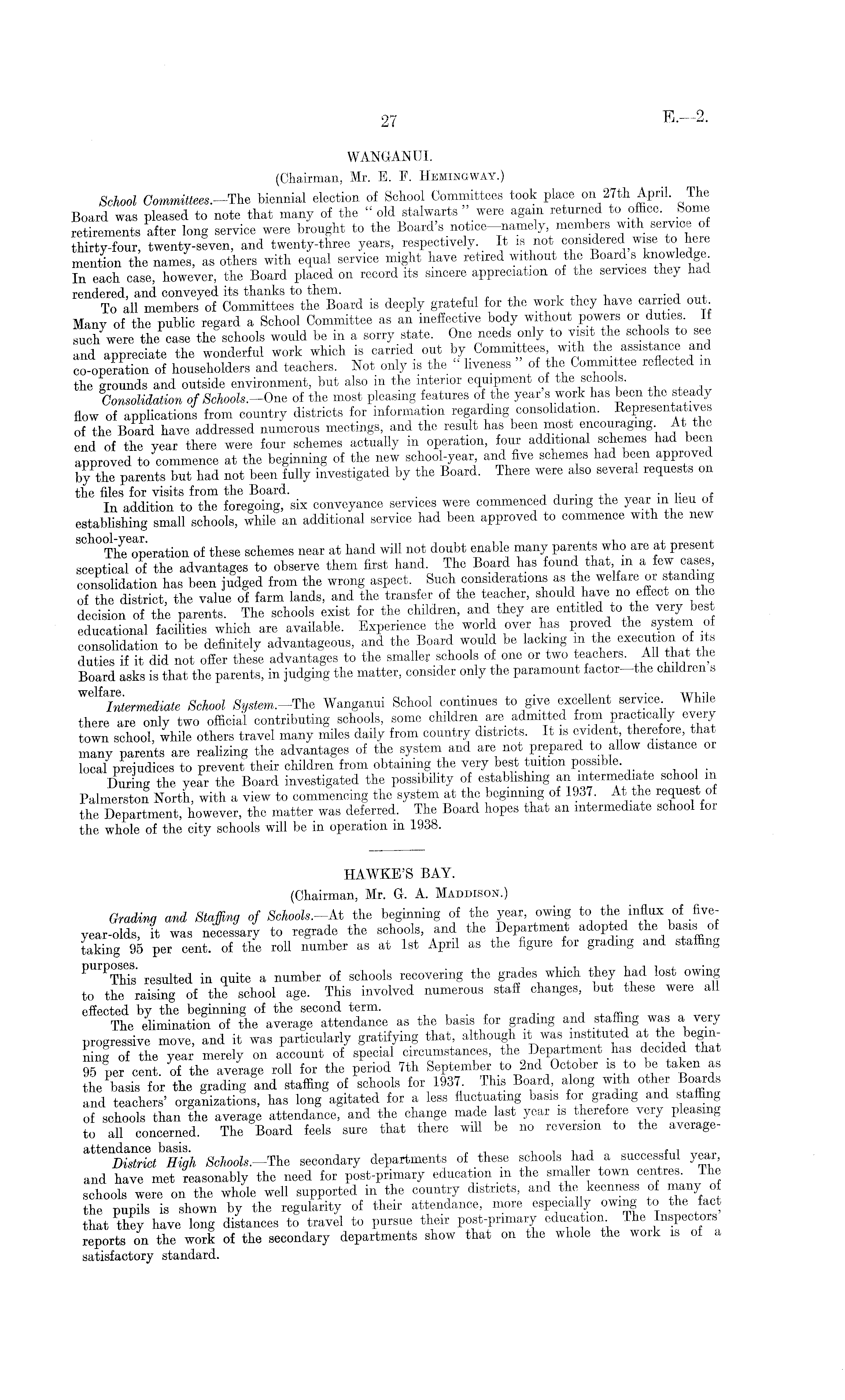WANGANUI. (Chairman, Mr. E. F. Hemingway.) School Committees.—The biennial election of School Committees took place on 27th April. The Board was pleased to note that many of the " old stalwarts " were again returned to office. Some retirements after long service were brought to the Board's notice—namely members with service of thirty-four, twenty-seven, and twenty-three years, respectively. It is not considered wise to here mention the names, as others with equal service might have retired without the Board s knowledge. In each case, however, the Board placed on record its sincere appreciation of the services they had rendered, and conveyed its thanks to them. . , To all members of Committees the Board is deeply grateful for the work they have carried out Many of the public regard a School Committee as an ineffective body without powers or duties. If such were the case the schools would be in a sorry state. One needs only to visit. the schools to see and appreciate the wonderful work which is carried out by Committees, with the assistance and co-operation of householders and teachers. Not only is the " liveness of the Committee reflected m the grounds and outside environment, but also in the interior equipment of the schools. Consolidation of Schools.—One of the most pleasing features of the year s work has been the steady flow of applications from country districts for information regarding consolidation. Representatives of the Board have addressed numerous meetings, and the result has been most encouraging. 10 end of the year there were four schemes actually in operation, four additional schemes had been approved to commence at the beginning of the new school-year and five schemes had been approved by the parents but had not been fully investigated by the Board. There were also several requests on the files for visits from the Board. . , In addition to the foregoing, six conveyance services were commenced during the year m lieu of establishing small schools, while an additional service had been approved to commence with the new The operation of these schemes near at hand will not doubt enable many parents who are at present sceptical of the advantages to observe them first hand. The Board has found that, m a few cases consolidation has been judged from the wrong aspect. Such considerations as the welfare or standing of the district, the value of farm lands, and the transfer of the teacher, should have no effect on the decision of the parents. The schools exist for the children, and they are entitled to the very best educational facilities which are available. Experience the world over has proved the system of consolidation to be definitely advantageous, and the Board would be lacking m the execution of its duties if it did not offer these advantages to the smaller schools of one or two teachers. All that the Board asks is that the parents, in judging the matter, consider only the paramount factor the children s W6lfS lntermediate School System.-The Wanganui School continues to give excellent service While there are only two official contributing schools, some children are admitted from practically every town school, while others travel many miles daily from country districts. It is evident therefore, that many parents are realizing the advantages of the system and are not prepared to allow distance or local prejudices to prevent their children from obtaining the very best tuition possible. During the year the Board investigated the possibility of establishing an intermediate school m Palmerston North, with a view to commencing the system at the beginning of 1937. At the request o the Department, however, the matter was deferred. The Board hopes that an intermediate school lor the whole of the city schools will be in operation in 1938.