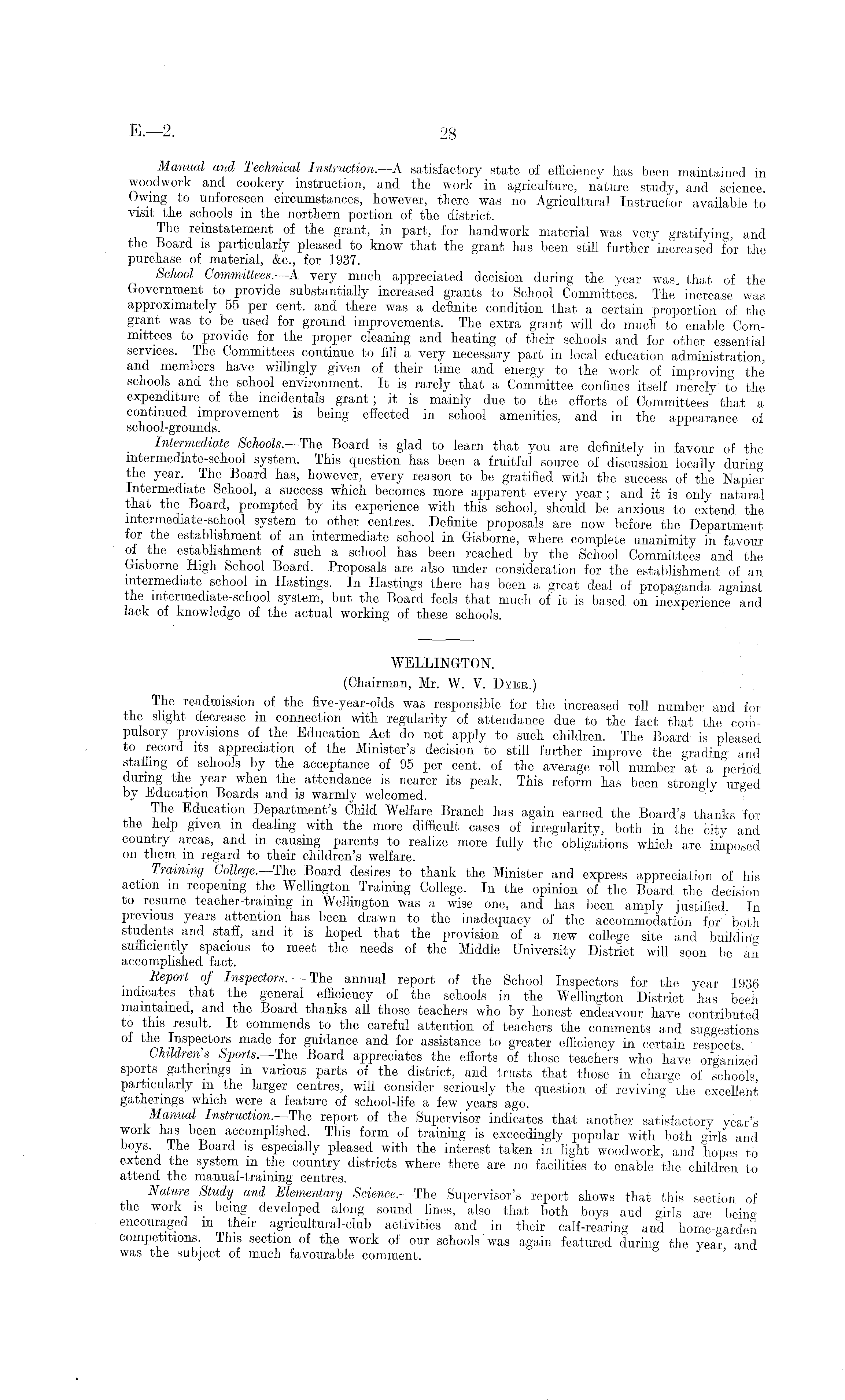 Manual and Technical Instruction. A satisfactory state of efficiency has been maintained in woodwork and cookery instruction, and the work in agriculture, nature study, and science. Owing to unforeseen circumstances, however, there was no Agricultural Instructor available to visit the schools in the northern portion of the district. The reinstatement of the grant, in part, for handwork material was very gratifying, and the Board is particularly pleased to know that the grant has been still further increased for the purchase of material, &c., for 1937. School Committees.—A very much appreciated decision during the year was. that of the Government to provide substantially increased grants to School Committees. The' increase was approximately 55 per cent, and there was a definite condition that a certain proportion of the grant was to be used for ground improvements. The extra grant will do much to enable Committees to provide for the proper cleaning and heating of their schools and for other essential services. The Committees continue to fill a very necessary part in local education administration, and members have willingly given of their time and energy to the work of improving the schools and the school environment. It is rarely that a Committee confines itself merely to the expenditure of the incidentals grant; it is mainly due to the efforts of Committees that a continued improvement is being effected in school amenities, and in the appearance of school-grounds. Intermediate Schools— The Board is glad to learn that you are definitely in favour of the intermediate-school system. This question has been a fruitful source of discussion locally during the year. The Board has, however, every reason to be gratified with the success of the Napier Intermediate School, a success which becomes more apparent every year ; and it is only natural that the Board, prompted by its experience with this school, should be anxious to extend the intermediate-school system to other centres. Definite proposals are now before the Department for the establishment of an intermediate school in Gisborne, where complete unanimity in favour of the establishment of such a school has been reached by the School Committees and the Gisborne High School Board. Proposals are also under consideration for the establishment of an intermediate school in Hastings. In Hastings there has been a great deal of propaganda against the intermediate-school system, but the Board feels that much of it is based on inexperience and lack of knowledge of the actual working of these schools.