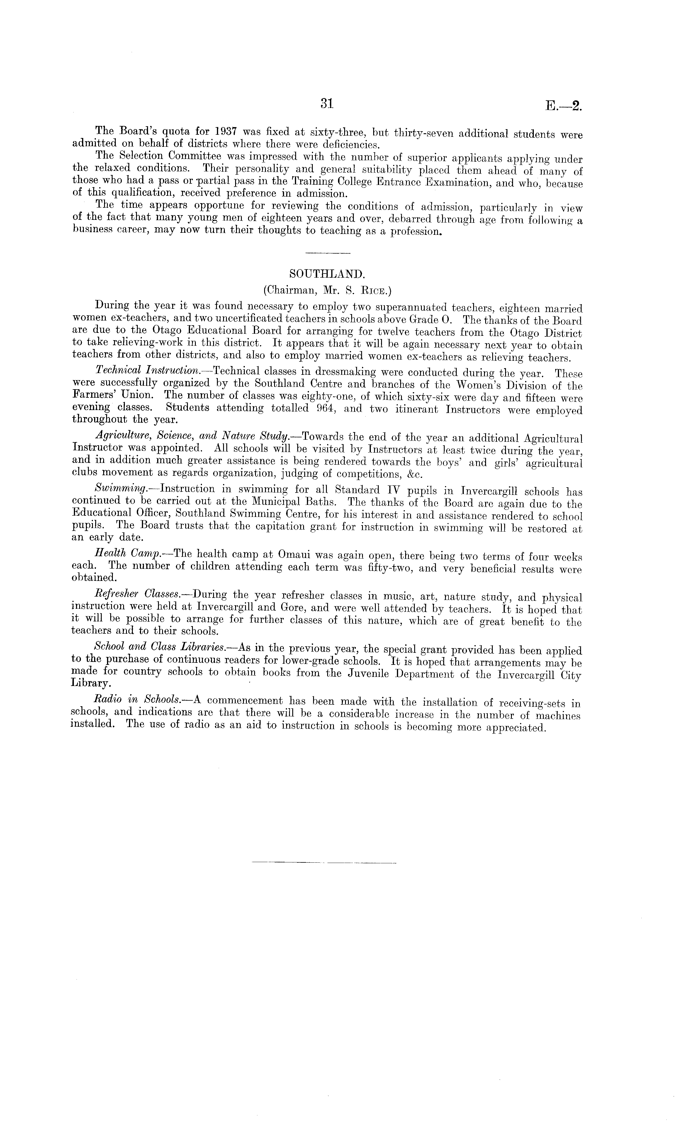 The Board's quota for 1937 was fixed at sixty-three, but thirty-seven additional students were admitted on behalf of districts where there were deficiencies. The Selection Committee was impressed with the number of superior applicants applying under the relaxed conditions. Their personality and general suitability placed them ahead of many of those who had a pass or partial pass in the Training College Entrance Examination, and who, because of this qualification, received preference in admission. The time appears opportune for reviewing the conditions of admission, particularly in view of the fact that many young men of eighteen years and over, debarred through age from following a business career, may now turn their thoughts to teaching as a profession.