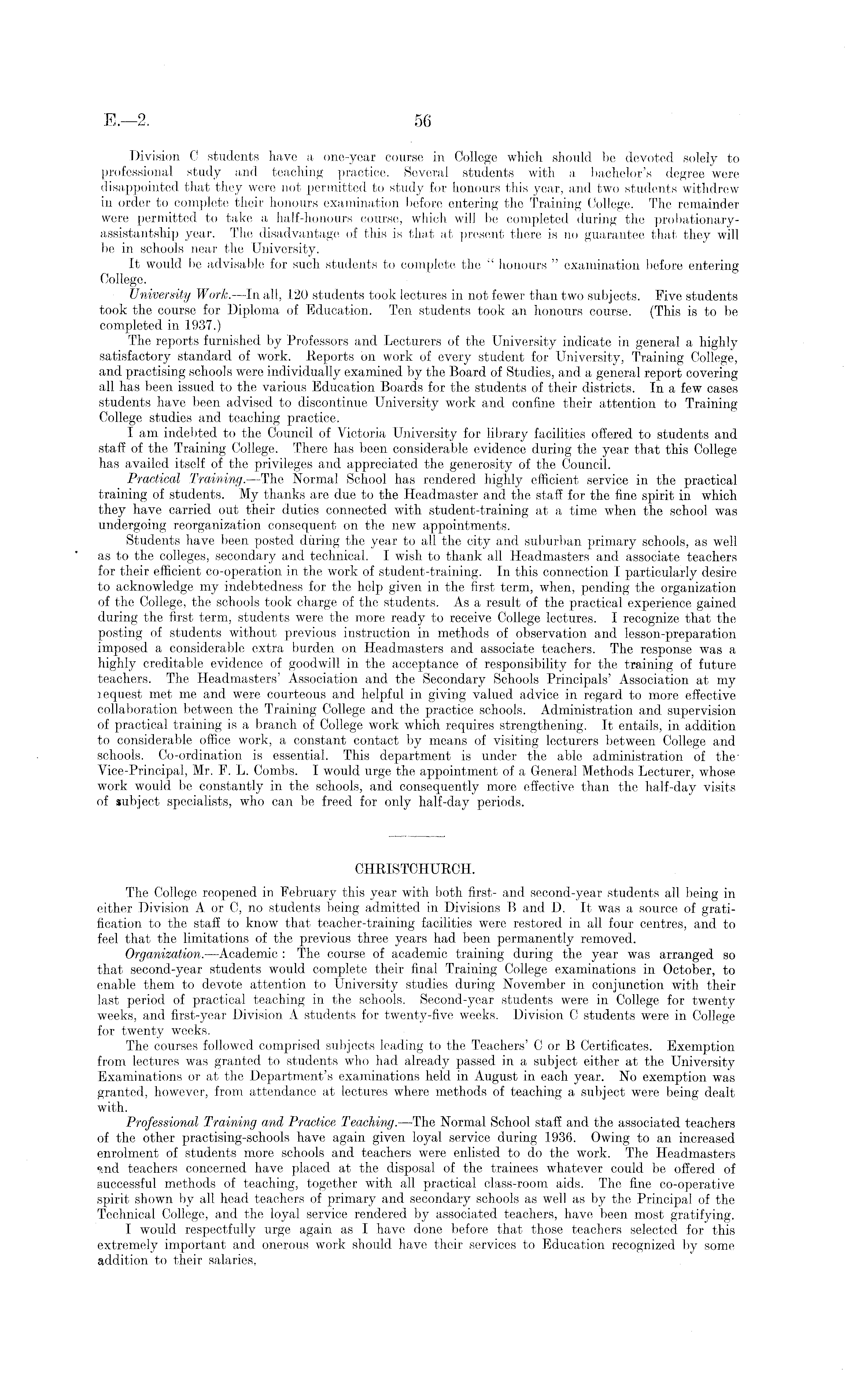 CHRISTCHURCH. The College reopened in February this year with both first- and second-year students all being in either Division A. or C, no students being admitted in Divisions B and D. It was a source of gratification to the staff to know that teacher-training facilities were restored in all four centres, and to feel that the limitations of the previous three years had been permanently removed. Organization.—Academic : The course of academic training during the year was arranged so that second-year students would complete their final Training College examinations in October, to enable them to devote attention to University studies during November in conjunction with their last period of practical teaching in the schools. Second-year students were in College for twenty weeks, and first-year Division A students for twenty-five weeks. Division C students were in College for twenty weeks. The courses followed comprised subjects leading to the Teachers' Cor B Certificates. Exemption from lectures was granted to students who had already passed in a subject either at the University Examinations or at the Department's examinations held in August in each year. No exemption was granted, however, from attendance at lectures where methods of teaching a subject were being dealt with. Professional Training and Practice Teaching.—The Normal School staff and the associated teachers of the other practising-schools have again given loyal service during 1936. Owing to an increased enrolment of students more schools and teachers were enlisted to do the work. The Headmasters ind teachers concerned have placed at the disposal of the trainees whatever could be offered of successful methods of teaching, together with all practical class-room aids. The fine co-operative spirit shown by all head teachers of primary and secondary schools as well as by the Principal of the Technical College, and the loyal service rendered by associated teachers, have been most gratifying. I would respectfully urge again as I have done before that those teachers selected for this extremely important and onerous work should have their services to Education recognized by some addition to their salaries,