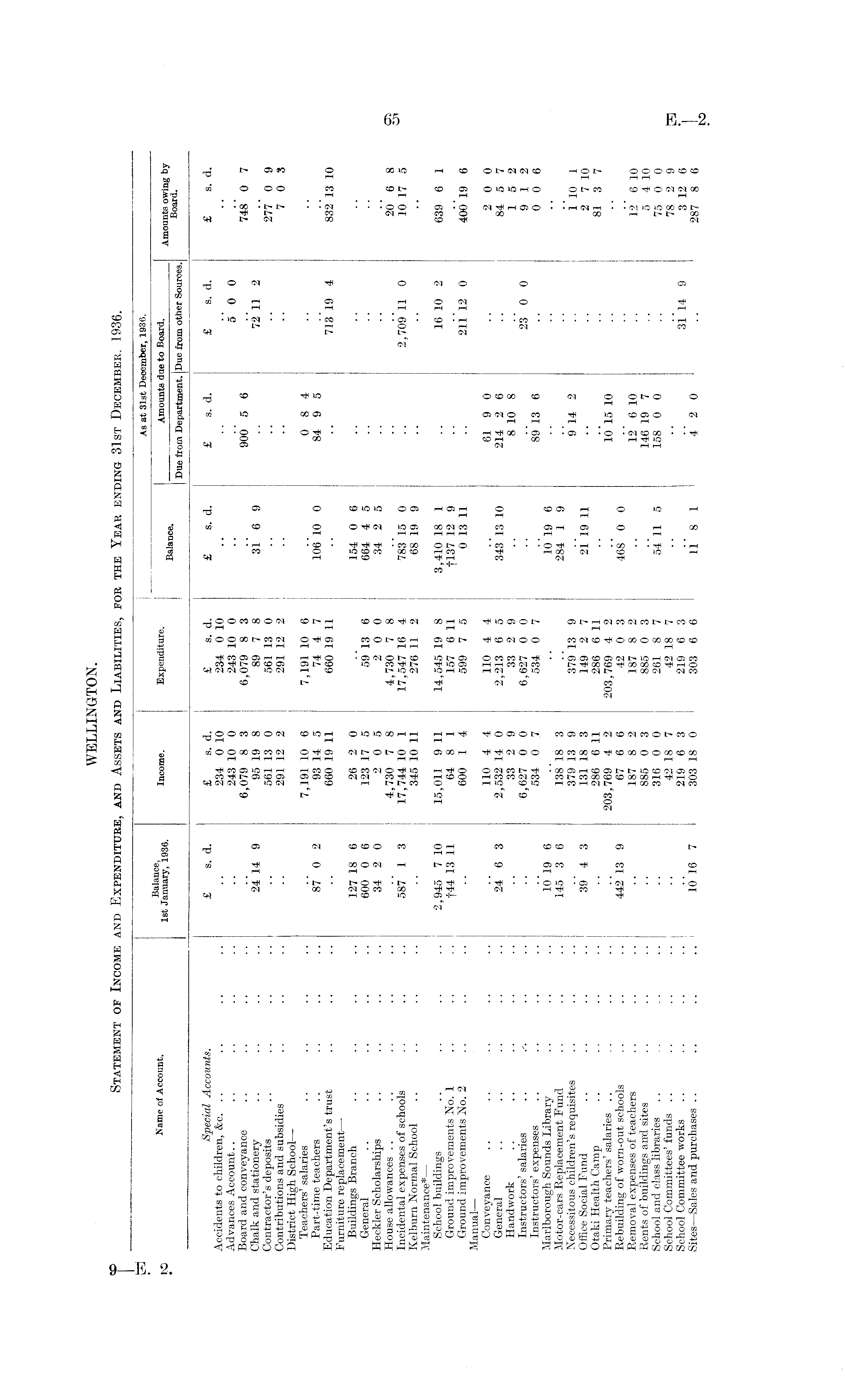 As at 31st December, 1936. Same of Account. 1st JanS?y, e i936. Income. Expenditure. Amounts due to Board. Amounts owing by valance. Board Due from Department. Due from other Sources. Special Accounts. £ s. d. £ s. d. £ s. d. £ s. d. £ s. d. £ s. d. £ s. d. Accidents to children, &c. .. .. .. .. .. 234 0 10 234 0 10 Advances Account.. .. .. .. .. .. 243 10 0 243 10 0 .. .. 5 0 0 Board and conveyance .. .. .. .. .. 6,079 8 3 6,079 8 3 .. 900 5 6 .. 748 0 7 Chalk and stationery .. .. .. .. 24 14 9 95 19 8 89 7 8 31 6 9 .. 72 11 2 Contractor's deposits .. .. .. .. .. 561 13 0 561 13 0 .. .. .. 277 0 9 Contributions and subsidies .. .. .. .. 291 12 2 291 12 2 .. .. .. 7 0 3 District High School — Teachers' salaries .. .. .. .. .. 7,191 10 6 7,191 10 6 .. 0 8 4 Part-time teachers .. .. .. .. 87 0 2 93 14 5 74 4 7 106 10 0 84 9 5 Education Department's trust .. .. .. .. 660 19 11 660 19 11 .. .. 713 19 4 832 13 10 Furniture replacement — Buildings Branch .. .. .. .. 127 18 6 26 2 0 .. 154 0 6 General .. .. .. .. .. 600 0 6 123 17 5 59 13 6 664 4 5 Heckler Scholarships .. .. .. .. 34 20 205 200 34 25 House allowances .. .. .. .. .. .. 4,730 7 8 4,730 7 8 .. .. .. 20 6 8 Incidental expenses of schools .. .. .. 587 1 3 17,744 10 1 17,547 16 4 783 15 0 .. 2,709 11 0 10 17 5 Kelburn Normal School .. .. .. .. .. 345 10 11 276 11 2 68 19 9 Maintenance* — School buildings .. .. .. .. 2,945 7 10 15,011 9 11 14,545 19 8 3,410 18 1 .. 16 10 2 639 6 1 Ground improvements No. X .. .. .. f44 13 11 64 8 1 157 6 11 fl37 12 9 Ground improvements No. 2 .. .. .. .. 600 1 4 599 7 5 0 13 11 .. 211 12 0 400 19 6 Manual — Conveyance .. .. .. .. .. .. 110 44 110 44 .. 61 90 .. 200 General .. .. .. .. .. 24 6 3 2,532 14 0 2,213 6 5 343 13 10 214 2 6 .. 84 5 7 Handwork .. .. .. .. .. .. 33 29 33 29 .. 8 10 8 .. 152 Instructors' salaries .. .-. .. .. .. 6,62700 6,62700 .. .. 23 00 912 Instructors' expenses .. .. .. .. .. 534 0 7 534 0 7 .. 89 13 6 .. 0 0 6 Marlborough Sounds Library .. .. .. 10 19 6 .. .. 10 19 6 Motor-cars Replacement Fund .. .. .. 145 3 6 138 18 3 .. 284 1 9 Necessitous children's requisites .. .. .. .. 379 13 9 379 13 9 .. 9 14 2 .. 1 10 1 Office Social Fund .. .. .. .. 39 4 3 131 18 3 149 2 7 21 19 11 .. .. 2 7 10 Otaki Health Camp .. .. .. .. .. 286 6 11 286 6 11 .. .. .. 81 3 7 Primary teachers' salaries .. .. .. .. .. 203,769 4 2 203,769 4 2 .. 10 15 10 Rebuilding of worn-out schools .. .. .. 442 13 9 67 6 6 42 0 3 468 0 0 Removal expenses of teachers .. .. .. .. 187 8 2 187 8 2 .. 12 6 10 .. 12 6 10 Rents of buildings and sites . . .. .. .. 885 0 3 885 0 3 .. 146 19 7 .. 5 4 10 School and class libraries .. . . .. .. .. 316 0 0 261 8 7 54 11 5 158 0 0 .. 75 0 0 School Committees' funds .. .. .. .. .. 42 18 7 42 18 7 .. .. .. 78 2 9 School Committee works .. .. .. .. .. 219 6 3 219 6 3 .. .. 31 14 9 3 12 6 Sites —Sales and purchases .. .. .. .. 1 10 16 7 303 18 0 303 66 11 81 420 .. 287 8 6