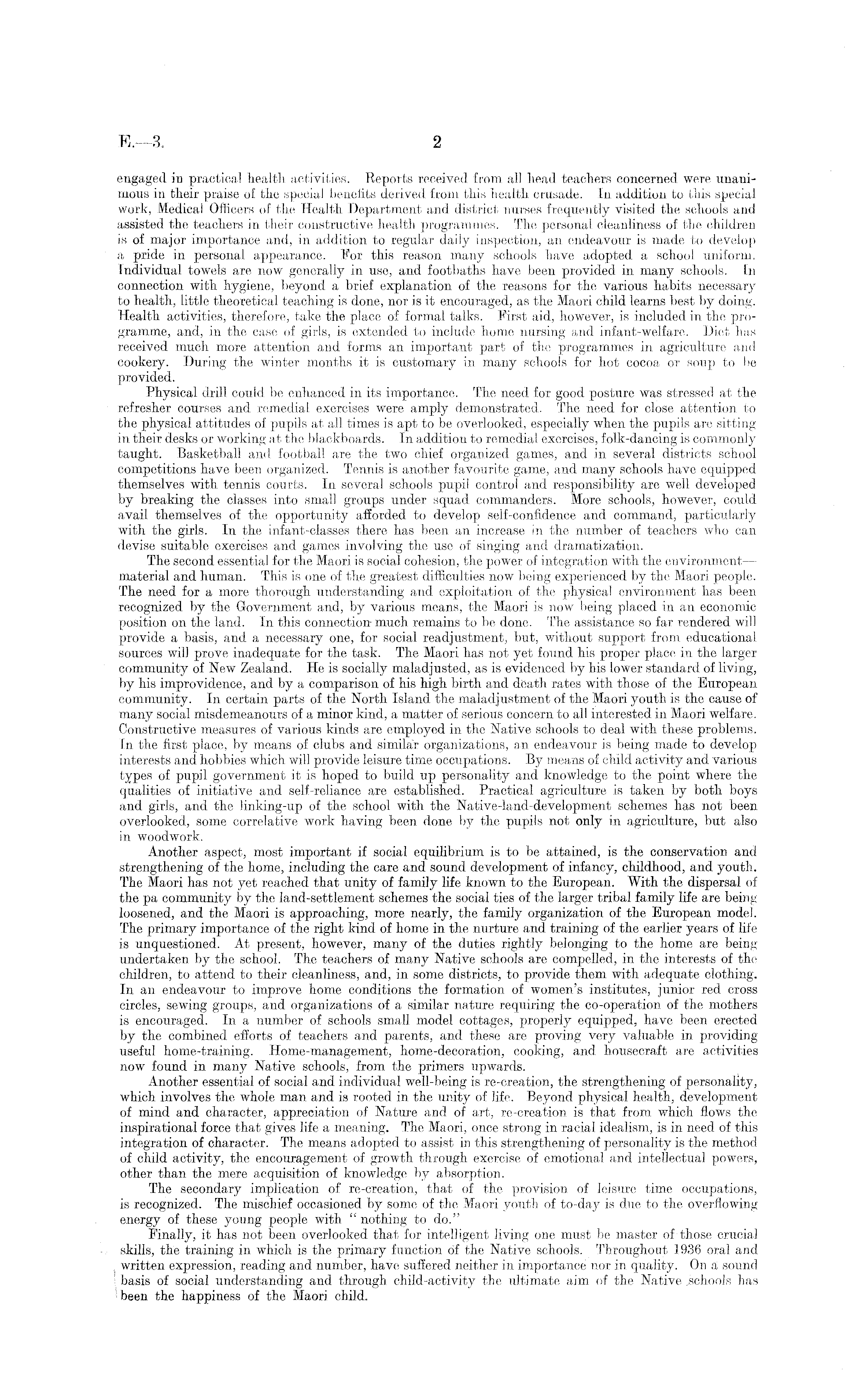engaged in practical health activities. Reports received from all head teachers concerned were unanimous in their praise of the special benefits derived from this health crusade. In addition to this special work, Medical Officers of the Health Department and district nurses frequently visited the schools and assisted the teachers in their constructive health programmes. The personal cleanliness of the children is of major importance and, in addition to regular daily inspection, an endeavour is made to develop a pride in personal appearance. For this reason many schools have adopted a school uniform. Individual towels are now generally in use, and footbaths have been provided in many schools. In connection with hygiene, beyond a brief explanation of the reasons for the various habits necessary to health, little theoretical teaching is done, nor is it encouraged, as the Maori child learns best by doing. Health activities, therefore, take the place of formal talks. First aid, however, is included in the programme, and, in the case of girls, is extended to include home nursing and infant-welfare. Diet has received much more attention and forms an important part of the programmes in agriculture and cookery. During the winter months it is customary in many schools for hot cocoa or soup to be provided. Physical drill could be enhanced in its importance. The need for good posture was stressed at the refresher courses and remedial exercises were amply demonstrated. The need for close attention to the physical attitudes of pupils at all times is apt to be overlooked, especially when the pupils are sitting in their desks or working at the blackboards. In addition to remedial exercises, folk-dancing is commonly taught. Basketball and football are the two chief organized games, and in several districts school competitions have been organized. Tennis is another favourite game, and many schools have equipped themselves with tennis courts. In several schools pupil control and responsibility are well developed by breaking the classes into small groups under squad commanders. More schools, however, could avail themselves of the opportunity afforded to develop self-confidence and command, particularly with the girls. In the infant-classes there has been an increase in the number of teachers who can devise suitable exercises and games involving the use of singing and dramatization. The second essential for the Maori is social cohesion, the power of integration with the environment — material and human. This is one of the greatest difficulties now being experienced by the Maori people. The need for a more thorough understanding and exploitation of the physical environment has been recognized by the Government and, by various means, the Maori is now being placed in an economic position on the land. In this connection much remains to be done. The assistance so far rendered will provide a basis, and a necessary one, for social readjustment, but, without support from educational, sources will prove inadequate for the task. The Maori has not yet found his proper place in the larger community of New Zealand. He is socially maladjusted, as is evidenced by his lower standard of living, by his improvidence, and by a comparison of his high birth and death rates with those of the European community. In certain parts of the North Island the maladjustment of the Maori youth is the cause of many social misdemeanours of a minor kind, a matter of serious concern to all interested in Maori welfare. Constructive measures of various kinds are employed in the Native schools to deal with these problems. In the first place, by means of clubs and similar organizations, an endeavour is being made to develop interests and hobbies which will provide leisure time occupations. By means of child activity and various types of pupil government it is hoped to build up personality and knowledge to the point where the qualities of initiative and self-reliance are established. Practical agriculture is taken by both boys and girls, and the linking-up of the school with the Native-land-development schemes has not been overlooked, some correlative work having been done by the pupils not only in agriculture, but also in woodwork. Another aspect, most important if social equilibrium is to be attained, is the conservation and strengthening of the home, including the care and sound development of infancy, childhood, and youth. The Maori has not yet reached that unity of family life known to the European. With the dispersal of the pa community by the land-settlement schemes the social ties of the larger tribal family life are beingloosened, and the Maori is approaching, more nearly, the family organization of the European model. The primary importance of the right kind of home in the nurture and training of the earlier years of life is unquestioned. At present, however, many of the duties rightly belonging to the home are being undertaken by the school. The teachers of many Native schools are compelled, in the interests of the children, to attend to their cleanliness, and, in some districts, to provide them with adequate clothing. In an endeavour to improve home conditions the formation of women's institutes, junior red cross circles, sewing groups, and organizations of a similar nature requiring the co-operation of the mothers is encouraged. In a number of schools small model cottages, properly equipped, have been erected by the combined efforts of teachers and parents, and these are proving very valuable in providing useful home-training. Home-management, home-decoration, cooking, and housecraft are activities now found in many Native schools, from the primers upwards. Another essential of social and individual well-being is re-creation, the strengthening of personality, which involves the whole man and is rooted in the unity of life. Beyond physical health, development of mind and character, appreciation of Nature and of art, re-creation is that