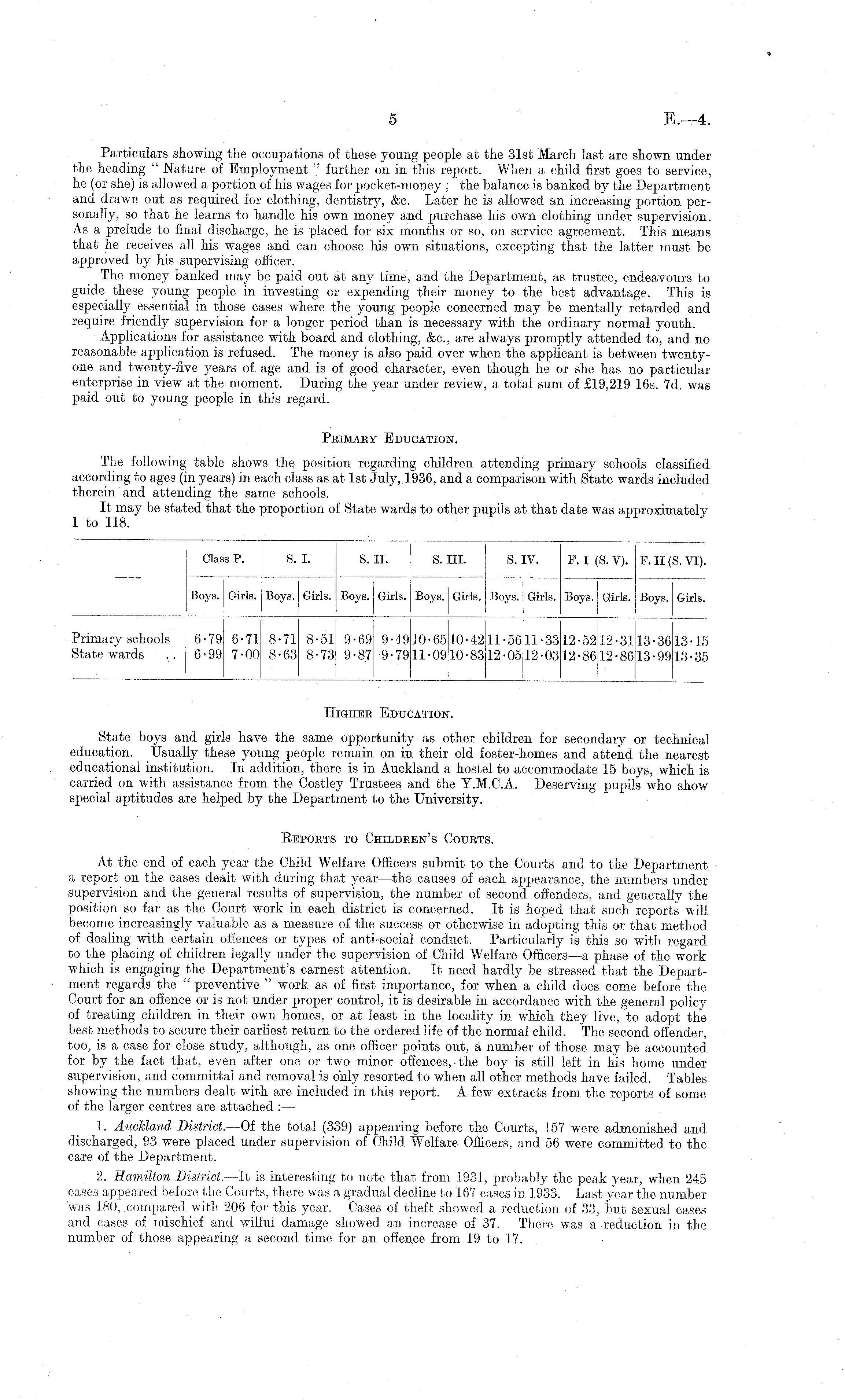 Particulars showing the occupations of these young people at the 31st March last are shown under the heading " Nature of Employment " further on in this report. When a child first goes to service, he (or she) is allowed a portion of his wages for pocket-money ; the balance is banked by the Department and drawn out as required for clothing, dentistry, &c. Later he is allowed an increasing portion personally, so that he learns to handle his own money and purchase his own clothing under supervision. As a prelude to final discharge, he is placed for six months or so, on service agreement. This means that he receives all his wages and can choose his own situations, excepting that the latter must be approved by his supervising officer. The money banked may be paid out at any time, and the Department, as trustee, endeavours to guide these young people in investing or expending their money to the best advantage. This is especially essential in those cases where the young people concerned may be mentally retarded and require friendly supervision for a longer period than is necessary with the ordinary normal youth. Applications for assistance with board and clothing, &c., are always promptly attended to, and no reasonable application is refused. The money is also paid over when the applicant is between twentyone and twenty-five years of age and is of good character, even though he or she has no particular enterprise in view at the moment. During the year under review, a total sum of £19,219 16s. 7d. was paid out to young people in this regard. Pbimary Education. The following table shows position regarding children attending primary schools classified according to ages (in years) in each class as at Ist July, 1936, and a comparison with State wards included therein and attending the same schools. It may be stated that the proportion of State wards to other pupils at that date was approximately 1 to 118.