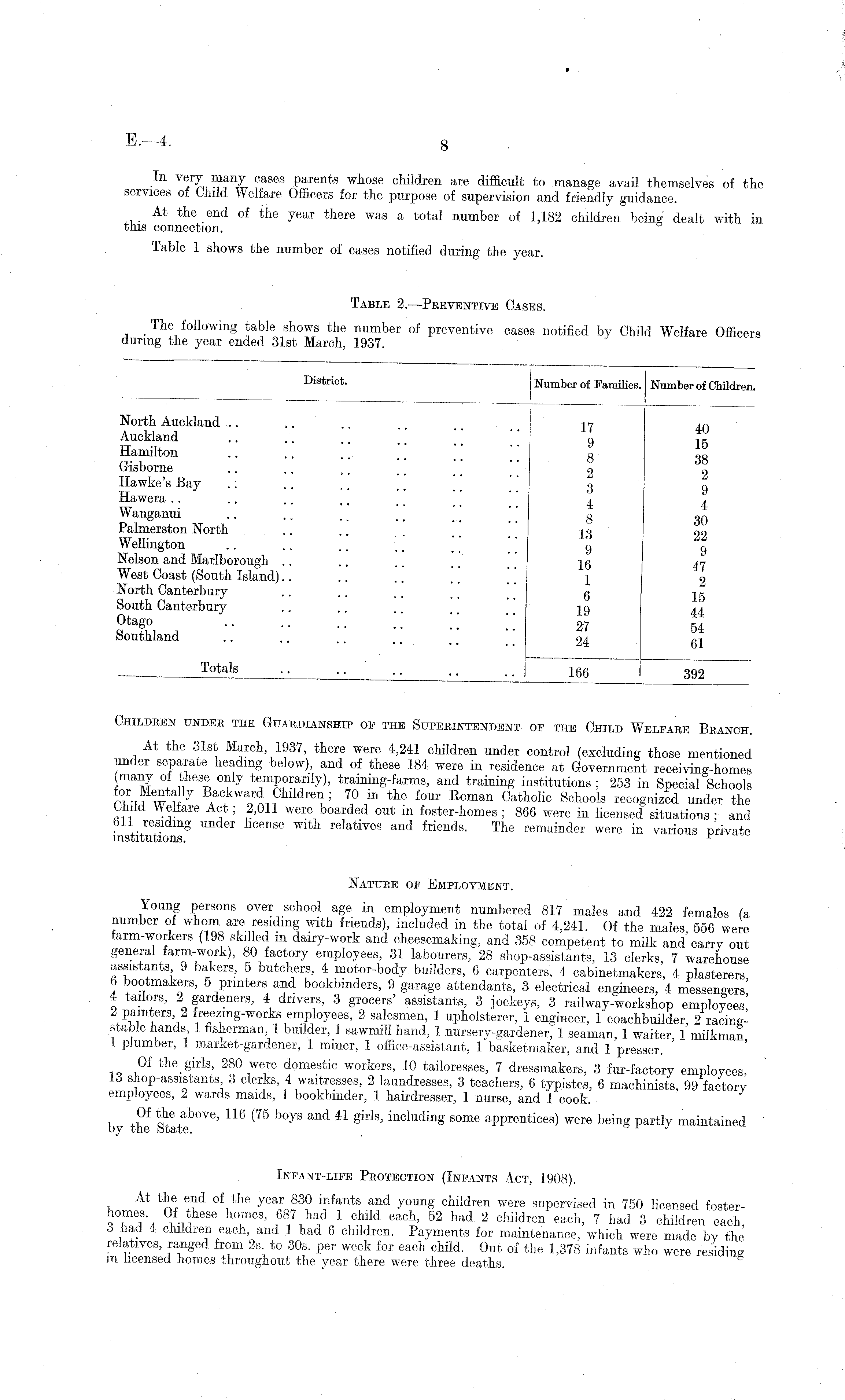 In v ® r y man y cases Parents whose children are difficult to manage avail themselves of the services of Child Welfare Officers for the purpose of supervision and friendly guidance. At the end of the year there was a total number of 1,182 children being dealt with in this connection. Table 1 shows the number of cases notified during the year. Table 2. —Preventive Cases. The following table shows the number of preventive cases notified by Child Welfare Officers during the year ended 31st March, 1937.