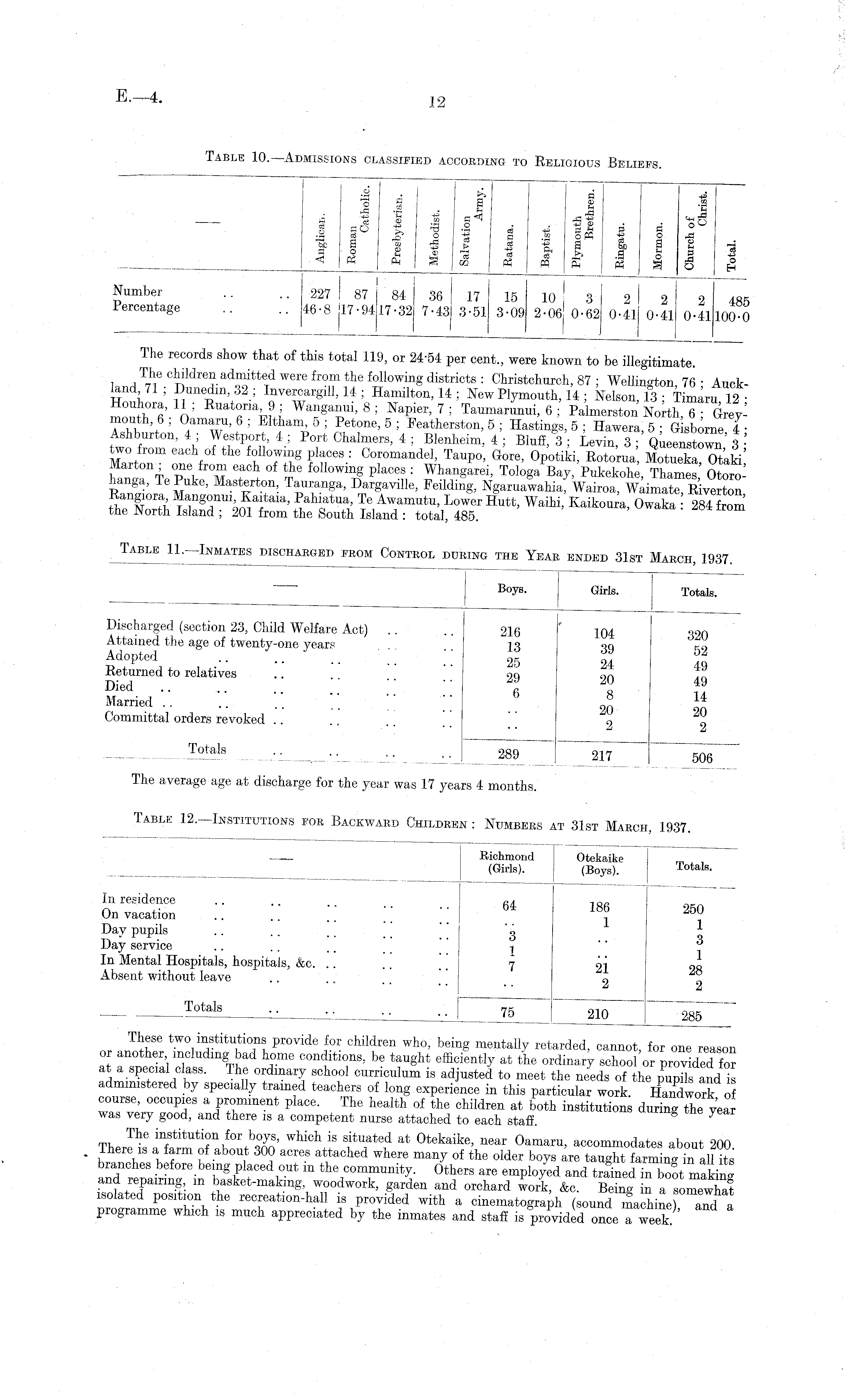 Boys. Girls. Totals. . 1 _ 1 Discharged (section 23, Child Welfare Act) .. .. 216 ' 104 320 Attained the age of twenty-one years 13 on sl) Adopted .. ' "ok Si T) 1 T . 1 . * • • • • • • • 25 24 4Q Keturned to relatives .. on on 7^ Died Z 2 ° 49 Married ....... " go 9^ Committal orders revoked .. .. . . " 9 1 Totals 289 217 506 The average age at discharge for the year was 17 years 4 months. Table 12. Institutions for Backward Children : Numbers at 31st March, 1937. I Richmond j Otekaike I , (Girls). j (Boys). Totals. :: ;; -| 64 > 8 « Day pupils .. .. .. ,. .. 3 * Day service ••.... 1 1 '' In Mental Hospitals, hospitals, &c. .. .. ." j 7 21 9S Absent without leave ...... j 2 2 ; •• 1 75 210 j 285~
