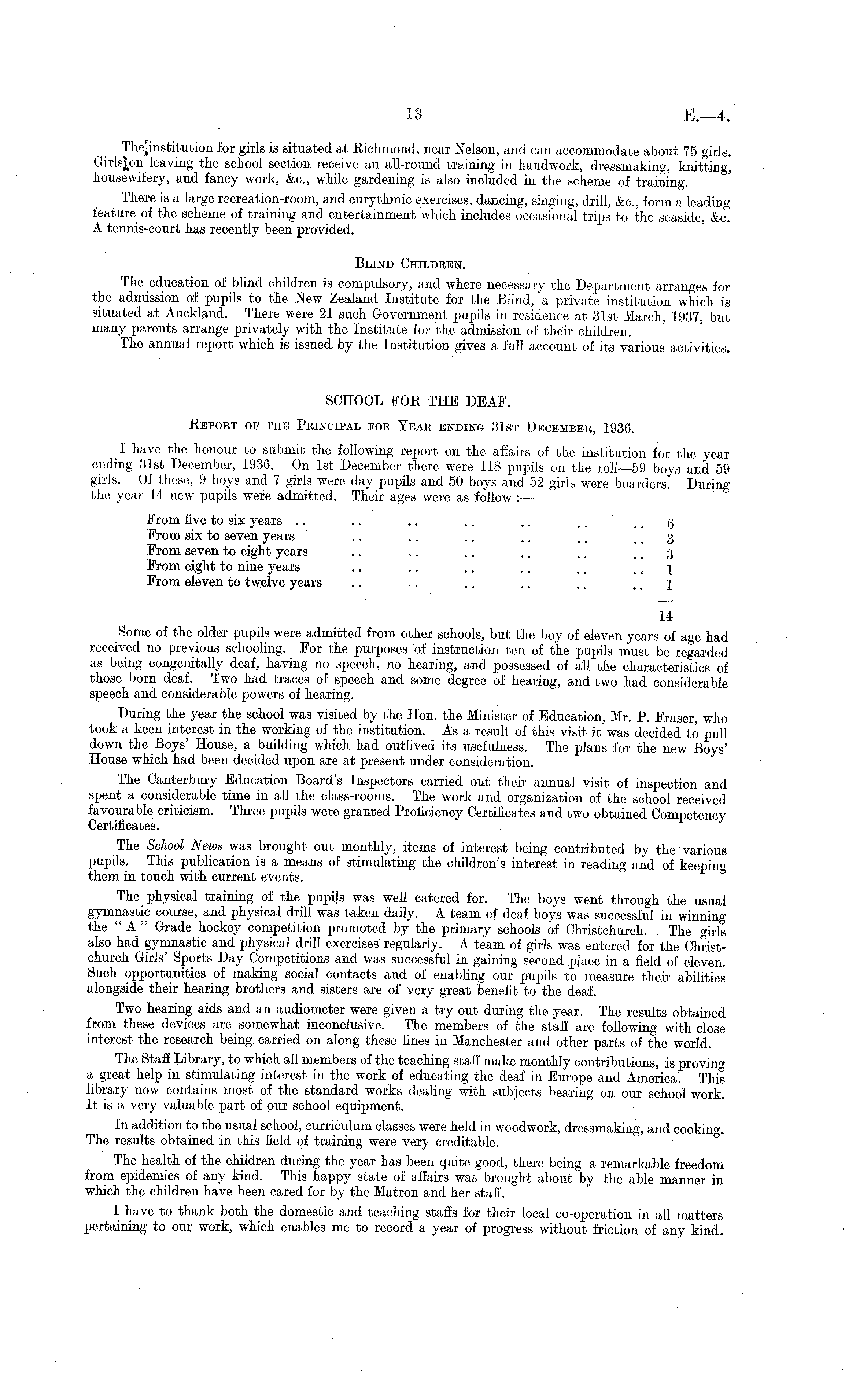 for girls is situated at Richmond, near Nelson, and can accommodate about 75 girls. Girlsjon leaving the school section receive an all-round training in handwork, dressmaking, knitting, housewifery, and fancy work, &c., while gardening is also included in the scheme of training. There is a large recreation-room, and eurythmic exercises, dancing, singing, drill, &c., form a leading feature of the scheme of training and entertainment which includes occasional trips to the seaside, &c. A tennis-court has recently been provided. Blind Children. The education of blind children is compulsory, and where necessary the Department arranges for the admission of pupils to the New Zealand Institute for the Blind, a private institution which is situated at Auckland. There were 21 such Government pupils in residence at 31st March, 1937, but many parents arrange privately with the Institute for the admission of their children. The annual report which is issued by the Institution gives a full account of its various activities. SCHOOL FOR THE DEAF. Report of the Principal for Year ending 31st December, 1936. I have the honour to submit the following report oil the affairs of the institution for the year ending 31st December, 1936. On Ist December there were 118 pupils on the r011—59 boys and 59 girls. Of these, 9 boys and 7 girls were day pupils and 50 boys and 52 girls were boarders. During the year 14 new pupils were admitted. Their ages were as follow:— From five to six years .. .. .. .. .. ~ .. 6 From six to seven years .. .. .. .. .. .. 3 From seven to eight years .. .. .. .. .. .. 3 From eight to nine years .. .. .. .. .. .. 1 From eleven to twelve years .. .. .. .. .. .. 1 14 Some of the older pupils were admitted from other schools, but the boy of eleven years of age had received no previous schooling. For the purposes of instruction ten of the pupils must be regarded as being congenitally deaf, having no speech, no hearing, and possessed of ail the characteristics of those born deaf. Two had traces of speech and some degree of hearing, and two had considerable speech and considerable powers of hearing. During the year the school was visited by the Hon. the Minister of Education, Mr. P. Fraser, who took a keen interest in the working of the institution. As a result of this visit it was decided to pull down the Boys' House, a building which had outlived its usefulness. The plans for the new Boys' House which had been decided upon are at present under consideration. The Canterbury Education Board's Inspectors carried out their annual visit of inspection and spent a considerable time in all the class-rooms. The work and organization of the school received favourable criticism. Three pupils were granted Proficiency Certificates and two obtained Competency Certificates. The School News was brought out monthly, items of interest being contributed by the various pupils. This publication is a means of stimulating the children's interest in reading and of keeping them in touch with current events. The physical training of the pupils was well catered for. The boys went through the usual gymnastic course, and physical drill was taken daily. A team of deaf boys was successful in winning the "A " Grade hockey competition promoted by the primary schools of Christchurch. The girls also had gymnastic and physical drill exercises regularly. A team of girls was entered for the Christchurch Girls' Sports Day Competitions and was successful in gaining second place in a field of eleven. Such opportunities of making social contacts and of enabling our pupils to measure their abilities alongside their hearing brothers and sisters are of very great benefit to the deaf. Two hearing aids and an audiometer were given a try out during the year. The results obtained from these devices are somewhat inconclusive. The members of the staff are following with close interest the research being carried on along these lines in Manchester and other parts of the world. The Staff Library, to which all members of the teaching staff make monthly contributions, is proving a great help in stimulating interest in the work of educating the deaf in Europe and America. This library now contains most of the standard works dealing with subjects bearing on our school work. It is a very valuable part of our school equipment. In addition to the usual school, curriculum classes were held in woodwork, dressmaking, and cooking. The results obtained in this field of training were very creditable. The health of the children during the year has been quite good, there being a remarkable freedom from epidemics of any kind. This happy state of affairs was brought about by the able manner in which the children have been cared for by the Matron and her staff. I have to thank both the domestic and teaching staffs for their local co-operation in all matters pertaining to our work, which enables me to record a year of progress without friction of any kind.