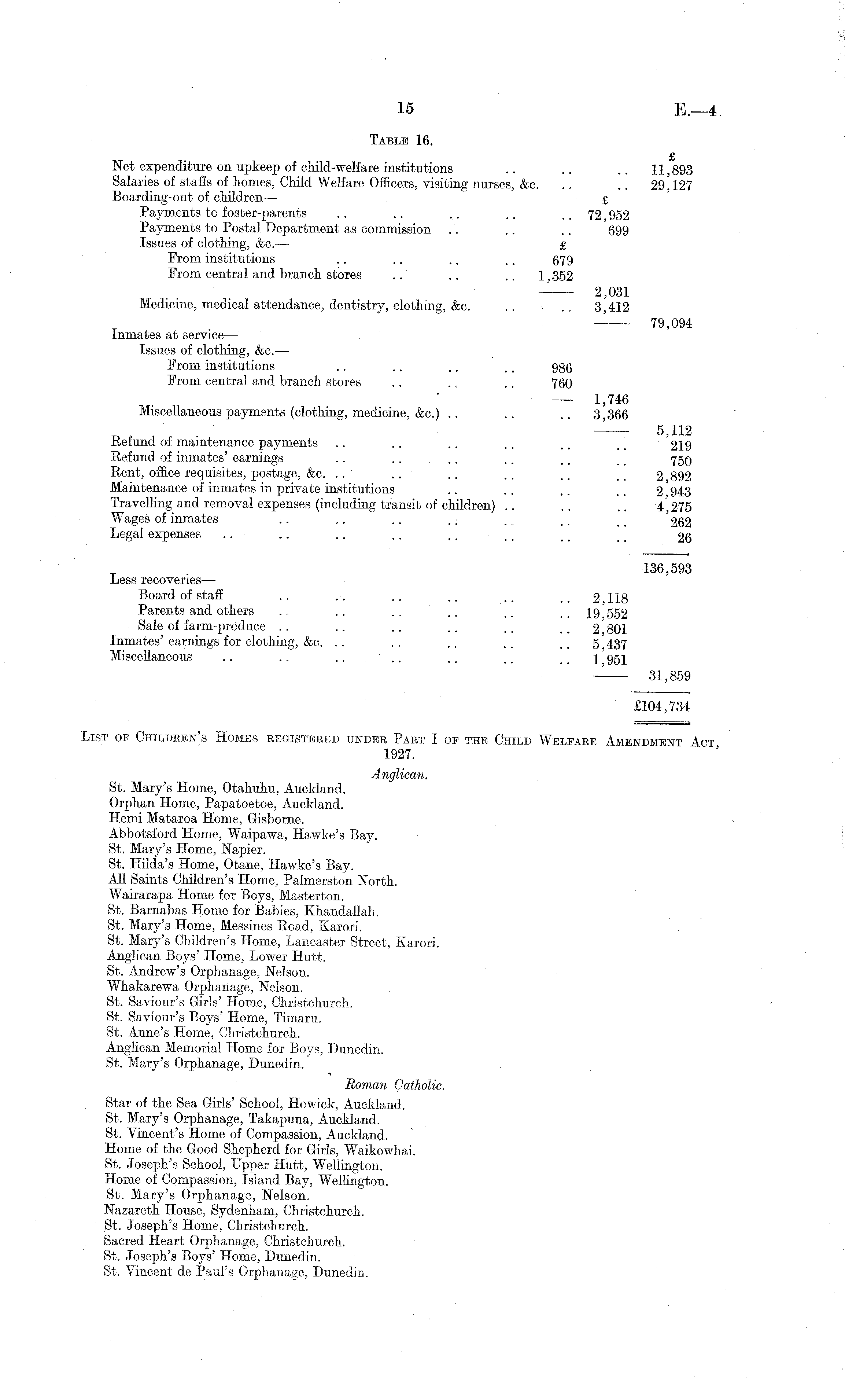 Table 16. £ Net expenditure on upkeep of child-welfare institutions .. .. .. 11,893 Salaries of staffs of homes, Child Welfare Officers, visiting nurses, &e. .. .. 29' 127 Boarding-out of children— £ Payments to foster-parents .. .. .. .. .. 72 952 Payments to Postal Department as commission .. . . .. 699 Issues of clothing, &c. — £ From institutions .. .. .. .. 679 From central and branch stores .. .. .. 1,352 — 2,031 Medicine, medical attendance, dentistry, clothing, &c. . . .. 3,412 — 79,094 Inmates at service— Issues of clothing, &c. — From institutions .. .. .. .. 986 From central and branch stores .. .. .. 760 1,746 Miscellaneous payments (clothing, medicine, &c.) .. .. .. 3,366 5 112 Refund of maintenance payments .. .. .. .. .. .. 219 Refund of inmates' earnings .. .. .. .. .. _ _ 759 Rent, office requisites, postage, &c. .. . . . . .. ~ , _ 2 892 Maintenance of inmates in private institutions .. . . .. .. 2' 943 Travelling and removal expenses (including transit of children) .. .. .. 4',275 Wages of inmates .. .. .. .. .. ~ _ 262 Legal expenses .. .. .. .. .. .. _ _ _ 26 136,593 Less recoveries— Board of staff .. .. .. .. .. 2,118 Parents and others .. . . .. .. .. .. 19 552 Sale of farm-produce . . .. .. .. .. .. 2 801 Inmates' earnings for clothing, &c,. .. .. .. .. 5 437 Miscellaneous .. .. .. . . . . .. .. 1,951 — 31,859 £104,734 List op Children's Homes registered under Part I of the Child Welfare Amendment Act 1927. Anglican. St. Mary's Home, Otahuhu, Auckland. Orphan Home, Papatoetoe, Auckland. Hemi Mataroa Home, Gisborne. Abbotsford Home, Waipawa, Hawke's Bay. St. Mary's Home, Napier. St. Hilda's Home, Otane, Hawke's Bay. All Saints Children's Home, Palmerston North. Wairarapa Home for Boys, Masterton. St. Barnabas Home for Babies, Khandallah. St. Mary's Home, Messines Eoad, Karori. St. Mary's Children's Home, Lancaster Street, Karori. Anglican Boys' Home, Lower Hutt. St. Andrew's Orphanage, Nelson. Whakarewa Orphanage, Nelson. St. Saviour's Girls' Home, Christchurch. St. Saviour's Boys' Home, Timaru. St. Anne's Home, Christchurch. Anglican Memorial Home for Boys, Dunedin. St. Mary's Orphanage, Dunedin. Roman Catholic. Star of the Sea Girls' School, Howick, Auckland. St. Mary's Orphanage, Takapuna, Auckland. St. Vincent's Home of Compassion, Auckland. Home of the Good Shepherd for Girls, Waikowhai. St. Joseph's School, Upper Hutt, Wellington. Home of Compassion, Island Bay, Wellington. St. Mary's Orphanage, Nelson. Nazareth House, Sydenham, Christchurch. St. Joseph's Home, Christchurch. Sacred Heart Orphanage, Christchurch. St. Joseph's Boys' Home, Dunedin. St. Vincent de Paul's Orphanage, Dunedin.