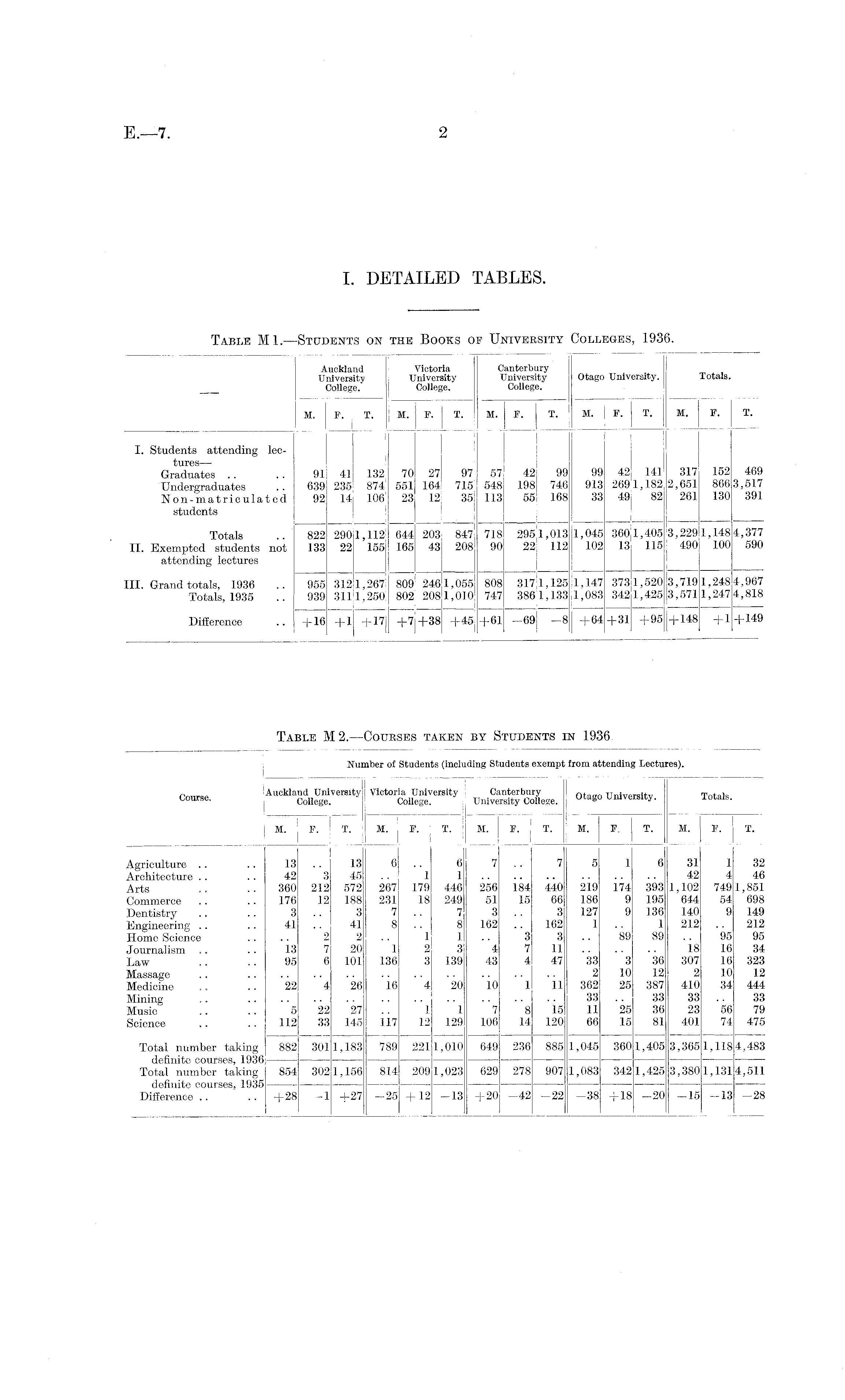 Number of Students (including Students exempt from attending Lectures). n „„ raa Auckland University Victoria University Canterbury ofcncm Totals Course - College. College. University College. Otago University. Xotals. SI. F. T. M. F. I T. M. F. | T. M. F. T. M. F. T. I I I Agriculture .. .. 13 13 6 6 7 7 5 1 6 31 1 32 Architecture .. . . 42 3 45 1 1 .. .. .. . . . . 42 4 46 Arts .. .. 360 212 572 267 179 446 256 184 440 219 174 393 1,102 7491,851 Commerce .. .. 176 12 188 231 18 249 51 15 66 186 9 195 644 54 698 Dentistry .. .. 3.. 3 7.. 7 3.. 3 127 9 136 140 9 149 Engineering .. .. 41 41 8 . . 8 162 .. 162 1 1 212 .. 212 Home Science .. .. 2 2 1 1 3 3 89 89 95 95 Journalism .. .. 13 7 20 1 2 3 4 7 11 .. .. 18 16 34 Law .. .. 95 6 101 136 3 139 43 4 47 33 3 36 307 16 323 Massage .. .. .. .. . • • • .. ■ ■ • • • • • • 2 10 12 2 10 12 Medicine .. .. 22 4 26 16 4 20 10 1 11 362 25 387 410 34 444 Mining .. 33 33 33 33 Music .. .. 5 22 27 .. 1 1 7 8 15 11 25 36 23 56 79 Science .. .. 112 33 145 117 12 129 106 14 120 66 15 81 401 74 475 Total number taking 882 301 1,183 789 221 1,010 649 236 885 1,045 3601,405 3,3651,118 4,483 definite courses, 1936; Total number taking 854 3021,156 814 2091,023 629 278 907 1,083 3421,425 3,3801,1314,511 definite courses, 1935 Difference .. .. +28 -1 +27 -25 +12 -13 +20 -42 -22 -38 +18 -20 -15 -13 -28