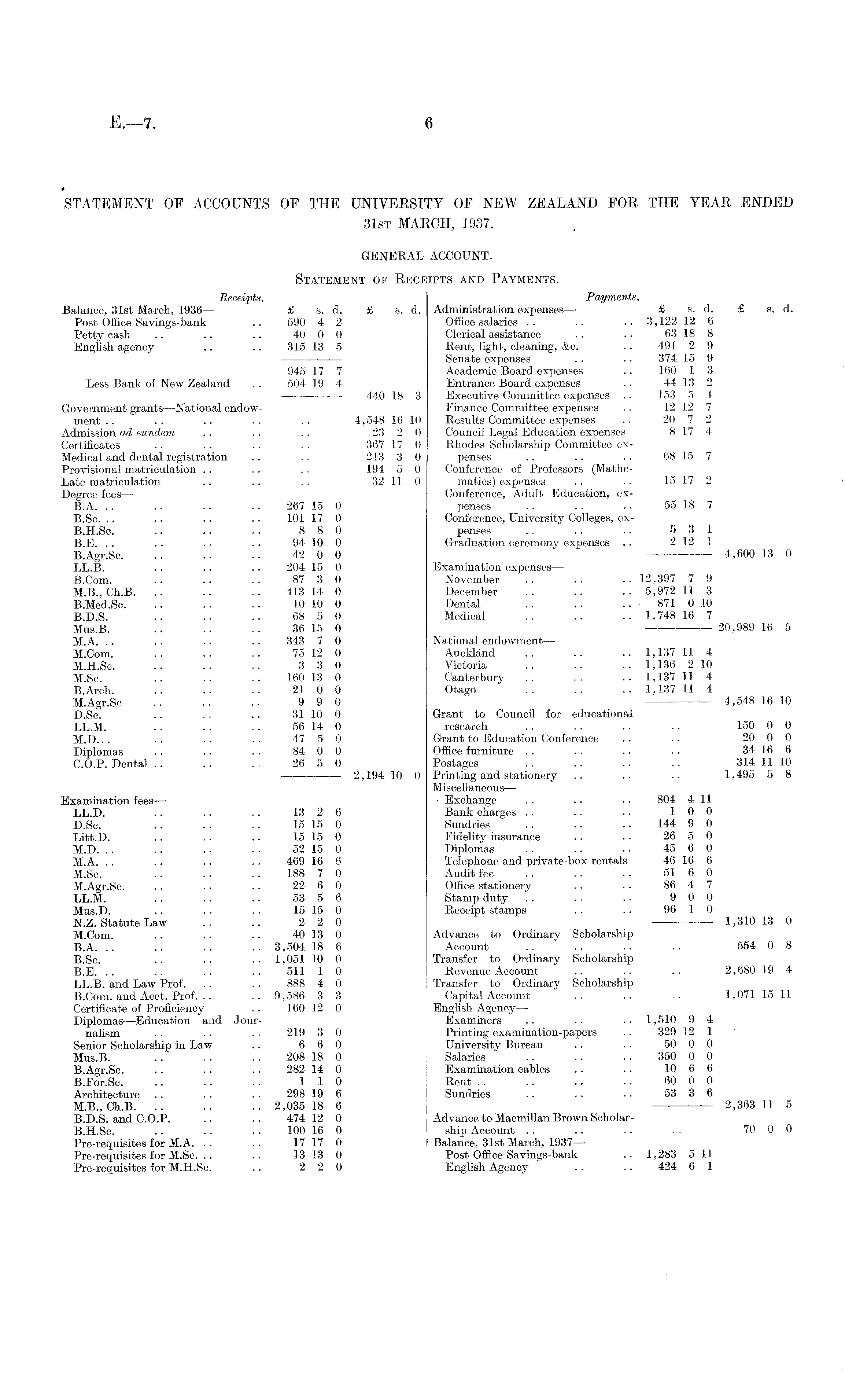 STATEMENT OF ACCOUNTS OP THE UNIVERSITY OF NEW ZEALAND FOR THE YEAR ENDED 31st MARCH, 1937. GENERAL ACCOUNT. Statement of Receipts and Payments. Receipts. Payments. Balance, 31st March, 1936 — £ s. d. £ s. d. Administration expenses' — £ s. d. £ s. d. Post Office Savings-bank .. 590 4 2 Office salaries .. .. 3,122 12 6 Petty cash .. .. .. 40 0 0 Clerical assistance .. .. 63 18 8 English agency .. .. 315 13 5 Rent, light, cleaning, &c. .. 491 2 9 Senate expenses .. .. 374 15 9 945 17 7 Academic Board expenses .. 160 1 3 Less Bank of New Zealand .. 504 19 4 Entrance Board expenses .. 44 13 2 440 18 3 Executive Committee expenses .. 153 5 4 Government grants—National endow- Finance Committee expenses . . 12 12 7 ment .. .. .. .. .. 4,548 16 10 Results Committee expenses .. 20 7 2 Admission ad eundern .. .. .. 23 2 0 Council Legal Education expenses 8 17 4 Certificates .. .. .. .. 367 17 0 Rhodes Scholarship Committee exMedical and dental registration .. .. 213 3 0 penses .. .. .. 68 15 7 Provisional matriculation .. .. .. 194 5 0 Conference of Professors (MatheLate matriculation .. .. .. 32 11 0 matics) expenses .. .. 15 17 2 Degree fees — Conference, Adult Education, exB.A. .. .. . ■ .. 267 15 0 penses .. .. • • 55 18 7 B.Sc. .. .. .. . • 101 17 0 Conference, University Colleges, exB.H.Sc. .. .. .. 8 8 0 penses . . .. .. 5 3 1 B.E. .. .. .. • • 94 10 0 Graduation ceremony expenses .. 2 12 1 B.Agr.Sc. .. .. .. 42 0 0 4,600 13 0 LL.B. .. .. .. 204 15 0 Examination expenses — B.Com. .. .. .. 87 3 0 November .. .. .. 12,397 7 9 M.8., Ch.B. .. .. .. 413 14 0 December .. .. •• 5,972 11 3 B.Med.Sc. .. . . .. 10 10 0 Dental . . . . .. ■ 871 010 B.D.S. . ■ • • • • 68 5 0 Medical .. .. .. 1,748 16 7 Mus.B. .. .. .. 36 15 0 20,989 16 5 M.A. .. .. . • • • 343 7 0 . National endowment— M.Com. .. •• 75 12 0 Auckland .. .. .. 1,137 11 4 M.H.Sc. .. .. .. 3 3 0 Victoria .. .. .. 1,136 2 10 M.Sc. .. •• .. 160 13 0 Canterbury .. .. .. 1,137 11 4 B.Arch. .. .. .. 21 0 0 Otagd .. .. .. 1,137 11 4 M.Agr.Sc .. .. .. 9 9 0 4,548 16 10 D.Sc. .. .. .. 31 10 0 Grant to Council for educational LL.M. .. . . . . 56 14 0 research .. .. .. .. 150 0 0 M.D... .. .. . . 47 5 0 Grant to Education Conference .. . • 20 0 0 Diplomas .. . • .. 84 0 0 Office furniture .. .. .. .. 34 16 6 C.O.P. Dental .. . . .. 26 5 0 Postages . . .. .. . • 314 11 10 2,194 10 0 Printing and stationery .. .. .. 1,495 5 8 Miscellaneous — Examination fees — • Exchange .. .. .. 804 4 11 LL.D. .. ■. .. 13 2 6 Bank charges .. .. .. 10 0 D.Sc. .. . . ■ • 15 15 0 Sundries .. .. . ■ 144 9 0 Litt.D. .. .. . • 15 15 0 Fidelity insurance .. .. 26 5 0 M.D. .. .. .. .. 52 15 0 Diplomas .. .. •. 45 6 0 M.A. .. .. .. .. 469 16 6 Telephone and private-box rentals 46 16 6 M.Sc. .. .. .. 188 7 0 Audit fee .. .. • • 51 6 0 M.Agr.Sc. .. . • .. 22 6 0 Office stationery .. .. 86 4 7 LL.M. .. •. • ■ 53 5 6 Stamp duty . . . . .. 9 0 0 Mus.D. .. .. .. 15 15 0 Receipt stamps .. .. 96 1 0 N.Z. Statute Law . . .. 22 0 1,310 13 0 M.Com. .. .. .. 40 13 0 Advance to Ordinary Scholarship B.A. .. .. .. .. 3,504 18 6 Account .. .. .. .. 554 0 8 B.Sc. .. .. .. 1,051 10 0 Transfer to Ordinary Scholarship B.E. .. .. .. ■■ 511 1 0 Revenue Account .. .. .. 2,680 19 4 LL.B. and Law Prof. .. .. 888 4 0 Transfer to Ordinary Scholarship B.Com. and Acct. Prof. .. .. 9,586 3 3 Capital Account .. .. .. 1,071 15 11 Certificate of Proficiency .. 160 12 0 English Agency— Diplomas—Education and Jour- Examiners .. .. .. 1,510 9 4 nalism .. .. .. 219 3 0 Printing examination-papers .. 329 12 1 Senior Scholarship hi Law .. 6 6 0 University Bureau .. .. 50 0 0 Mus.B. .. .. .. 208 18 0 Salaries .. .. . . 350 0 0 B.Agr.Sc. .. .. .. 282 14 0 Examhiation cables .. .. 10 6 6 B.For.Sc. .. .. .. 110 Rent .. .. .. .. 60 0 0 Architecture .. .. .. 298 19 6 Sundries .. .. .. 53 3 6 M.8., Ch.B. .. .. .. 2,035 18 6 2,363 11 5 B.D.S. and C.O.P. .. .. 474 12 0 Advance to Macmillan Brown ScholarB.H.Sc. .. .. .. 100 16 0 ship Account .. .. .. . . 70 0 0 Pre-requisites for M.A. .. .. 17 17 0 Balance, 31st March, 1937— Pre-requisites for M.Sc. .. .. 13 13 0 Post Office Savings-bank .. 1,283 511 Pre-requisites for M.H.Sc. .. 22 0 English Agency .. .. 424 6 1