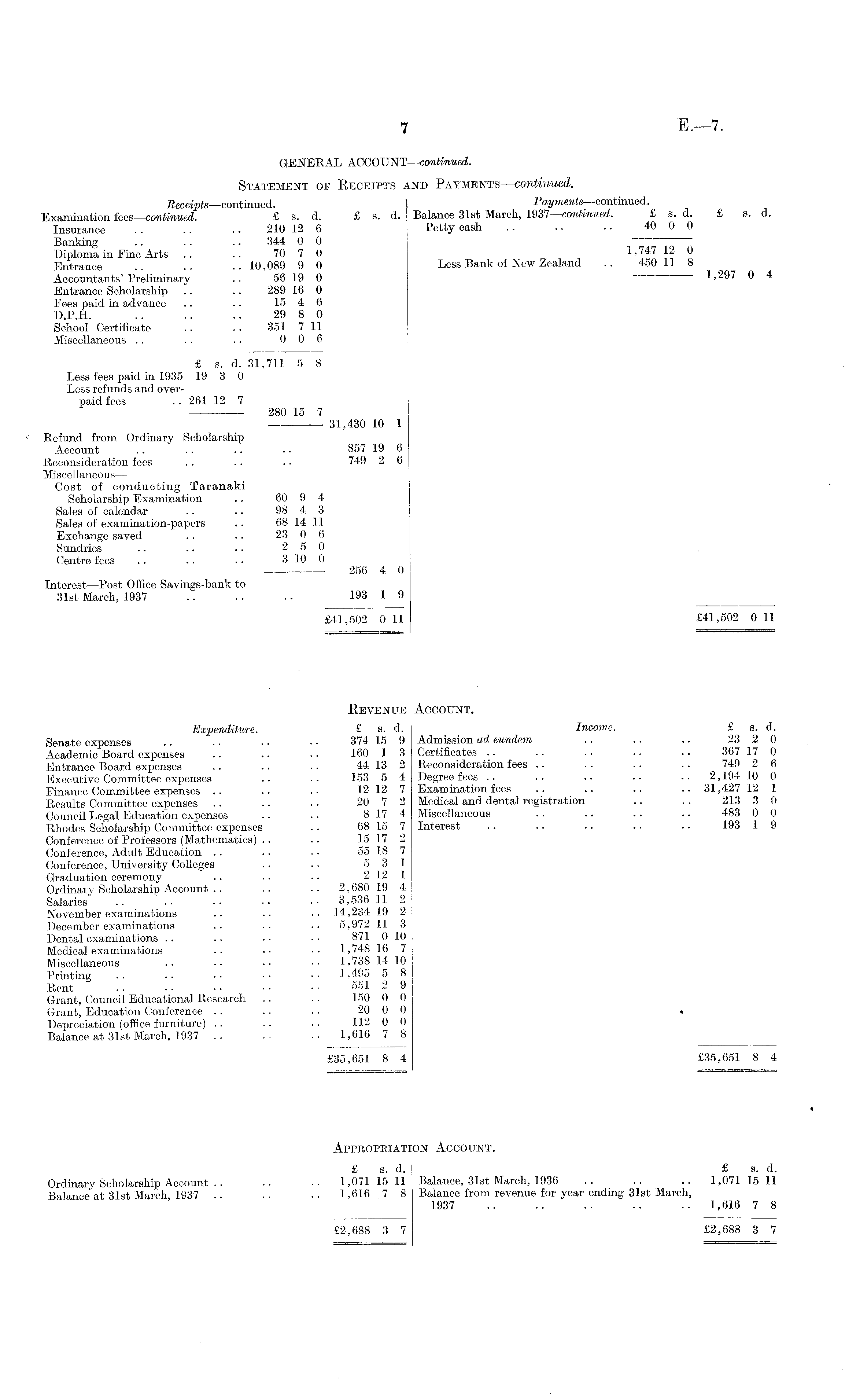 GENERAL ACCOUNT—continued. Statement of Receipts and Payments—continued. Receipts—continued. Payments- continued. Examination fees—continued. £ s. d. £ s. d. Balance 31st March, 1937 continued. £ s. d. £ s. d. Insurance .. .. .. 210 12 6 Petty cash .. .. .. 40 0 0 Banking .. .. .. 344 0 0 Diploma in Fine Arts .... 70 7 0 1,747 12 0 Entrance .. .. .. 10,089 9 0 Less Bank of New Zealand .. 450 11 8 Accountants' Preliminary .. 56 19 0 1,297 0 4 Entrance Scholarship .. .. 289 16 0 Fees paid in advance .. .. 15 4 6 D.P.H. .. .. .. 29 8 0 School Certificate .. . • 351 7 11 Miscellaneous .. .. .. 0 0 6 £ s. d. 31,711 5 8 Less fees paid in 1935 19 3 0 Less refunds and overpaid fees .. 261 12 7 280 15 7 31,430 10 1 Refund from Ordinary Scholarship Account .. .. .. .. 857 19 6 Reconsideration fees .. .. .. 749 2 6 Miscellaneous — Cost of conducting Taranaki Scholarship Examination .. 60 9 4 Sales of calendar .. .. 98 4 3 Sales of examination-papers .. 68 14 11 Exchange saved .. .. 23 0 6 Sundries ...... 2 5 0 Centre fees .. .. . • 3 10 0 256 4 0 Interest —Post Office Savings-bank to 31st March, 1937 ... .. .. 193 1 9 £41,502 0 11 £41,502 0 11 Revenue Account. Expenditure. £ s. d. Income. £ s. d. Senate expenses •. • • • • ■ • 374 15 9 Admission ad eundem .. .. .. 23 2 0 Academic Board expenses .. ■ • • • 160 1 3 Certificates .. .. . • .. .. 367 17 0 Entrance Board expenses .. .. 44 13 2 Reconsideration fees .. .. .. .. 749 2 6 Executive Committee expenses .. •• 153 5 4 Degree fees .. .. .. .. .. 2,194 10 0 Finance Committee expenses .. .. •• 12 12 7 Examination fees .. .. .. .. 31,427 12 1 Results Committee expenses .. .. .. 20 7 2 Medical and dental registration .. .. 213 3 0 Council Legal Education expenses .. • • 8 17 4 Miscellaneous .. .. .. .. 483 0 0 Rhodes Scholarship Committee expenses .. 68 15 7 Interest .. .. .. .. .. 193 1 9 Conference of Professors (Mathematics) .. . • 15 17 2 Conference, Adult Education .. .. • ■ 55 18 7 Conference, University Colleges .. .. 5 3 1 Graduation ceremony .. .. ■ ■ 2 12 1 Ordinary Scholarship Account .. .. ■■ 2,680 19 4 Salaries .. .. •• •• •• 3,536 11 2 November examinations .. •. • • 14,234 19 2 December examinations .. •• 5,972 11 3 Dental .. .. • ■ • • 871 0 10 Medical examinations .. •• 1,748 16 7 Miscellaneous .. •• •• •• 1,738 14 10 Printing .. . • • • • • • • 1, 495 5 8 Rent .. • • • • • • • • 551 2 9 Grant, Council Educational Research .. .. 150 0 0 Grant, Education Conference ...... 20 0 0 . Depreciation (office furniture) .. .. .. 112 0 0 Balance at 31st March, 1937 .. .. •• 1,616 7 8 £35,651 8 4 . £35,651 8 4 Appropriation Account. £ s. d. £ s. d. Ordinary Scholarship Account .. .. •• 1,07115 11 Balance, 31st March, 1936 .. .. .. 1,071 15 11 Balance at 31st March, 1937 .. .. •• 1,616 7 8 Balance from revenue for year ending 31st March, 1937 .. .. .. .. .. 1,616 7 8 £2,688 3 7 £2,688 3 7