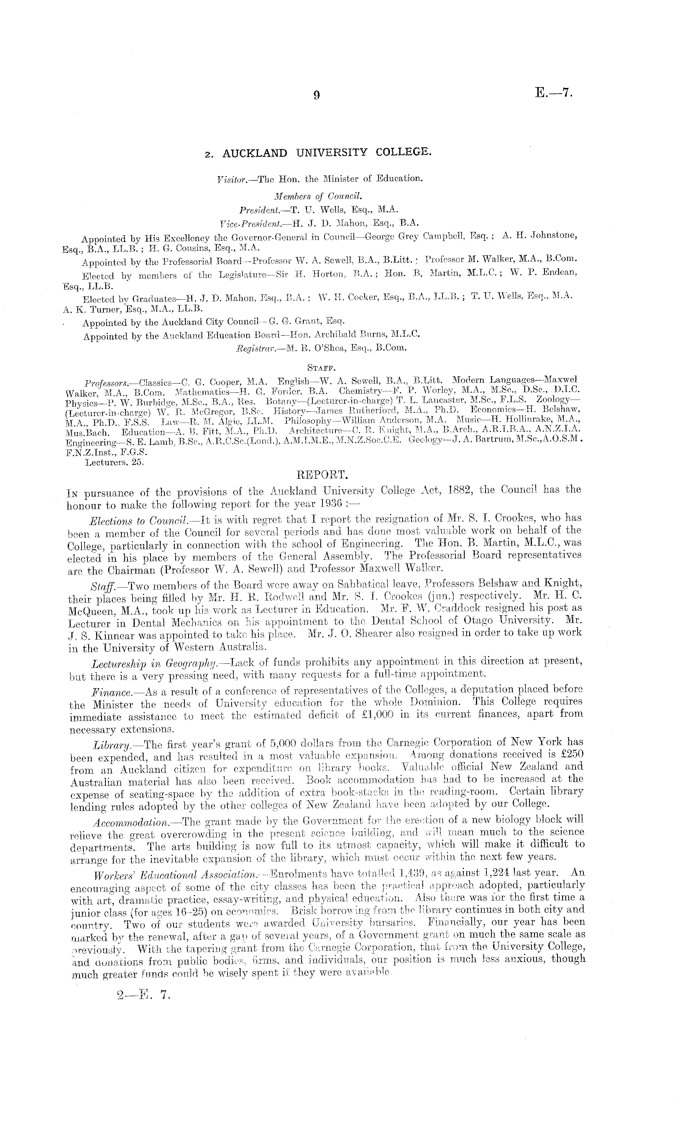 2. AUCKLAND UNIVERSITY COLLEGE. Visitor. —The Hon. the Minister of Education. Members of Council. President. —T. U. Wells, Esq., M.A. Vice-President. —H. J. D. Mahon, Esq., B.A. Appointed by His Excellency the Governor-General in Council—George Grey Campbell, Esq.; A. H. Johnstone, Esq., 8.A., LL.B. ; H. G. Cousins, Esq., M.A. Appointed by the Professorial Board—Professor W. A. Sewell, 8.A., B.Litt. ; Professor M. Walker, M.A., B.Com. Elected by members of the Legislature—Sir H. Horton, B.A. ; Hon. B. Martin, M.L.C.; W. P. Endean, Esq., LL.B. Elected bv Graduates —H. J. D. Mahon, Esq., B.A. ; \Y. H. Cocker, Esq., 8.A., LL.B. ; T. U. Y\ ells, Esq., M.A. A. K. Turner, Esq., M.A., LL.B. Appointed by the Auckland City Council —G. G. Grant, Esq. Appointed by the Auckland Education Board —Hon. Archibald Burns, M.L.C. Registrar.—M. R. O'Shea, Esq., B.Com. Staff. Professors.—Classics—C. G. Cooper, M.A. English—W. A. Sewell, 8.A., B.Litt. Modern Languages—Maxwel Walker, M.A., B.Com. Mathematics—H. G. Eorder, B.A. Chemistry—F. P. Worley, M.A., M.Sc., D.Sc., D.I.C. Physics P \V. Burbidge, M.Sc., 8.A., Res. Botanv —(Lecturer-in-charge) T. L. Lancaster, M.Sc., E.L.S. Zoology— (Lecturer-in-charge) W. R. McGregor, B.Sc. History—James Rutherford, M.A., Ph.D. Economics—H. Belshaw, M.A. Ph.D.., F.SJB. Law —R. M. Algie, LL.M. Philosophy—William Anderson, M.A. Music —H. Holhnrake, M.A., Mils Bach Education —A. B. Pitt, M.A., Ph.D. Architecture—o. R. Knight, M.A., B.Arch., A.R.1.8.A., A.N.Z.I.A. Engineering—S. E. Lamb, B.Sc., A.R.C.Se,(Lond.), A.M.1.M.E., M.N.Z.Soc.C.E. Geology—J. A. Bartrum, M.Sc.,A.O.S.M . E.N.Z.lnst., P.G.S. Lecturers, 25. REPORT. In pursuance of the provisions of the Auckland University College Act, 1882, the Council has the honour to make the following report for the year 1936 : — Elections to Council. —It is with regret that I report the resignation of Mr. S. I. Crookes, who has been a member of the Council for several periods and has done most valuable work on behalf of the College, particularly in connection with the school of Engineering. The Hon. B. Martin, M.L.C., was elected'in his place by members of the General Assembly. The Professorial Board representatives are the Chairman (Professor W. A. Sewell) and Professor Maxwell Walker. Staff.— Two members of the Board were away on Sabbatical leave, Professors Belshaw and Knight, their places being filled by Mr. H. R. Rodwell and Mr. S. I. Crookes (jun.) respectively. Mr. H. C. McQueen, M.A., took up his work as Lecturer in Education. Mr. F. W. Craddock resigned his post as Lecturer in Dental Mechanics on his appointment to the Dental School of Otago University. Mr. J. S. Kinnear was appointed to take his place. Mr. J. 0. Shearer also resigned in order to take up work in the University of Western Australia. Lectureship in Geography. —Lack of funds prohibits any appointment in this direction at present, but there is a very pressing need, with many requests for a full-time appointment. Finance. —As a result of a conference of representatives of the Colleges, a deputation placed before the Minister the needs of University education for the whole Dominion. This College requires immediate assistance to meet the estimated deficit of £1,000 in its current finances, apart from necessary extensions. Library— The first year's grant of 5,000 dollars from the Carnegie Corporation of New York has been expended, and has resulted in a most valuable expansion. Among donations received is £250 from an Auckland citizen for expenditure on library books. Valuable official Few Zealand and Australian material has also been received. Book accommodation has had to be increased at the expense of seating-space by the addition of extra book-stacks in the reading-room. Certain library lending rules adopted by the other colleges of New Zealand have been adopted by our College. Accommodation. —The grant made by the Government for the erection of a new biology block will relieve the great overcrowding in the present science building, and will mean much to the science departments. The arts building is now full to its utmost capacity, which will make it difficult to arrange for the inevitable expansion of the library, which must occur within the next few years. Workers' Educational Association. —Enrolments have totalled 1,4-39, as against 1,224 last year. An encouraging aspect of some of the city classes has been the practical approach adopted, particularly with art, dramatic practice, essay-writing, and physical education. Also there was for the first time a junior class (for ages 16-25) on economics. Brisk borrowing from the library continues in both city and country. Two of our students were awarded University bursaries. Financially, our year has been marked by the renewal, after a gap of several years, of a Government grant on much the same scale as previously. With the tapering grant from the Carnegie Corporation, that from the University College, and donations from public bodies, firms, and individuals, our position is much less anxious, though much greater funds could be wisely spent if they were available.