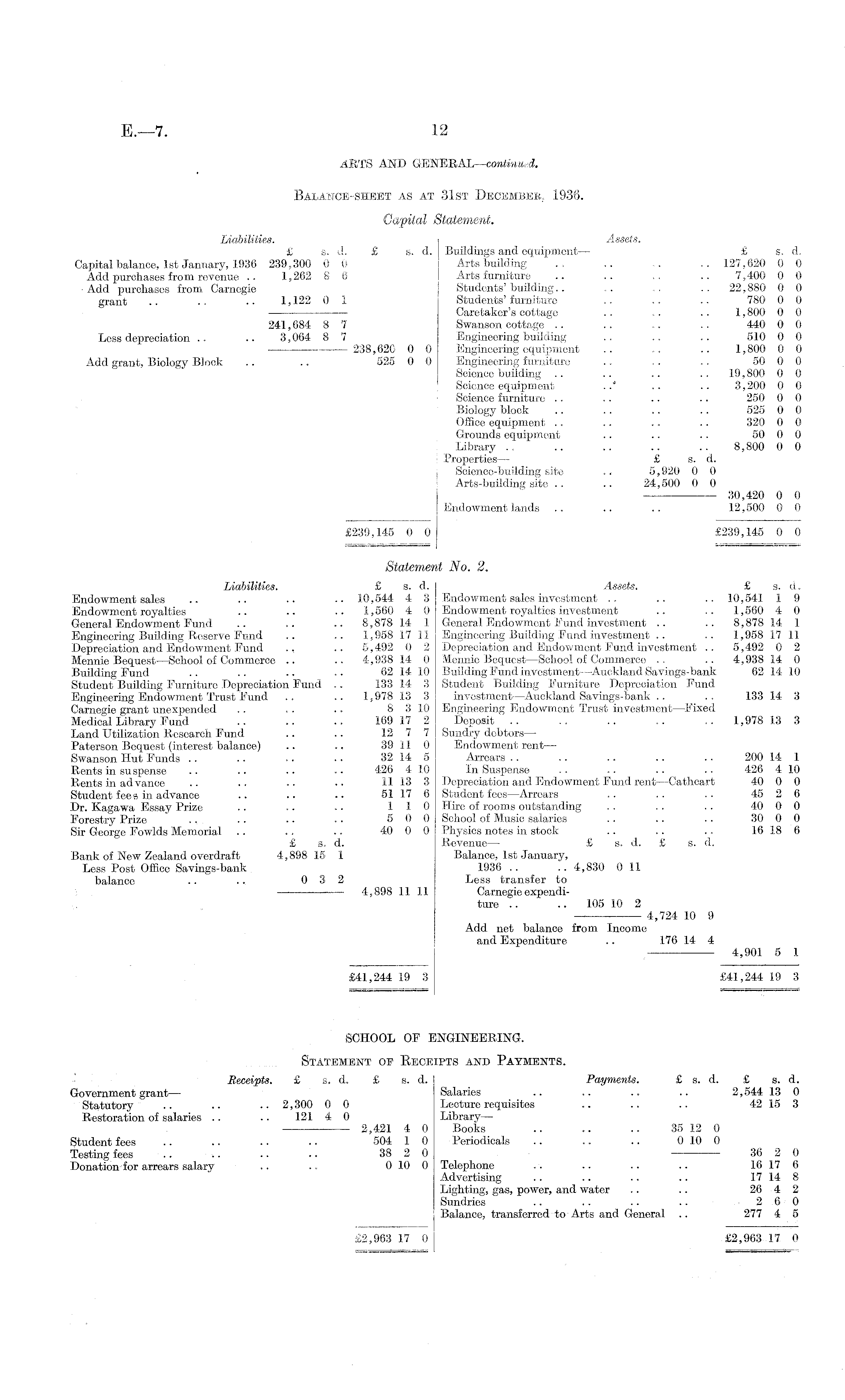 ARTS AND GENERAL—continued. Balance-sheet as at 31st December, 1936. Capital Statement. Liabilities. Assets. £ s. d. £ s. d. Buildings and equipment— £ s. d. Capital balance, Ist January, 1936 239,300 0 0 Arts building .. .. .. .. 127,620 0 0 Add purchases from revenue .. 1,262 8 6 Arts furniture .. .. .. 7,400 0 0 Add purchases from Carnegie Students' building.. .. .. .. 22,880 0 0 grant .. .. .. 1,122 0 1 Students'furniture .. .. .. 780 0 0 Caretaker's cottage .. .. .. 1,800 0 0 241,684 8 7 Swanson cottage .. .. .. .. 440 0 0 Less depreciation .. .. 3,064 8 7 Engineering building .. .. .. 510 0 0 ■ 238,620 0 0 Engineering equipment .. .. .. 1,800 0 0 Add grant, Biology Block .. .. 525 0 0 Engineering furniture .. .. .. 50 0 0 Science building .. .. .. .. 19,800 0 0 Science equipment ... .. 3,200 0 0 I Science furniture .. .. .. .. 250 0 0 ! Biology block .. .. .. .. 525 0 0 | Office equipment .. .. .. .. 320 0 0 Grounds equipment .. .. .. 50 0 0 Library .. .. .. .. .. 8,800 0 0 ! Properties— £ s. d. Science-building site .. 5,920 0 0 Arts-building site .. .. 24,500 0 0 30,420 0 0 Endowment lands .. .. .. 12,500 0 0 £239,145 0 0 £239,145 0 0 Statement No. 2. Liabilities. £ s. d. Assets. £ s. d. Endowment sales .. .. .. .. 10,544 4 3 Endowment sales investment .. .. .. 10,541 1 9 Endowment royalties .. .. .. 1,560 4 0 Endowment royalties investment .. .. 1,560 4 0 General Endowment Eund .. .. .. 8,878 14 1 General Endowment Fund investment .. .. 8,878 14 1 Engineering Building Reserve Eund .. .. 1,958 17 11 Engineering Building Eund investment .. .. 1,958 17 11 Depreciation and Endowment Eund .. 5,492 0 2 Depreciation and Endowment Fund investment .. 5,492 0 2 Mennie Bequest—School of Commerce .. .. 4,938 14 0 Mennie Bequest—School of Commerce .. .. 4,938 14 0 Building Fund .. .. .. .. 62 14 10 Building Fund in vestment —Auckland Savings-bank 62 14 10 Student Building Furniture Depreciation Fund .. 133 14 3 Student Building Furniture Depreciation Fund Engineering Endowment Trust Fund .. .. 1,978 13 3 investment —Auckland Savings-bank .. .. 133 14 3 Carnegie grant unexpended .. .. .. 8 310 Engineering Endowment Trust investment—Fixed Medical Library Fund .. .. .. 169 17 2 Deposit .. ~ .. ... .. 1,978 13 3 Land Utilization Research Fund .. .. 12 7 7 Sundry debtors— Paterson Bequest (interest balance) .. .. 39 11 0 Endowment rent — Swanson Hut Funds .. .. ■. ... 32 14 5 Arrears .. .. .. .. .. 200 14 1 Rents in suspense .. .. .. . • 426 410 In Suspense .. • • • ■ ■. 426 410 Rents in advance .. .. ■■ •• 11133 Depreciation and Endowment Fund rent —Cathcart 40 0 0 Student fees in advance .. .. .. 81 17 6 Student fees —Arrears .. .. .. 45 2 6 Dr. Kagawa Essay Prize .. .. ■. 110 Hire of rooms outstanding .. .. .. 40 0 0 Forestry Prize ' .. •• •• 500 School of Music salaries .. .. .. 30 0 0 Sir George Fowlds Memorial .. .. .. 40 0 0 Physics notes in stock .. .. .. 16 18 6 £ s. d. Revenue— £ s. d. £ s. d. Bank of New Zealand overdraft 4,898 15 1 Balance, Ist January, Less Post Office Savings-bank, 1936 .. .. 4,830 0 11 balance .. .. .0 3 2 Less transfer to ■ 4,898 11 11 Carnegie expenditure .. .. 105 10 2 — 4,724 10 9 Add net balance from Income and Expenditure .. 176 14 4 , 4,901 5 1 £41,244 19 3 £41,244 19 3 SCHOOL OF ENGINEERING. Statement op Receipts and Payments. Beceipts. £ s< d. £ s. d. Payments. £s. d. £ s. d. Government grant— Salaries .. .. .. .. 2,544 13 0 Statutory .. .. .. 2,300 0 0 Lecture requisites .. ... .. 42 15 3 Restoration of salaries .. .. 121 4 0 Library— 2,421 4 0 Books .. .. .. 35 12 0 Student fees .. .. •. .. 504 1 0 Periodicals .. .. .. 0 10 0 Testing fees .. .. .. .. 38 2 0 -— 36 2 0 Donation for arrears salary .. .. 0 10 0 Telephone .. .. .. .. 16 17 6 Advertising .. .. .. .. 17 14 8 Lighting, gas, power, and water .. .. 26 4 2 Sundries .. .. .. .. 2 6 0 Balance, transferred to Arts and General .. 277 4 5 £2,963 17 0 £2,963 17 0