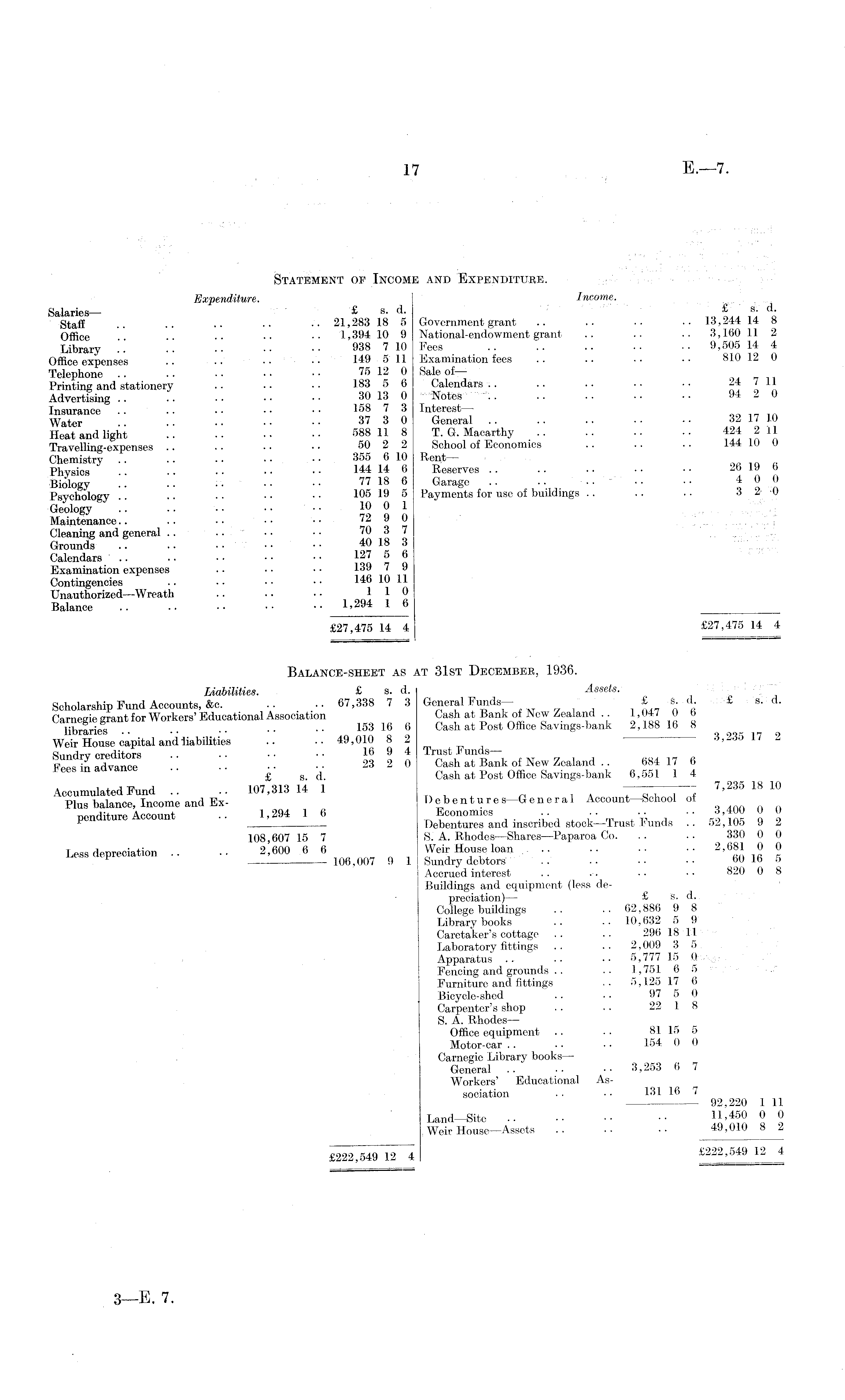 Statement of Income and Expenditure. Expenditure. Income, Salaries. £s. d. s ; Staff .. .. •• • • 21,283 18 5 Government grant .. .. •• •• 13,244 14 8 Office •• •• 1,394 10 9 National-endowment grant .. .. .. 3,160 11 2 Library .. .. •• •• 938 710 Fees .. .. .. .. •• 9,505 14 4 Office expenses .. .. ■■ 149 511 Examination fees .. .. •• 810 12 0 Telephone .. .. • • • • • • 75 12 0 Sale of— Printing and stationery .. ■ • ■ ■ 183 5 6 Calendars . . .. • • • • • • 24 711 Advertising .. .. • • • • • • 30 13 0 ' NtfSfes ■ Insurance .. .. •• •• •• I s ® 7 3 Interest Water 37 3 0 General 32 17 10 Heat and light .. .. •• 588 11 8 T. G. Macarthy .. .. .. •• 424 211 Travelling-expenses .. • • • • • • 50 22 School of Economics .. ■ • • • 144 10 0 Chemistry .. .. •• •• 355 6 10 Rent — Phvsics •. • ■ • • • • 14 6 Reserves .. .. • • • • • • 26 19 6 (Biology " • ■ 77 18 6 Garage .. .. • • • • • • 40 0 Psychology .. .. • • • • ■ • 105 19 5 Payments for use of buildings .. . . .. 3 2 0 Geology .10 0 1 Maintenance.. .. • • • • 72 9 0 Cleaning and general .. .... .. 70 3 7 Grounds .. • • .... .. 40 18 3 Calendars .. .. ■ • • ■ • • 127 5 6 Examination expenses . • • • • • 139 " 9 Contingencies .. • • • • • • 146 10 11 Unauthorized —Wreath .. • • • • 110 Balance 1» 294 1 6 £27,475 14 4 £27,475 14 4 Balance-sheet as at 31st December, 1936. Liabilities. £ s» d. * Scholarship Fund Accounts, &c. .. 67,338 7 3 General Funds- £ fc-d. £ s. d. Carnegie grant for Workers' Educational Association Cash at Bank of New Zealand 1,047 0 b libraries .. •• •• •• 153 16 6 Cash at Post Office Savings-bank 2,188 16 8 Weir House capital and liabilities •• 49,010 8 2 3,235 17 2 Snnrlrv creditors . •• •• lb 9 4 Trust iunds — r advance 23 2 0 Cash at Bank of New Zealand .. 684 17 6 £ s. d. Cash at Post Office Savings-bank 6,551 14 Accumulated Fund .. .. 107,313 14 1 . . „ , , f 7 >235 I s 10 Plus balance, Income and Ex- Debentures-General Account—School of Tipriditure Account .. 1,294 1 6 Economics .. •• •• 3,400 0 0 penditure Account , Debentures and inscribed stock—Trust Funds .. 52,105 9 2 108,607 15 7 S.A.Rhodes —Shares —Paparoa Co. .. •• 330 0 0 Less depreciation .. .. 2,600 6 6 Weir House loan 2,681 0 0 . 106,007 9 1 Sundry debtors .. •• •• 60 16 5 Accrued interest .. • • • • 820 0 8 Buildings and equipment (less depreciation) — £ s. d. College buildings .. .. b2,886 9 8 Library books .. •• 10,632 5 9 Caretaker's cottage .. .. 296 18 11 Laboratory fittings .. .. 2,009 3 5 . Apparatus .. .. •• 5,777 15 O'sa; . Fencing and grounds .. .. 1,751 6 5 Furniture and fittings .. 5,125 17 6 Bicycle-shed .. • • 97 5 0 Carpenter's shop .. • • 22 1 8 S. A. Rhodes — Office equipment .. ■ • 81 15 5 Motor-car .. • • • • 154 0 0 Carnegie Library books — General .. • • • • 3,253 6 7 Workers' Educational Association .• •• 131 16 7 92,220 1 11 Land-Site IMSO 0 0 I Weir House —Assets .. •• •• 49,010 8 2 £222,549 12 4 £222,549 12 4