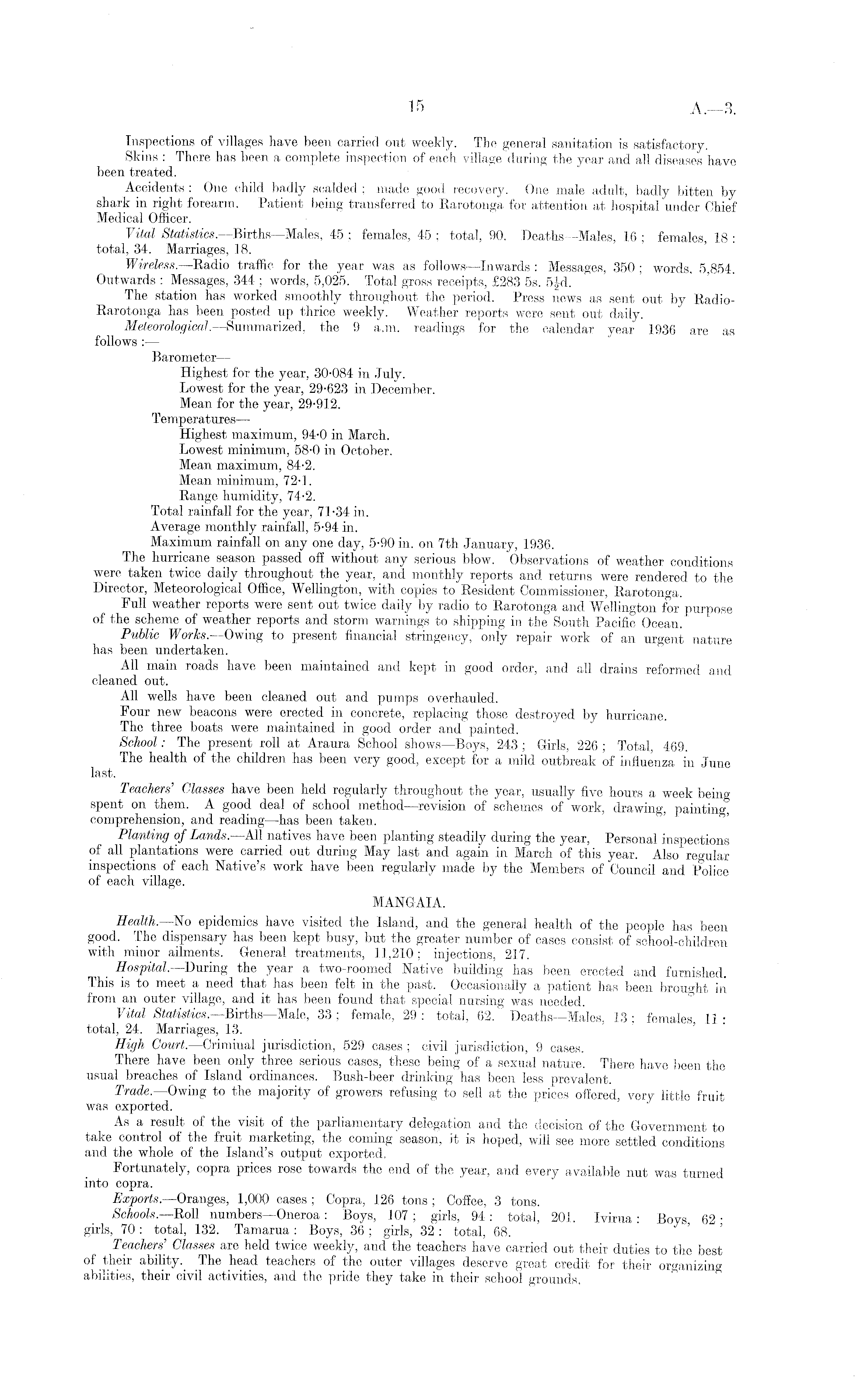 Inspections of villages have been carried out weekly. The general sanitation is satisfactory. Skins : There has been a complete inspection of each village during the year and all diseases have been treated. Accidents : One child badly scalded ; made good recovery. One male adult, badly bitten by shark in right forearm. Patient being transferred to Rarotonga for attention at hospital under Chief Medical Officer. Vital Statistics.—Births —Males, 45 ; females, 45 ; total, 90. Deaths—Males, 16 ; females, 18 : total, 34. Marriages, 18. Wireless. —Radio traffic for the year was as follows—lnwards : Messages, 350 ; words, 5,854. Outwards : Messages, 344 ; words, 5,025. Total gross receipts, £283 ss. 5-|-d. The station has worked smoothly throughout the period. Press news as sent out by RadioRarotonga has been posted up thrice weekly. Weather reports were sent out daily. Meteorological.—Summarized, the 9 a.m. readings for the calendar year 1936 are as follows : — Barometer— Highest for the year, 30-084 in July. Lowest for the year, 29-623 in December. Mean for the year, 29-912. Temperatures— Highest maximum, 94-0 in March. Lowest minimum, 58-0 in October. Mean maximum, 84-2. Mean minimum, 72-1. Range humidity, 74-2. Total rainfall for the year, 71-34 in. Average monthly rainfall, 5-94 in. Maximum rainfall on any one day, 5-90 in. on 7th. January, 1936. The hurricane season passed off without any serious blow. Observations of weather conditions were taken twice daily throughout the year, and monthly reports and returns were rendered to the Director, Meteorological Office, Wellington, with copies to Resident Commissioner, Rarotonga. Full weather reports were sent out twice daily by radio to Rarotonga and Wellington for purpose of the scheme of weather reports and storm warnings to shipping in the South Pacific Ocean. Public Works.—Owing to present financial stringency, only repair work of an urgent nature has been undertaken. All main roads have been maintained and kept in good order, and all drains reformed and cleaned out. All wells have been cleaned out and pumps overhauled. Four new beacons were erected in concrete, replacing those destroyed by hurricane. The three boats were maintained in good order and painted. School: The present roll at Araura School shows —Boys, 243 ; Girls, 226 ; Total, 469. The health of the children has been very good, except for a mild outbreak of influenza in June last. Teachers' Classes have been held regularly throughout the year, usually five hours a week being spent on them. A good deal of school method—revision of schemes of work, drawing, painting, comprehension, and reading—has been taken. Planting of Lands. —All natives have been planting steadily during the year, Personal inspections of all plantations were carried out during May last and again in March of this year. Also regular inspections of each Native's work have been regularly made by the Members of Council and Police of each village. MANGAIA. Health.—No epidemics have visited the Island, and the general health of the people has been good. The dispensary has been kept busy, but the greater number of cases consist of school-children with minor ailments. General treatments, 11,210; injections, 217. Hospital.—During the year a two-roomed Native building has been erected and furnished. This is to meet a need that has been felt in the past. Occasionally a patient has been brought in from an outer village, and it has been found that special nursing was needed. Vital Statistics.—Births—Male, 33; female, 29: total, 62. Deaths—Males 13- females li • total, 24. Marriages, 13. High Court.—Criminal jurisdiction, 529 cases ; civil jurisdiction, 9 cases. There have been only three serious cases, these being of a sexual nature. There have been the usual breaches of Island ordinances. Bush-beer drinking has been less prevalent. Trade.—Owing to the majority of growers refusing to sell at the prices offered, very little fruit was exported. As a result of the visit of the parliamentary delegation and the decision of the Government to take control of the fruit marketing, the coming season, it is hoped, will see more settled conditions and the whole of the Island's output exported. Fortunately, copra prices rose towards the end of the year, and every available nut was turned into copra. Exports.—Oranges, 1,000 cases ; Copra, 126 tons ; Coffee, 3 tons. Schools.—Roll numbers—Oneroa : Boys, 107 ; girls, 94: total, 201. Ivirua: Boys, 62 ■ girls, 70: total, 132. Tamarua: Boys, 36 ; girls, 32: total, 68. Teachers' Classes are held twice weekly, and the teachers have carried out their duties to the best of their ability. The head teachers of the outer villages deserve great credit for their organizing abilities, their civil activities, and the pride they take in their school grounds.