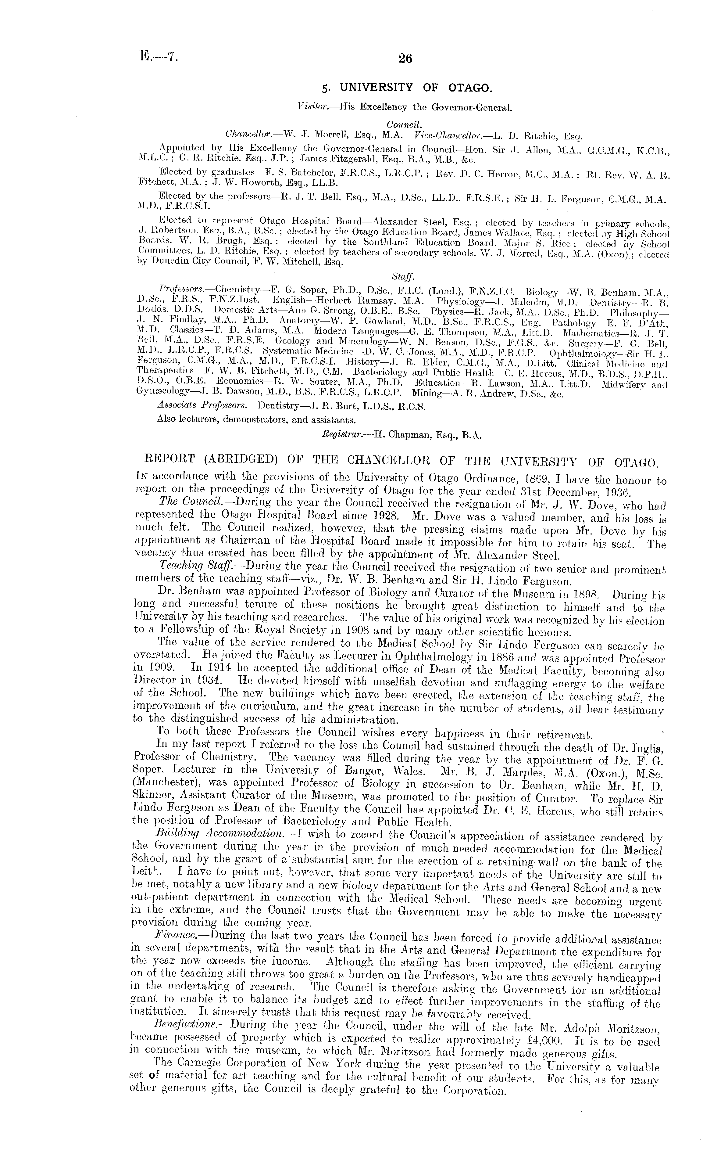 5- UNIVERSITY OF OTAGO. Visitor.—His Excellency the Governor-General. Council. Chancellor.—W, J. Morrell, Esq., M.A. Vice-Chancellor.-—L. D. Ritchie, Esq. Appointed by His Excellency the Governor-General in Council—Hon. Sir J. Allen, M.A., G.C.M.G., K.C.B. M.L.C. ;G. R. Ritchie, Esq., J.P. ; James Fitzgerald, Esq., 8.A., M.8., &c. Elected by graduates—F, S. Batchelor, F.R.C.S., L.R.C.P. ; Rev. D. C. Herron, M.C., M.A. ; Rt. Rev. W. A R Fitchett, M.A.; J. W. Howorth, Esq., LL.B. Elected by the professors—R. J. T. Bell, Esq., M.A., D.Sc., LL.D., F.R.S.E. ; Sir H. L. Ferguson, C.M.G., M.A. M.D., F.R.C.S.I. Elected to represent Otago Hospital Board—Alexander Steel, Esq. ; elected by teachers in primary schools, J. Robertson, Esq., 8.A., B.Sc. ; elected by the Otago Education Board, James Wallace, Esq. ; elected by High School Boards, W. R. Brugh, Esq. ; elected by the Southland Education Board, Major S. Rice; elected by School Committees, L. D. Ritchie, Esq. ; elected by teachers of secondary schools, W. J. Morrell, Esq., M.A. (Oxon)*- elected by Dunedin City Council, F. W. Mitchell, Esq. Staff. Professors. —Chemistry—F. G. Soper, Ph.D., D.Sc., F.I.C. (Lond.), F.N.Z.I.C. Biology—W. B. Benham M A D.Sc., P-R-S., F N.Z.lnst. English—Herbert Ramsay, M.A. Physiology—J. Malcolm, M.D. Dentistry—R. B. Dodds, D.D.S. Domestic Arts—Ann G. Strong, 0.8. E., B.Sc. Physics—R. Jack, M.A., D.Sc.. Ph.D Philosophy— J. N. Fmdlay, M.A., Ph.D. Anatomy—W. P. Gowland, M.D., B.Sc., F.R.C.S., Eng. Pathology—E. F. D'Ath m L aSSI -??7" T ' Pt Adams > M ' A - Modern Languages—G. E. Thompson, M.A., Litt.D. Mathematics—R. J. t! Bell, M.A., D.Sc., F.R.S.E. Geology and Mineralogy—W. N. Benson, D.Sc., F.G.S., &c. Surgery—F. G Bell M.D., L.R.C.P., F.R.C.S. Systematic Medicine—D. W. C. Jones, M.A., M.D., F.R.C.P. Ophthalmology—Sir H L Ferguson C.M G. M.A. M.D., F.R.C.S.I. History-J. R. Elder, C.M.G., M.A., D.Litt. Clinical Medicine and Therapeutics—F. W. B. Fitchett, M.D., C.M. Bacteriology and Public Health—C. E. Hercus, M.D. B.D.S DPH D.5.0., 0.8. E. Economics—R. W. Souter, M.A., Ph.D. Education—R. Lawson, M.A., Litt.D.' Midwiferv and Gynecology—J. B. Dawson, M.D., 8.5., F.R.C.S., L.R.C.P. Mining—A. R. Andrew, D.Sc., &c. Associate Professors. —Dentistry—J. R. Burt, L.D.S., R.C.S. Also lecturers, demonstrators, and assistants. Registrar.—H. Chapman, Esq., B.A. REPORT (ABRIDGED) OF THE CHANCELLOR OF THE UNIVERSITY OF OTAGO. In accordance with the provisions of the University of Otago Ordinance, 1869, I have the honour to report 011 the proceedings of the University of Otago for the year ended 31st December, 1936. The Council.—During the year the Council received the resignation of Mr. J. W. Dove, who had represented the Otago Hospital Board since 1928. Mr. Dove was a valued member, and his loss is much felt. The Council realized, however, that the pressing claims made upon Mr. Dove bv bis appointment as Chairman of the Hospital Board made it impossible for him to retain his seat. ' The vacancy thus created has been filled by the appointment of Mr. Alexander Steel. TearJiing Staff—During the year the Council received the resignation of two senior and prominent members of the teaching staff—viz., Dr. W. B. Benham and Sir H. Lindo Ferguson. Dr. Benham was appointed Professor of Biology and Curator of the Museum in 1898. During his long and successful tenure of these positions he brought great distinction to himself and to the Uni versitv by his teaching and researches. The value of his original work was recognized by his election to a Fellowship of the Royal Society in 1908 and by many other scientific honours. The value of the service rendered to the Medical School by Sir Lindo Ferguson can scarcely be overstated. He joined the Faculty as Lecturer in Ophthalmology in 1886 and was appointed Professor in 1909. _ In 1914 he accepted the additional office of Dean of the Medical Faculty, becoming also Director in 1934. He devoted himself with unselfish devotion and unflagging energy to the welfare of the School. The new buildings which have been erected, the extension of the teaching staff, the improvement of the curriculum, and the great increase in the number of students, all bear testimony to the distinguished success of his administration. To both these Professors the Council wishes every happiness in their retirement. In my last report I referred to the loss the Council had sustained through the death of Dr. Inglis, Professor of Chemistry. The vacancy was filled during the vear bv the appointment of Dr F g' Soper, Lecturer in the University of Bangor, Wales. Mr." B. J. Marples, M.A. (Oxon.),' M.Sc. (Manchester), was appointed Professor of Biology in succession to Dr. Benham, while Mr.' H d' Skinner, Assistant Curator of the Museum, was promoted to the position of Curator. To replace Sir Lindo Ferguson as Dean of the Faculty the Council has appointed Dr. C. E. Hercus, who still retains the position of Professor of Bacteriology and Public Health. Building Accommodation.—l wish to record the Council's appreciation of assistance rendered by the Government during the year in the provision of much-needed accommodation for the Medical School, and by the grant of a substantial sum for the erection of a retaining-wall on the bank of the Leith. I have to point out, however, that some very important needs of the University are still to be met, notably a new library and a new biology department for the Arts and General School and a new out-patient department in connection with the Medical School. These needs are becoming urgent in the extreme, and the Council trusts that the Government may be able to make the necessary provision during the coming year. Finance. During the last two years the Council has been forced to provide additional assistance in several departments, with the result that in the Arts and General Department the expenditure for the year now exceeds th