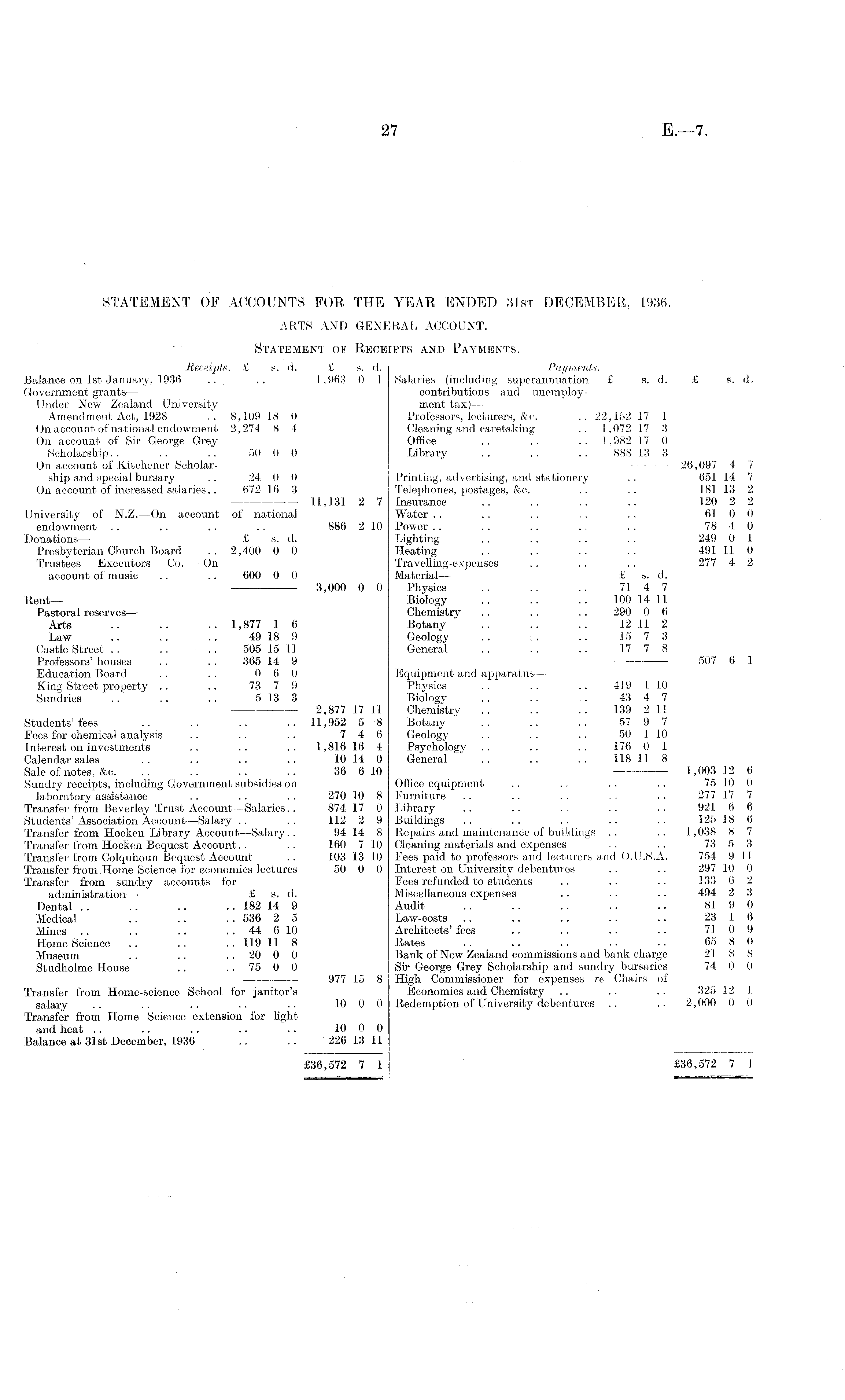 STATEMENT OF ACCOUNTS FOR THE YEAR ENDED 31st DECEMBER, 1936. ARTS, AND GENERAL ACCOUNT. Statement op Receipts and Payments. Receipts. £ s. d. £ s. d. Payments. Balance on Ist January, 1936 .. .. 1,963 0 1 Salaries (including superannuation £ s. d. £ s. d. Government grants— contributions and unemployUnder New Zealand University ment tax) — Amendment Act, 1928 .. 8,109 18 0 Professors, lecturers, &c. .. 22,152 17 1 On account of national endowment 2,274 8 4 Cleaning and caretaking .. 1,072 17 3 On account of Sir George Grey Office .. .. 1,982 17 0 Scholarship.. .. .. 50 0 0 Library .. .. .. 888 13 3 On account of Kitchener Scholar- 26,097 4 7 ship and special bursary .. 24 0 0 Printing, advertising, and stationery . . 651 14 7 On account of increased salaries.. 672 16 3 Telephones, postages, &c. .. .. 181 13 2 11,131 2 7 Insurance .. .. .. .. 120 22 University of N.Z.—On account of national Water .. .. . . . . . . 61 0 0 endowment .. .. .. .. 886 2 10 Power .. . . .. .. .. 78 4 0 Donations — £ s. d. Lighting .. . . .. . . 249 0 1 Presbyterian Church Board .. 2,400 0 0 Heating .. .. .. .. 491 11 0 Trustees Executors Co. —On Travelling-expenses .. .. .. 277 4 2 account of music .. .. 600 0 0 Material— £ s. d. — 3,000 0 0 Physics .. .. .. 71 4 7 Rent — Biology .. .. . . 100 14 11 Pastoral reserves— Chemistry . . .. .. 290 0 6 Arts .. .. .. 1,877 1 6 Botany .. .. .. 12 11 2 Law .. .. .. 49 18 9 Geology .. .. .. 15 7 3 Castle Street .. .. .. 505 15 11 General .. .. 17 7 8 Professors' houses . . .. 365 14 9 507 6 1 Education Board . . . . 0 6 0 Equipment and apparatus — King Street property .. .. 73 7 9 Physics .. .. .. 419 1 10 Sundries .. .. .. 5 13 3 Biologv .. . • .. 43 4 7 — 2,877 17 11 Chemistry .. .. .. 139 211 Students' fees .. .. .. ..11,952 5 8 Botany . . .. .. 57 9 7 Pees for chemical analysis .. .. .. 7 4 6 Geology . . .. .. 50 I 10 Interest on investments .. .. .. 1,816 16 4 Psychology .. .. .. 176 0 1 Calendar sales .. .. .. .. 10 14 0 General .. .. .. 118 11 8 Sale of notes. &c. .. .. .. .. 36 6 10 1,003 12 6 Sundry receipts, including Government subsidies on Office equipment .. .. .. .. 75 10 0 laboratory assistance .. .. . . 270 10 8 Furniture .. .. .. . . . . 277 17 7 Transfer from Beverley Trust Account—Salaries.. 874 17 0 Library .. .. .. .. .. 921 6 6 Students' Association Account —Salary .. .. 112 2 9 Buildings .. .. .. .. .. 125 18 6 Transfer from Hoeken Library Account —Salary.. 94 14 8 Repairs and maintenance of buildings .. .. 1,038 8 7 Transfer from Hocken Bequest Account. . .. 160 7 10 Cleaning materials and expenses .. .. 73 5 3 Transfer from Colquhoun Bequest Account .. 103 13 10 Fees paid to professors and lecturers and O.U.S.A. 754 9 11 Transfer from Home Science for economies lectures 50 0 0 Interest on University debentures .. .. 297 10 0 Transfer, from sundry accounts for Fees refunded to students .. .. .. 133 6 2 administration — £ s. d. Miscellaneous expenses .. .. .. 494 2 3 Dental .. .. .. .. 182 14 9 Audit .. .. .. .. .. 81 9 0 Medical .. .. .. 536 2 5 Law-costs .. .. .. .. .. 23 1 6 Mines .. .. .. .. 44 6 10 Architects' fees .. .. .. .. 710 9 Home Science .. .. .. 119 11 8 Rates .. .. .. . • .. 65 8 0 Museum .. .. .. 20 0 0 Bank of New Zealand commissions and bank charge 21 8 8 Studholme House .. .. 75 0 0 Sir George Grey Scholarship and sundry bursaries 74 0 0 977 15 8 High Commissioner for expenses re Chairs of Transfer from Home-science School for janitor's Economics and Chemistry .. .. .. 325 12 I salary .. .. .. .. .. 1000 Redemption of University debentures .. .. 2,000 0 0 Transfer from Home Science extension for light and heat .. .. .. .. .. 10 0 0 Balance at 31st December, 1936 .. .. 226 13 11 £36,572 7 1 £36,572 7 1