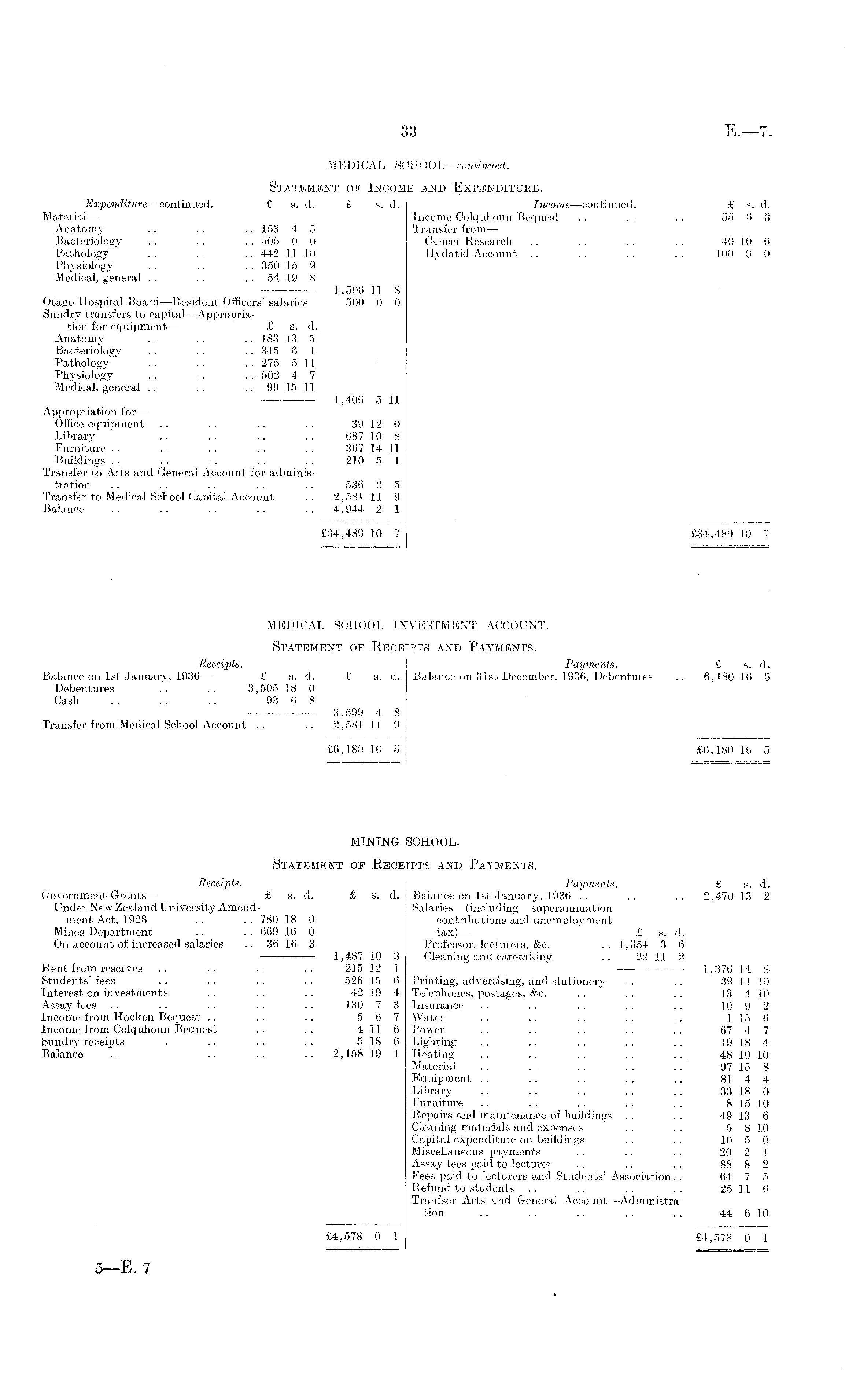 MEDICAL SCHOOL—continued. Statement op Income and Expenditure. Expenditure—continued. £ s. d. £ s. d. Income—continued. £ s. d. Material — Income Colquhoun Bequest . . .. .. 55 6 3 Anatomy .. .. . . 153 4 5 Transfer from — Bacteriology .. .. .. 505 0 0 Cancer Research . . . . . . .. 40 10 6 Pathology .. .. . . 442 11 10 Hydatid Account .. .. .. . . 100 0 O Physiology .. . . . . 350 15 9 Medical, general . . .. . . 54 19 8 - 1,506 11 8 Otago Hospital Board —Resident Officers' salaries 500 0 0 Sundry transfers to capital—Appropriation for equipment— £ s. d. Anatomy .. .. .. 183 13 5 Bacteriology . . .. .. 345 6 1 Pathology " .. . . .. 275 5 11 Physiology .. . . .. 502 4 7 Medical, general .. .. 99 15 11 1,406 5 11 Appropriation for — Office equipment .. .. . . .. 39 12 0 Library . . .. . . . . 687 10 8 Furniture.. .. .. .. .. 367 14 11 Buildings . . .. . . . . . . 210 5 1 Transfer to Arts and General Account for administration .. .. .. .. .. 536 2 5 Transfer to Medical School Capital Account .. 2,581 11 9 Balance .. .. .. .. .. 4,944 2 1 £34,489 10 7 £34,489 10 7 MEDICAL SCHOOL INVESTMENT ACCOUNT. Statement op Receipts and Payments. Receipts. Payments. £ s. d. Balance on Ist January, 1936 — £ s. d. £ s. d. Balance on 31st December, 1936, Debentures .. 6,180 16 5' Debentures .. .. 3,505 18 0 Cash ...... 93 6 8 3,599 4 8 Transfer from Medical School Account .. .. 2,581 11 9 £6,180 16 5 £6,180 16 5 MINING SCHOOL. Statement op Receipts and Payments. Receipts. Payments. £ s. d. Government Grants — £ s. d. £ s. d. Balance on Ist January, 1936 .. .. .. 2,470 13 2 Under New Zealand University Amend- Salaries (including superannuation ment Act, 1928 .. .. 780 18 0 contributions and unemployment Mines Department .. .. 669 16 0 tax) — £ s. d. On account of increased salaries .. 36 16 3 Professor, lecturers, &c. .. 1,354 3 6 1,487 10 3 Cleaning and caretaking . . 22 11 2 Rent from reserves .. .. .. .. 215 12 1 — 1,376 14 8 Students' fees .. . . .. .. 526 15 6 Printing, advertising, and stationery .. .. 39 11 10 Interest on investments .. . . .. 42 19 4 Telephones, postages, &c. .. . . .. 13 4 10 Assay fees .. .. .. .. .. 130 7 3 Insurance .. .. .. . . . . 10 9 2 Income from Hocken Bequest .. .. .. 5 6 7 Water .. .. . . . . .. 1 15 6 Income from Colquhoun Bequest . . .. 4 116 Power .. . . .. .. .. 67 4 7 Sundry receipts . .. .. .. 5 18 6 Lighting .. .. .. .. .. 19 18 4 Balance .. .. .. .. 2,158 19 1 Heating .. .. .. .. .. 48 10 10 Material .. .. .. . . .. 97 15 8 Equipment .. .. .. . . .. 81 4 4 Library .. .. .. . . .. 33 18 0 Furniture .. .. .. .. .. 815 10 Repairs and maintenance of buildings .. .. 49 13 6 Cleaning-materials and expenses .. .. 5 8 10 Capital expenditure on buildings .. .. 10 5 0 Miscellaneous payments .. .. .. 20 2 1 Assay fees paid to lecturer . . . . .. 88 8 2 Fees paid to lecturers and Students' Association. . 64 7 5 Refund to students .. . . .. .. 25 11 6 Tranfser Arts and General Account —Administration .. .. .. .. .. 44 6 10 £4,578 0 1 £4,578 0 1