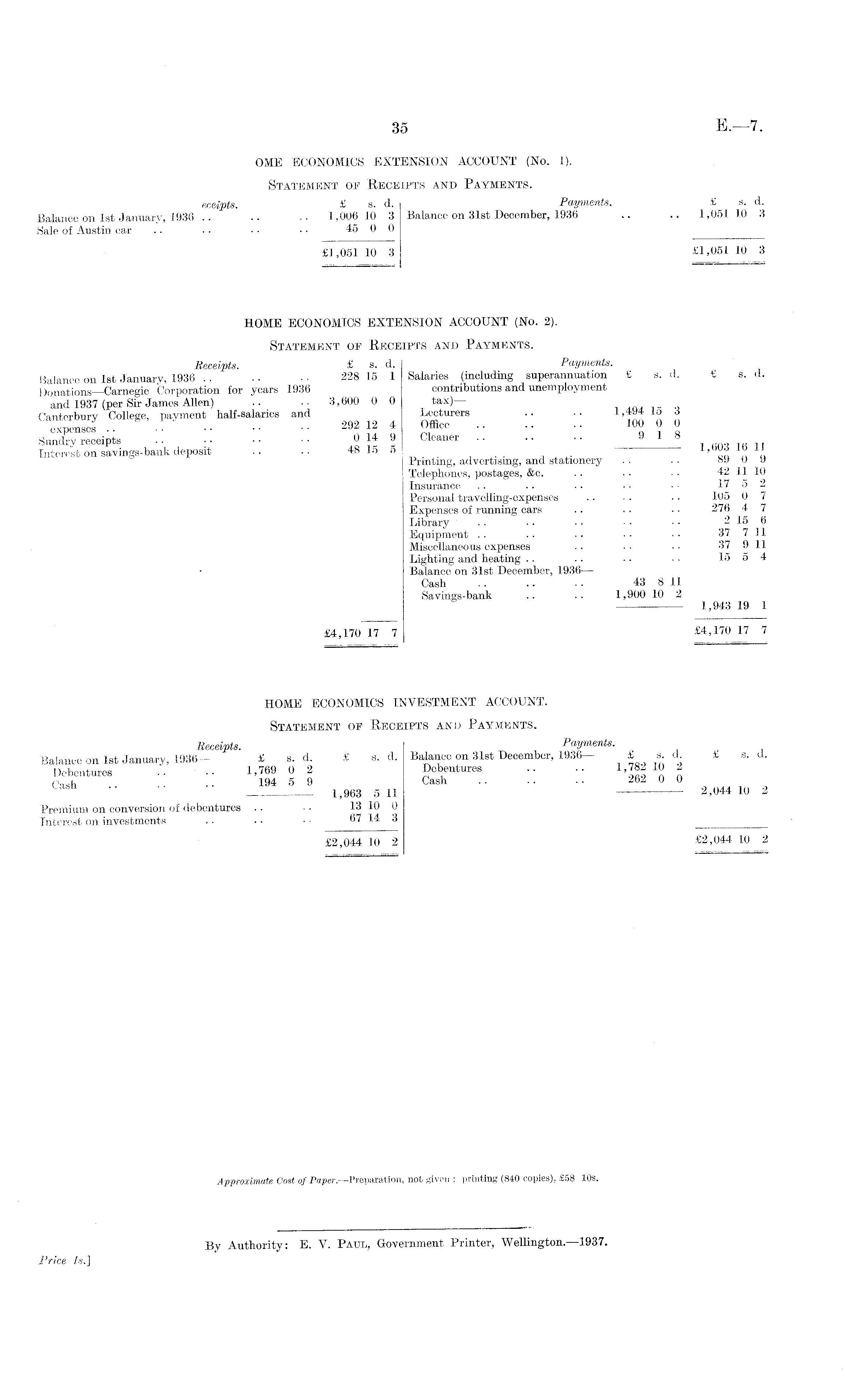 OME ECONOMICS EXTENSION ACCOUNT (No. 1). Statement op Receipts and Payments. eceipts. £ s. d. Payments. £ s. d. Balance on Ist January, 1936 .. .. .. 1,006 10 3 Balance on 31st December, 1936 .. .. 1,051 10 3 Sale of Austin car .. .. • • • • 45 0 0 £1,051 10 3 £1,051 10 3 HOME ECONOMICS EXTENSION ACCOUNT (No. 2). Statement of Receipts and Payments. Receipts. £ s. d. Payments. Balance on Ist January, 1936 .. .. ■ • 228 15 1 Salaries (including superannuation £ s. d. £ s. d. Donations —Carnegie Corporation for years 1936 contributions and unemployment and 1937 (per Sir James Allen) .. 3,600 0 0 tax) Canterbury College, payment half-salaries and turera " " I ',* „ „ expenses 292 12 4 Office 100 0 0 Sundry receipts 014 9 Cleaner 9 18 Interest on savings-bank deposit .. . • 48 15 5 an no Printing, advertising, and stationery .. .. 8» 0 a Telephones, postages, &c. .. .. • ■ 42 11 10 Insurance .. ■ ■ .• • • • • 17 5 2 Personal travelling-expenses .. . • • ■ 105 0 7 Expenses of running oars .. .. • ■ 276 4 7 Library 2 15 6 Equipment .. .. .. • • • ■ 37 7 11 Miscellaneous expenses • • • • ■ • 37 9 11 Lighting and heating .. .. • • • • 15 5 4 Balance on 31st December, 1936 — Cash .. .. • ■ 43 8 11 Savings-bank .. .. 1,900 10 2 1,943 19 1 £4,170 17 7 £4,170 17 7 HOME ECONOMICS INVESTMENT ACCOUNT. Statement op Receipts and Payments. Receipts. Payments. Balance on Ist January, 1936- £ s. d. £ s. d. Balance on 31st December, 1936- £ s d £ s. d. Debentures .. •• 1,769 0 2 Debentures .. .. 1,782 10 2 Cash 194 5 9 Cash 262 0 0 1,963 5 11 2,044 io 2 Premium on conversion of debentures .. ■ ■ 13 10 0 Interest on investments . • • ■ • • 67 14 3 £2,044 10 2 £2,044 10 2