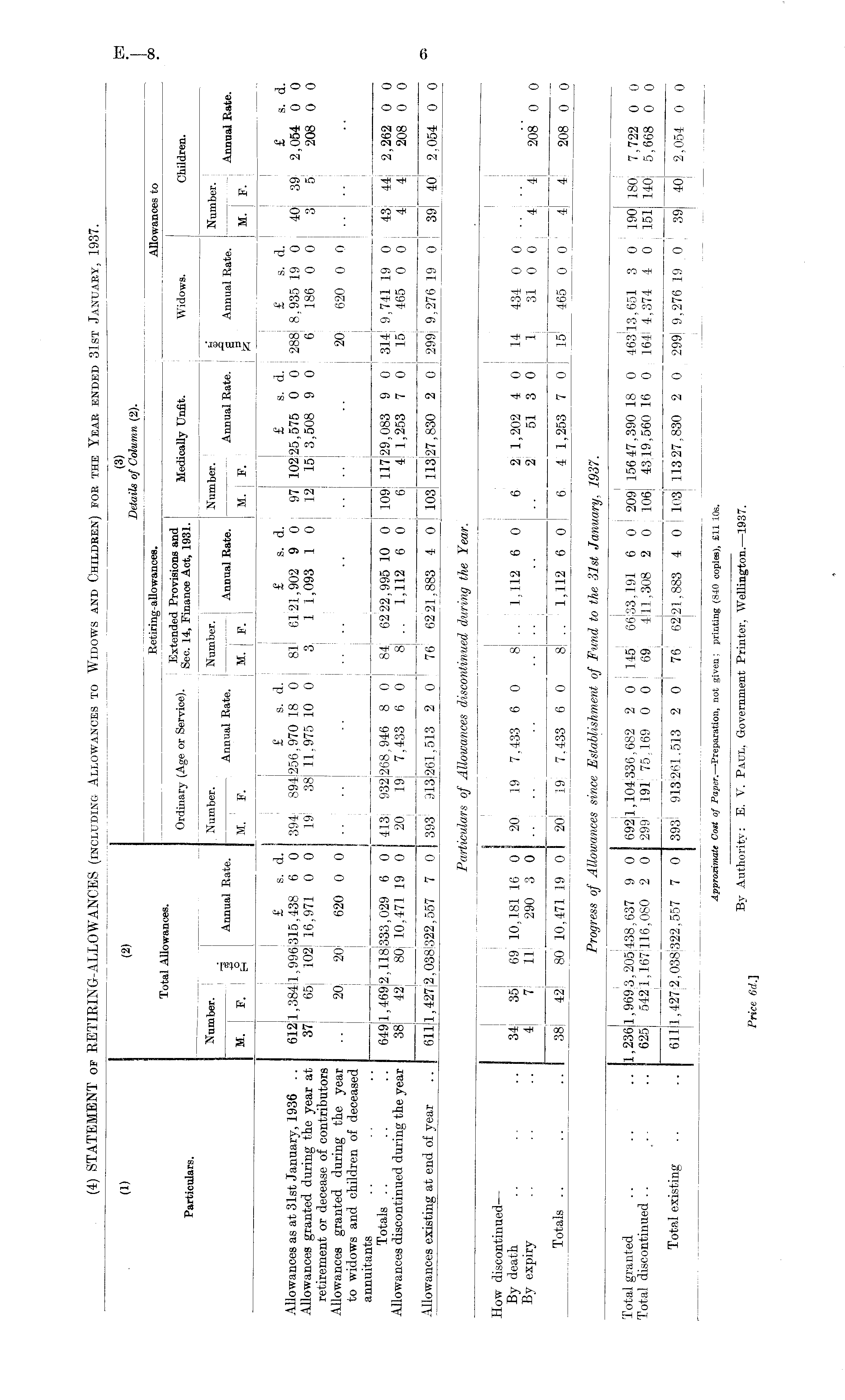 (1) /2) Details of Column (2). Retiring-allowances. Allowances to Total Allowances. ~ ~ 1 ! Particulars. Ordinary (Age or Service). Medically Unfit. Widows. Children. Number. Number. Number. Number. 33 Number. J Annual Rate. -| Annual Rate. Annual Rate. I Annual Rate. "g Annual Rate. Annual Rate. M. F. h M. I R M. F. M. F. jg j M. F. I . . . £ s. d. £ s. d. £ s. d. £ s. d. £ s. d. £ s. d. Allowances as at 31st January, 1936 .. 6121,3841,996315,438 6 0 394: 894 256,970 18 0 81 9 0 97 10225,575 0 0 288 8,935 19 0 40 39 2,054 0 0 Allowances granted during the year at 37 65 102 16,971 0 0 19| 38 11,975 10 0 3 1 1,093 1 0 12 15 3,508 9 0 6 186 0 0 3 5 208 0 0 retirement or decease of contributors Allowances granted during the year .. 20 20 620 0 0.... .. .... .. .... .. 20 620 0 0.. to widows and children of deceased annuitants .. . . .. Totals .. .. .. 6491,4692,118333,029 6 0 413 932268,946 8 0 84 6222,995 10 0 109 11729,083 9 0 314 9,741 19 0 43 44 2,262 0 0 Allowances discontinued during the year 38 42 80 10,471 19 0 20 19 7,433 6 0 8 .. 1,112 6 0 6 4 1,253 7 0 15 465 0 0 4 4 208 0 0 Allowances existing at end of year .. 6111,4272,038322,557 7 0 393 913 261,513 2 0 76 6221,883 4 0 103 11327,830 2 0 299 9,276 19 0 39 40 2,054 0 0 Particulars of Allowances discontinued during the Year. How discontinued — By death .. .. 34 35 69 10,181 16 0 20 19 7,433 6 0 8 .J 1,112 6 0 6 2 1,202 4 0 14 434 0 0 .. By expiry .. .. .. 4 7 11 290 3 0 .. .. .. .... .. .. 2 51 3 0 1 31 0 0 4 4 208 0 0 Totals .. 38 42 80 10,471 19 0 I 20 i'.i 7.433 6 0 8 .. 1 1,112 6 0 6 4 1,253 7 0 15 465 0 0 4 4 208 0 "Ō Progress of Allowances since Establishment of Fund to the 31st January, 1937. Total granted .. .. .. 1,2361,9693,205438,637 9 0 6921,104336,682 2 0 145 ! 6633,191 6 0 209 15647,390 18 0 46313,651 3 0 190 180 7 722 0 0 Total discontinued .. .. 625 5421,167116,080 2 0 299 191 75,169 0 0 69 411,308 2 0 106 4319,560 16 0:164 4,374 4 0 151 140 0 0 Total existing .. .. 6111,4272,038322,557 7 0 393 913261,513 2 0 76 : 6221,883 4 0 103 11327,830 2 0 j 299 9,276 19 0 39 40 2,054 0 0